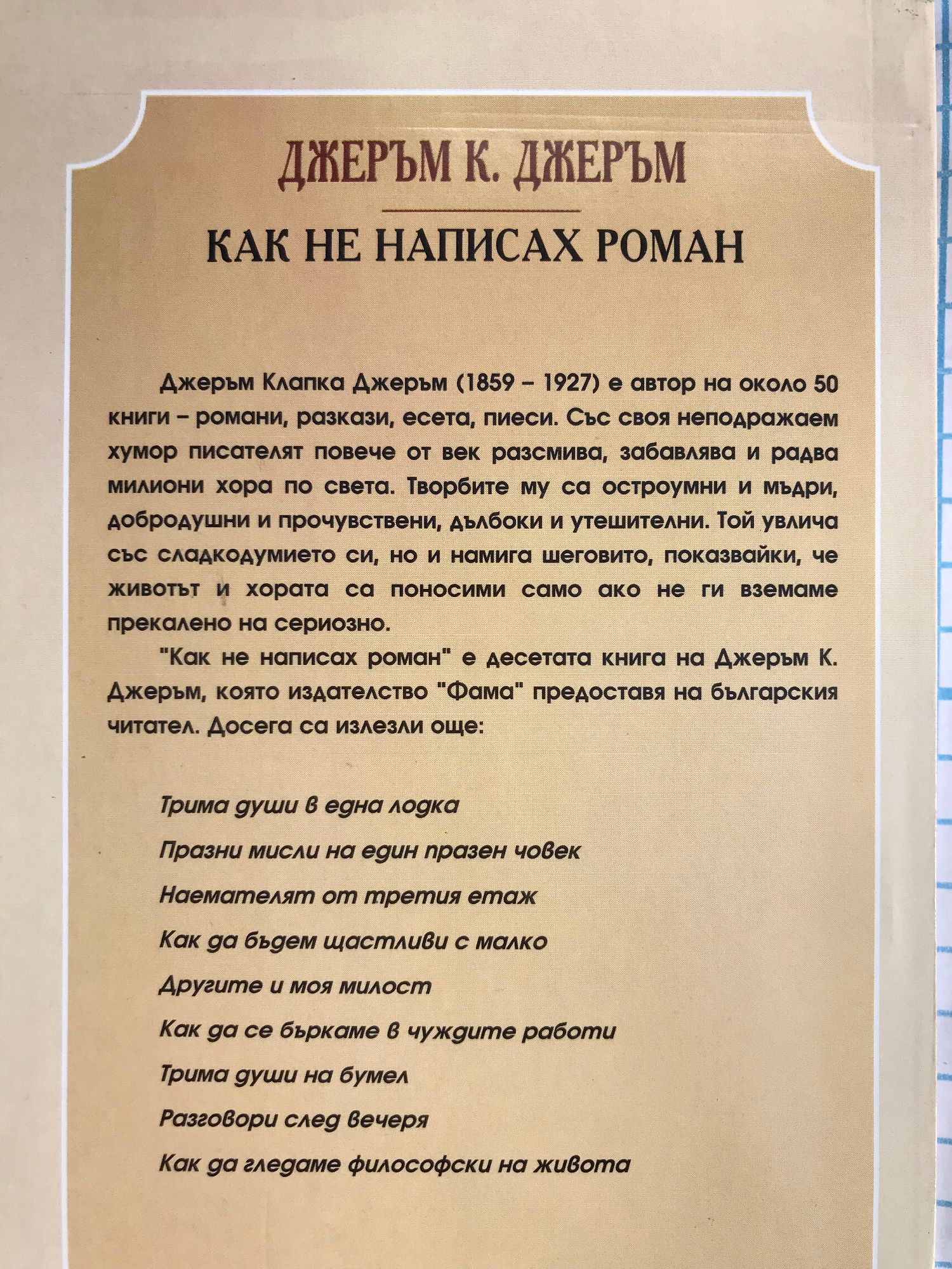 Джеръм К. Джеръм (1859-1927) е автор на около 50 книги - романи, разкази, есета, пиеси. Със своя неподражаем хумор писателят повече от век разсмива, забавлява и радва милиони хора по света. Творбите му са остроумни и мъдри, добродушни и прочувствени, дълбоки и утешителни. Той увлича със сладкодумието си, но и намига шеговито, показвайки, че животът и хората са поносими само ако не ги вземаме прекалено на сериозно. "Как не написах роман" е десетата книга на Джеръм К. Джеръм, която издателство "Фама" предоставя на българския читател.