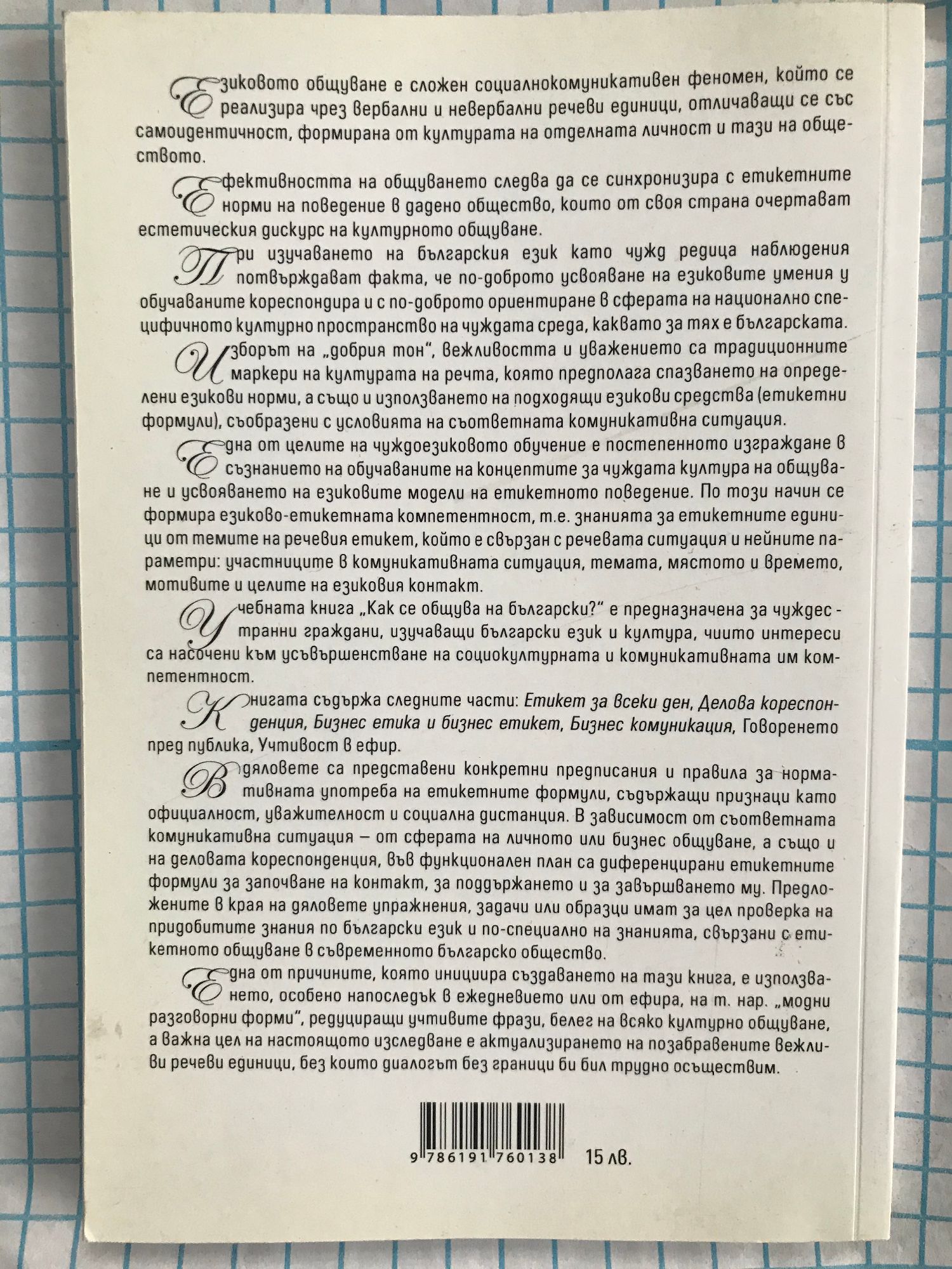 Езиковото обощуваие е сложен социалнокомуникативен феномен, който се реализира чрез вербални и невербални речеви единици, отличаващи се със самоидентичност, формирана от културата на отделната личност и тази на обществото. Ефективността на общуването следва да се синхронизира с етикетните норми на поведение в дадено общество, които от своя страна очертават естетическия дискурс на културното общуване. При изучаването на българския език като чужд редица наблюдения потвърждават факта, че по-доброто усвояване на езиковите умения у обучаваните кореспондира и с по-доброто ориентиране в сферата на национално специфичното културно пространство на чуждата среда, каквато за тях е българската. сборът на „добрия тон", вежливостта и уважението са традиционните маркери на културата на речта, която предполага спазването на определени езикови норми, а също и използването на подходящи езикови средства (етикетни формули), съобразени с условията на съответната комуникативна ситуация. Една от целите на чуждоезиковото обучение е постепенното изграждане в съзнанието на обучаваните на концептите за чуждата култура на общуване и усвояването на езиковите модели на етикетното поведение. По този начин се формира езиково-етикетната компетентност, т.е. знанията за етикетните единици от темите на речевия етикет, който е свързан с речевата ситуация и нейните параметри: участниците в комуникативната ситуация, темата, мястото и времето, мотивите и целите на езиковия контакт.