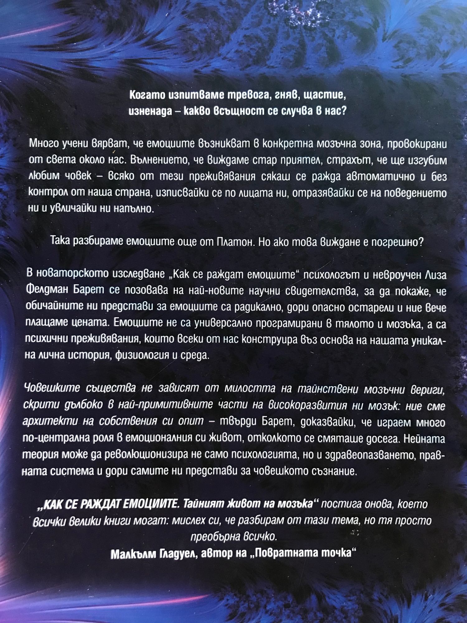 Когато изпитваме тревога, гняв, щастие, изненада – какво всъщност се случва в нас? Много учени вярват, че емоциите възникват в конкретна мозъчна зона, провокирани от света около нас. Вълнението, че виждаме стар приятел, страхът, че ще изгубим любим човек – всяко от тези преживявания сякаш се ражда автоматично и без контрол от наша страна, изписвайки се по лицата ни, отразявайки се на поведението ни и увличайки ни напълно. Така разбираме емоциите още от Платон. Но ако това виждане е погрешно? В новаторското изследване „Как се раждат емоциите“ психологът и невроучен Лиза Фелдман Барет се позовава на най-новите научни свидетелства, за да покаже, че обичайните ни представи за емоциите са радикално, дори опасно остарели и ние вече плащаме цената. Емоциите не са универсално програмирани в тялото и мозъка, а са психични преживявания, които всеки от нас конструира въз основа на нашата уникална лична история, физиология и среда. Човешките същества не зависят от милостта на тайнствени мозъчни вериги, скрити дълбоко в най-примитивните части на високоразвития ни мозък: ние сме архитекти на собствения си опит – твърди Барет, доказвайки, че играем много по-централна роля в емоционалния си живот, отколкото се смяташе досега. Нейната теория може да революционизира не само психологията, но и здравеопазването, правната система и дори самите ни представи за човешкото съзнание. „КАК СЕ РАЖДАТ ЕМОЦИИТЕ. Тайният живот на мозъка“ постига онова, което всички велики книги могат: мислех си, че разбирам от тази тема, но тя просто преобърна всичко. Малкълм Гладуел, автор на „Повратната точка“