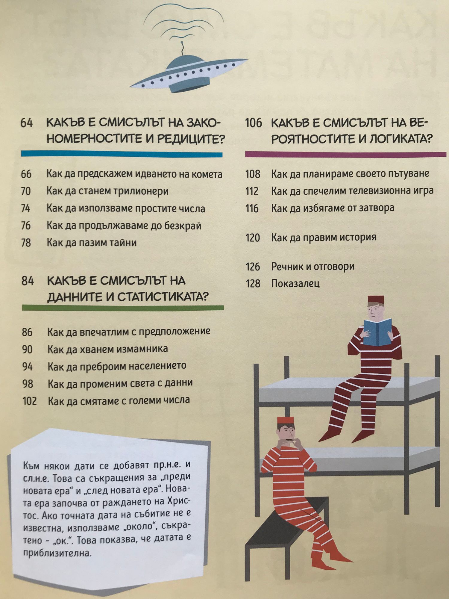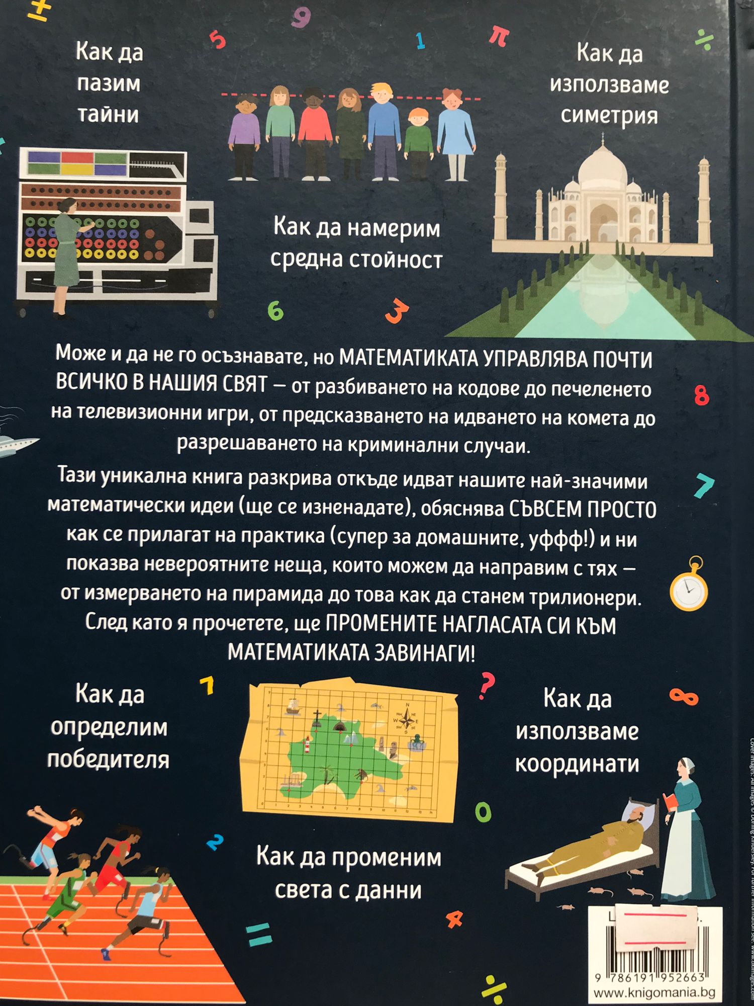 Може и да не го осъзнавате, но МАТЕМАТИКАТА УПРАВЛЯВА ПОЧТИ ВСИЧКО В НАШИЯ СВЯТ - от разбиването на кодове до печеленето на телевизионни игри, от предсказването на идването на комета до разрешаването на криминални случаи. Тази уникална книга разкрива откъде идват нашите най-значими математически идеи (ще се изненадате), обяснява СЪВСЕМ ПРОСТО как се прилагат на практика (супер за домашните, уффф!) и ни показва невероятните неща, които можем да направим с тях – от измерването на пирамида до това как да станем трилионери. След като я прочетете, ще ПРОМЕНИТЕ НАГЛАСАТА СИ КЪМ МАТЕМАТИКАТА ЗАВИНАГИ! - Как да определим времето - Как да станем трилионери - Как да спечелим телевизионна игра - Как да разберем отрицателните числа - Как да предскажем идването на комета - Как да впечатлим с предположение - Как да пазим тайни - Как да използваме симетрия - Как да намерим средна стойност - Как да определим победителя - Как да променим света с данни - Как да използваме координати