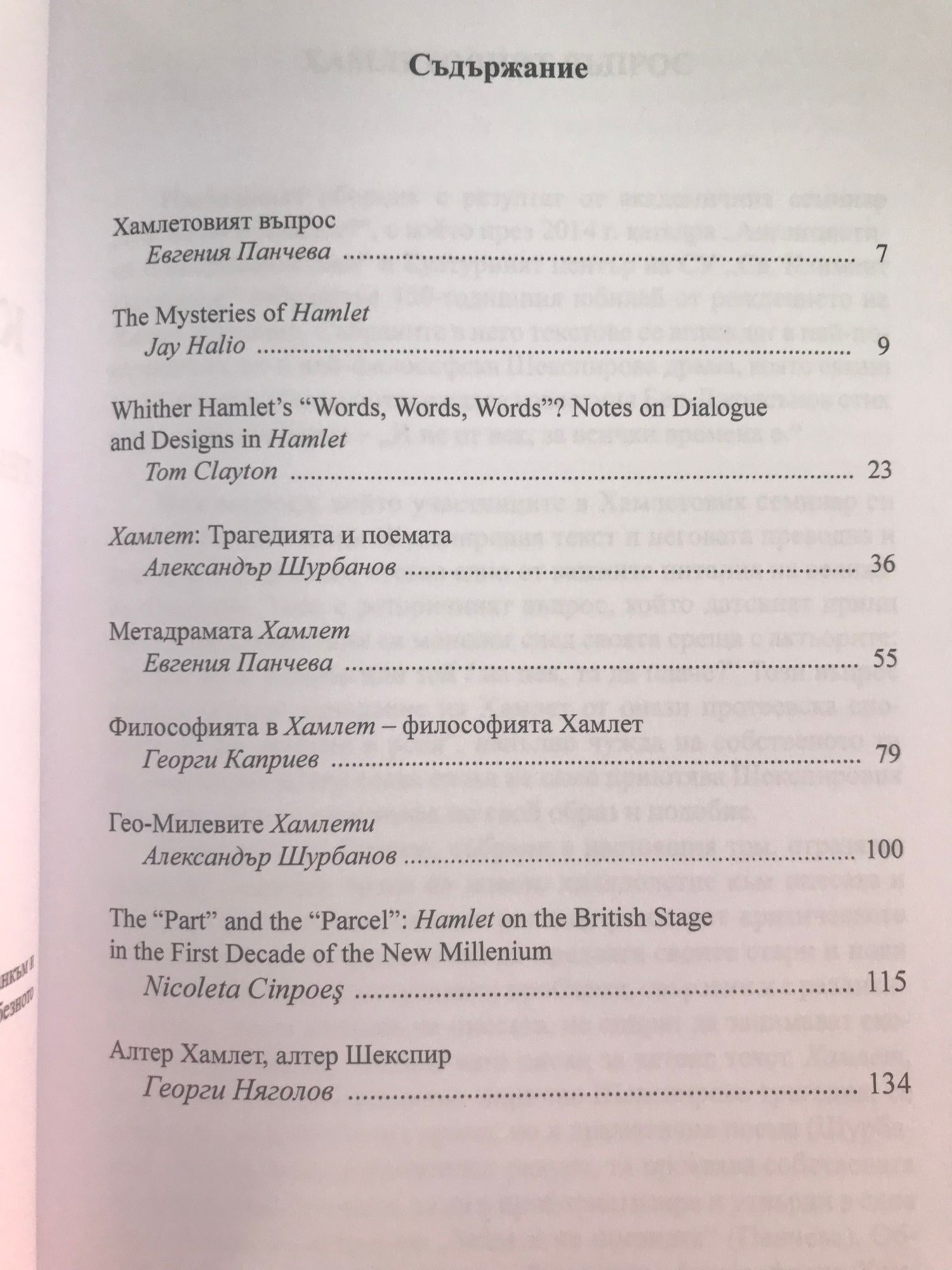 Настоящият сборник е резултат от академичния семинар "Какъв ни е Хамлет?", с който през 2014 г. катедра "Англицистика и американистика" и Културният център към СУ "Св. Климент Охридски" отбелязаха 450-годишния юбилей от рождението на Уилям Шекспир. Събраните в него текстове се вглеждат в най-популярната, но и най-философска Шекспирова драма, която сякаш в най-висока степен потвърждава известния Бен-Джонсънов стих в прослава на Барда - "И не от век, за всички времена е".
