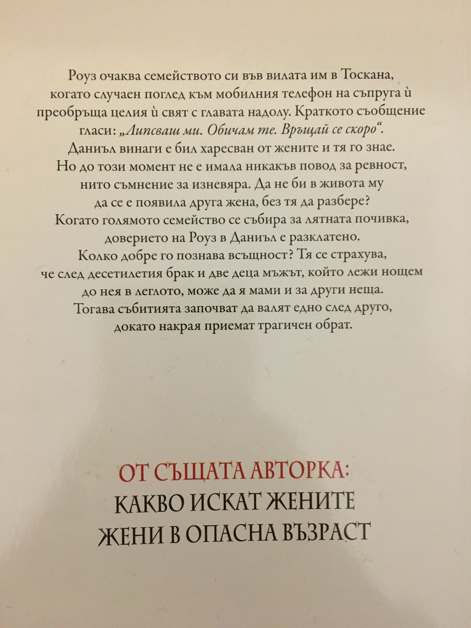 Роуз очаква семейството си във вилата им в Тоскана, когато случаен поглед към мобилния телефон на съпруга й преобръща целия й свят с главата надолу. Краткото съобщение гласи: „Липсваш ми. Обичам те. Връщай се скоро“. Даниъл винаги е бил харесван от жените и тя го знае. Но до този момент не е имала никакъв повод за ревност, нито съмнение за изневяра. Да не би в живота му да се е появила друга жена, без тя да разбере? Когато голямото семейство се събира за лятната почивка, доверието на Роуз в Даниъл е разклатено. Колко добре го познава всъщност? Тя се страхува, че след десетилетия брак и две деца мъжът, който лежи нощем до нея в леглото, може да я мами и за други неща. Тогава събитията започват да валят едно след друго, докато накрая приемат трагичен обрат.