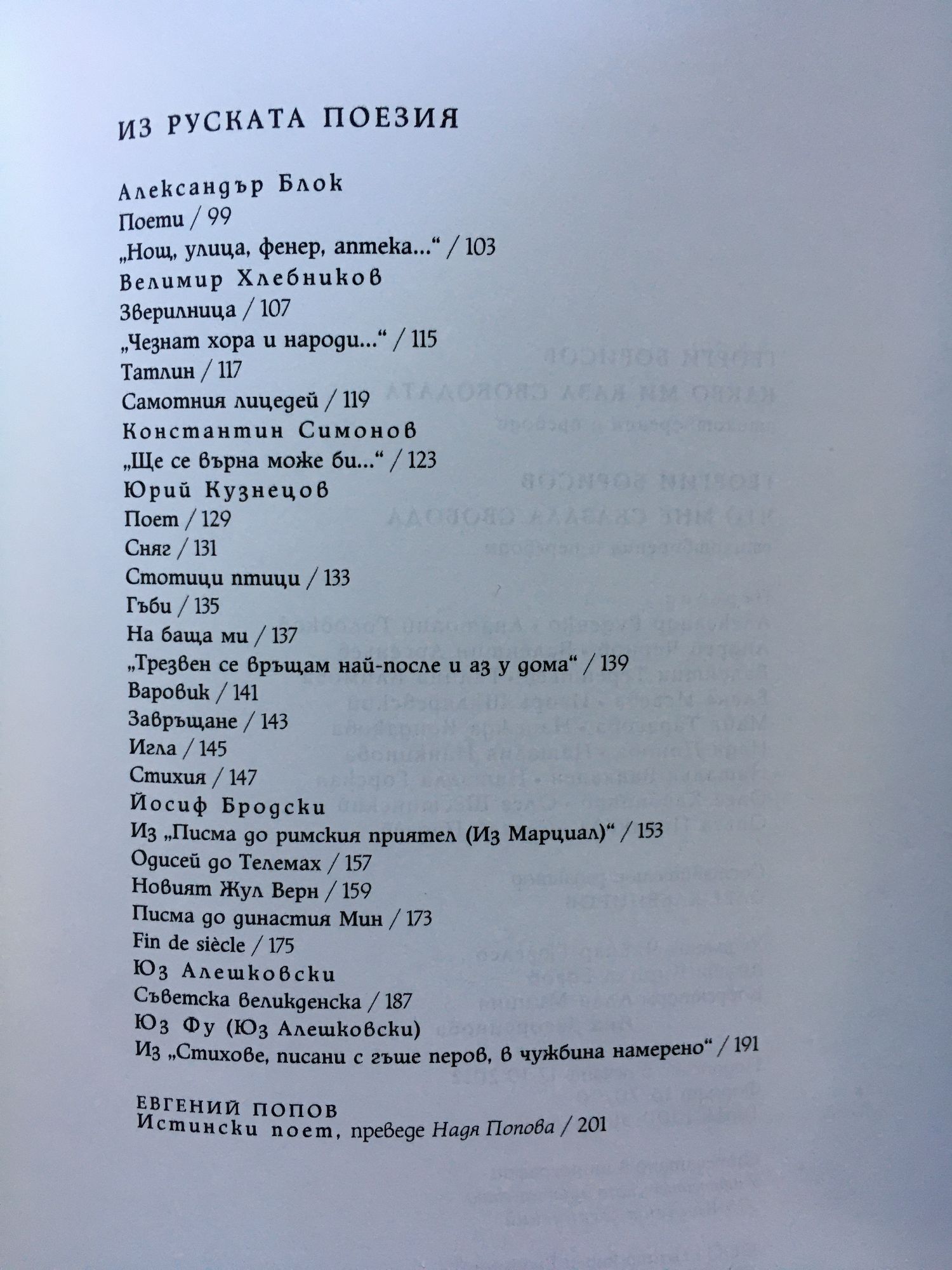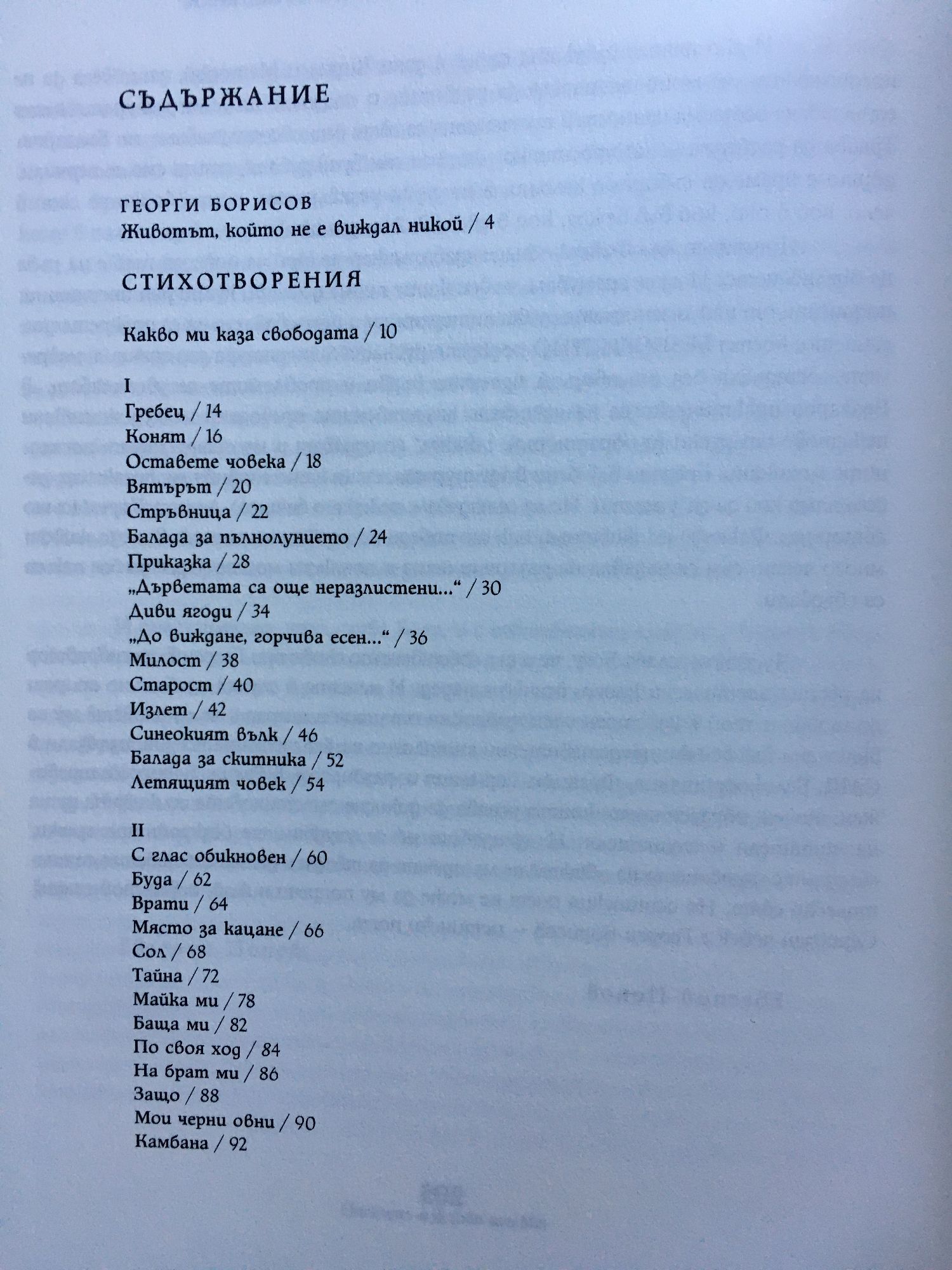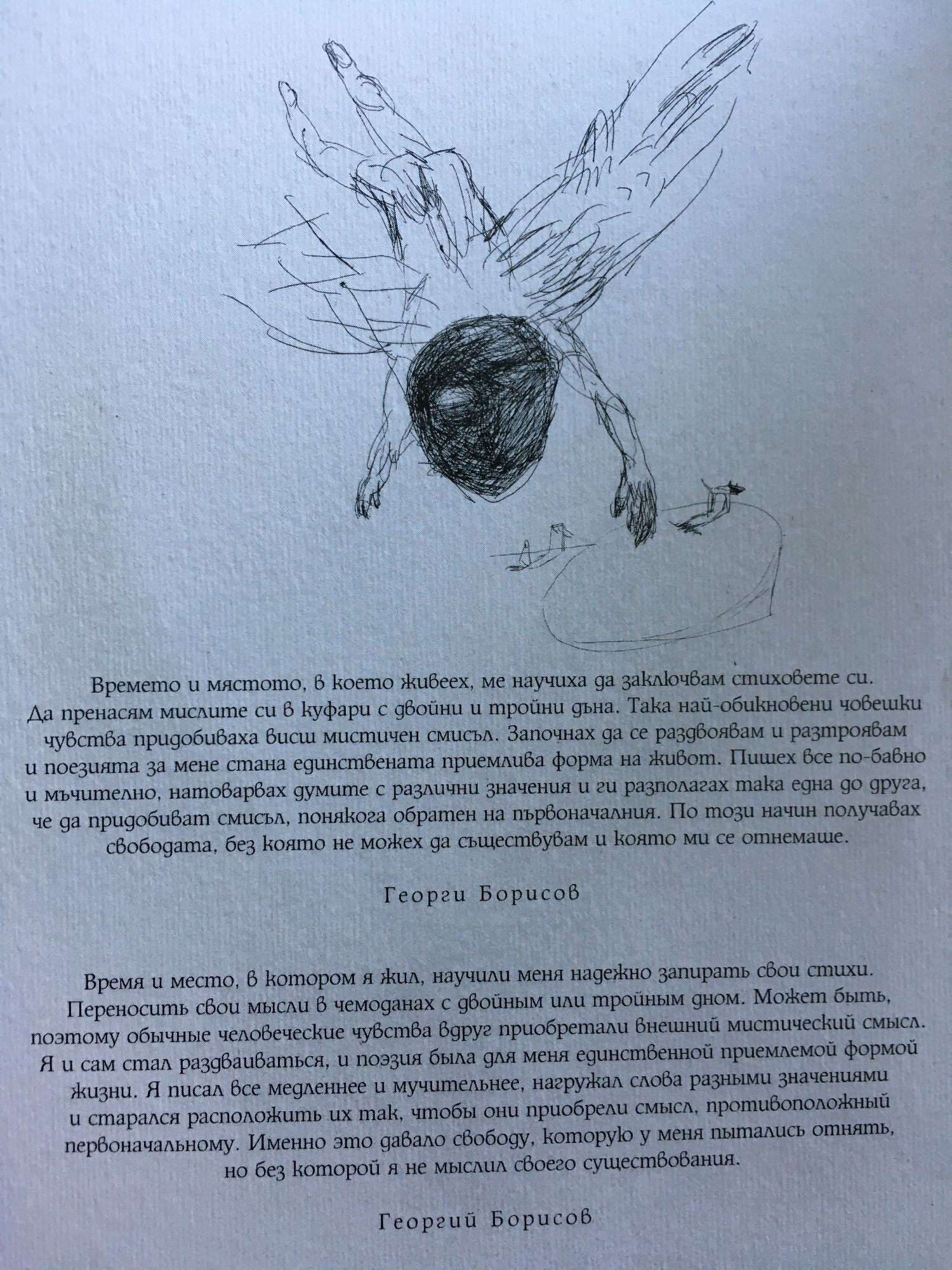 Времето и мястото, в което живеех, ме научиха да заключвам стиховете си. Да пренасям мислите си в куфари с двойни и тройни дъна. Така най-обикновени човешки чувства придобиваха висш мистичен смисъл. Започнах да се раздвоявам и разтроявам и поезията за мене стана единствената приемлива форма на живот. Пишех все по-бавно и мъчително, натоварвах думите с различни значения и ги разполагах така една до друга, че да придобиват смисъл, понякога обратен на първоначалния. По този начин получавах свободата, без която не можех да съществувам и която ми се отнемаше