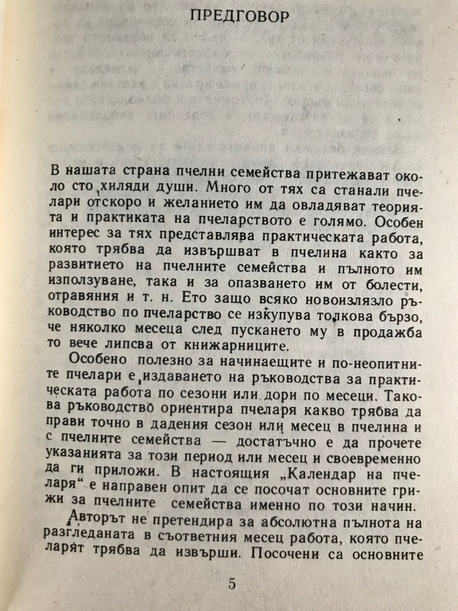 В нашата страна пчелни семейства притежават около сто хиляди души. Много от тях са станали пчелари отскоро и желанието им да овладяват теорията и практиката на пчеларството е голямо. Особен интерес за тях представлява практическата работа, която трябва да извършват в пчелина както за развитието на пчелните семейства и пълното им използуване, така и за опазването им от болести, отравяния и т.н. Ето защо всяко новоизлязло ръководство по пчеларство се изкупува толкова бързо, че няколко месеца след пускането му в продажба то вече липсва от книжарниците. Особено полезно за начинаещите и по-неопитните пчелари е издаването на ръководства за практическата работа по сезони или дори по месеци. Такова ръководство ориентира пчеларя какво трябва да прави точно в дадения сезон или месец в пчелина и с пчелните семейства – достатъчно е да прочете указанията за този период или месец и своевременно да ги приложи. В настоящия „Календар на пчеларя“ е направен опит да се посочат основните грижи за пчелните семейства именно по този начин. Авторът не претендира за абсолютна пълнота на разгледаната в съответния месец работа, която пчеларят трябва да извърши. Посочени са основните моменти, от които зависят развитието на пчелните семейства и използуването им за получаване на повече продукция от тях. Непълно са обхванати теоретичните разработки за биологичните особености на пчелата и пчелното семейство – осветлени са само онези, конто имат пряка връзка с разглеждания практически въпрос. Анатомията и физиологията въобще не се разглеждат, а отделните заболявания също са изключени.