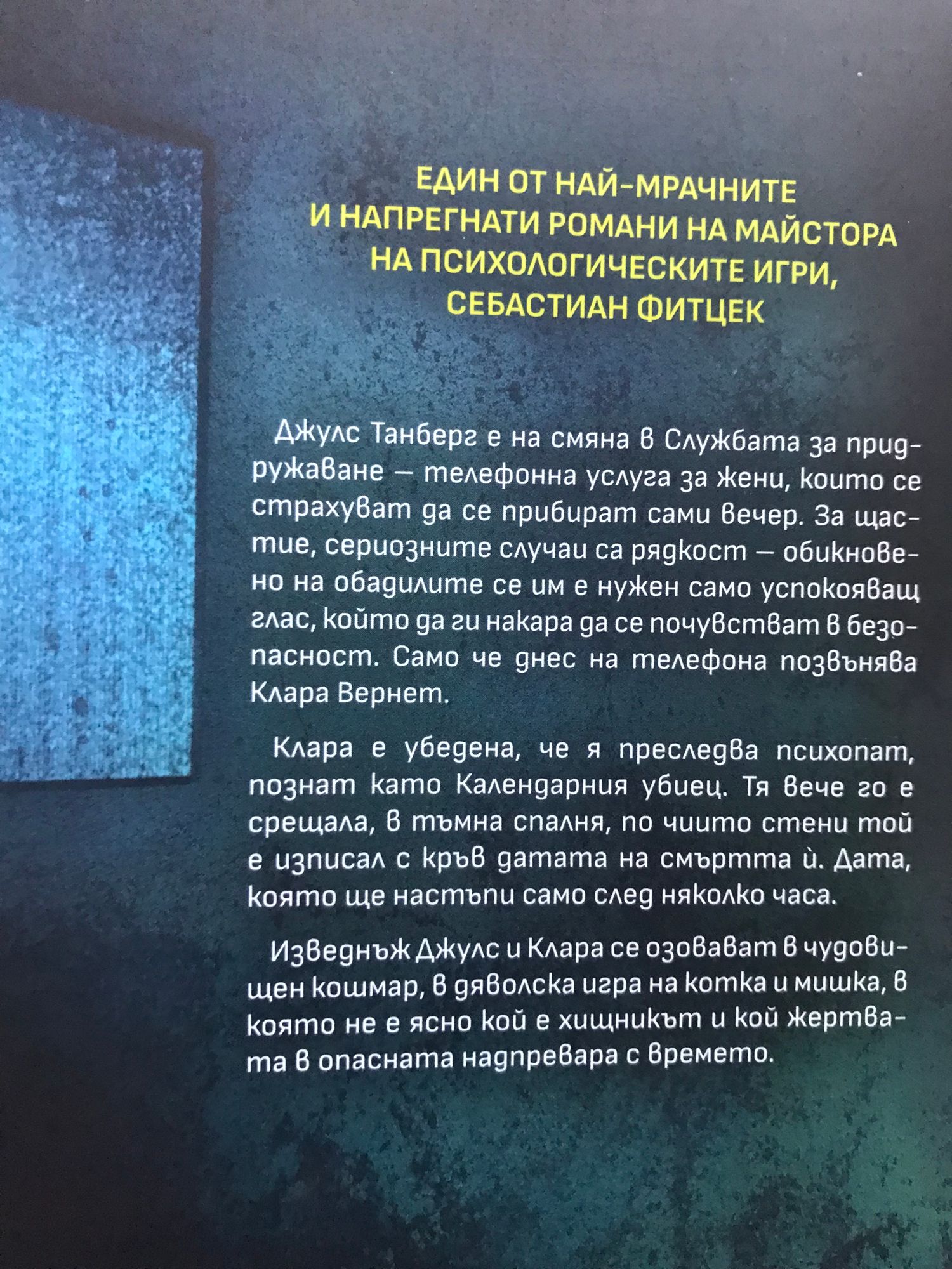 ЕДИН ОТ НАЙ-МРАЧНИТЕ И НАПРЕГНАТИ РОМАНИ НА МАЙСТОРА НА ПСИХОЛОГИЧЕСКИТЕ ИГРИ, СЕБАСТИАН ФИТЦЕК Джулс Танберг е на смяна в Службата за придружаване - телефонна услуга за жени, които се страхуват да се прибират сами вечер. За щастие, сериозните случаи са рядкост - обикновено на обадилите се им е нужен само успокояващ глас, който да ги накара да се почувстват в безопасност. Само че днес на телефона позвънява Клара Вернет. Клара е убедена, че я преследва психопат, познат като Календарния убиец. Тя вече го е срещала, в тъмна спалня, по чиито стени той е изписал с кръв датата на смъртта й. Дата, която ще настъпи само след няколко часа. Изведнъж Джулс и Клара се озовават в чудовищен кошмар, в дяволска игра на котка и мишка, в която не е ясно кой е хищникът и кой жертвата в опасната надпревара с времето.