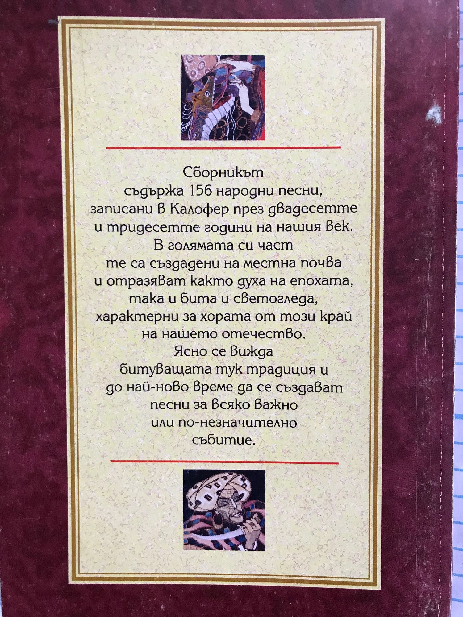 Сборника съдържа 156 народни песни, записани в Калофер през двадесетте и тридесетте години на нашия век. В голямата си част те са създадени на местна почва и отразяват както духа на епохата, така и бита и светогледа, характерни за хората от този край на нашето отечество. Ясно се вижда битуващата тук традиция и до най-ново време да се създават песни за всяко важно или по-незначително събитие.