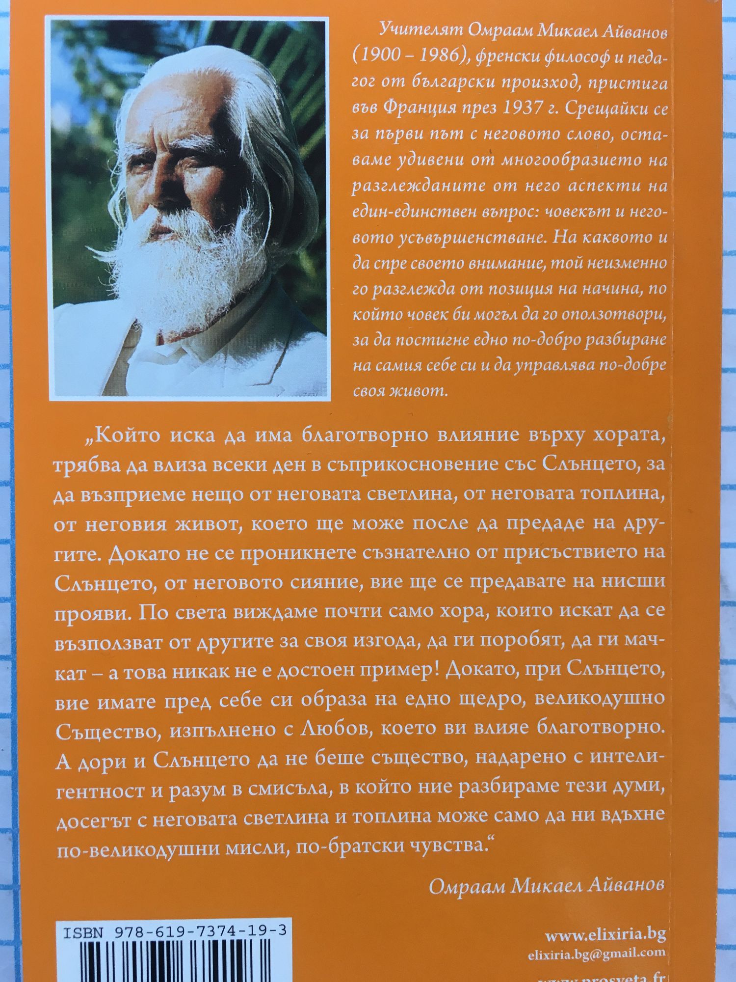 Който иска да има благотворно влияние върху хората, трябва да влиза всеки ден в съприкосновение със Слънцето, за да възприеме нещо от неговата светлина, от неговата топлина, от неговия живот, което ще може после да предаде на другите. Докато не се проникнете съзнателно от присъствието на Слънцето, от неговото сияние, вие ще се предавате на нисши прояви. По света виждаме почти само хора, които искат да се възползват от другите за своя изгода, да ги поробят, да ги мачкат - а това никак не е достоен пример! Докато, при Слънцето, вие имате пред себе си образа на едно щедро, великодушно Същество, изпълнено с Любов, което ви влияе благотворно. А дори и Слънцето да не беше същество, надарено с интелигентност и разум в смисъла, в който ние разбираме тези думи, досегът с неговата светлина и топлина може само да ни вдъхне по-великодушни мисли, по-братски чувства. /Омраам Микаел Айванов/