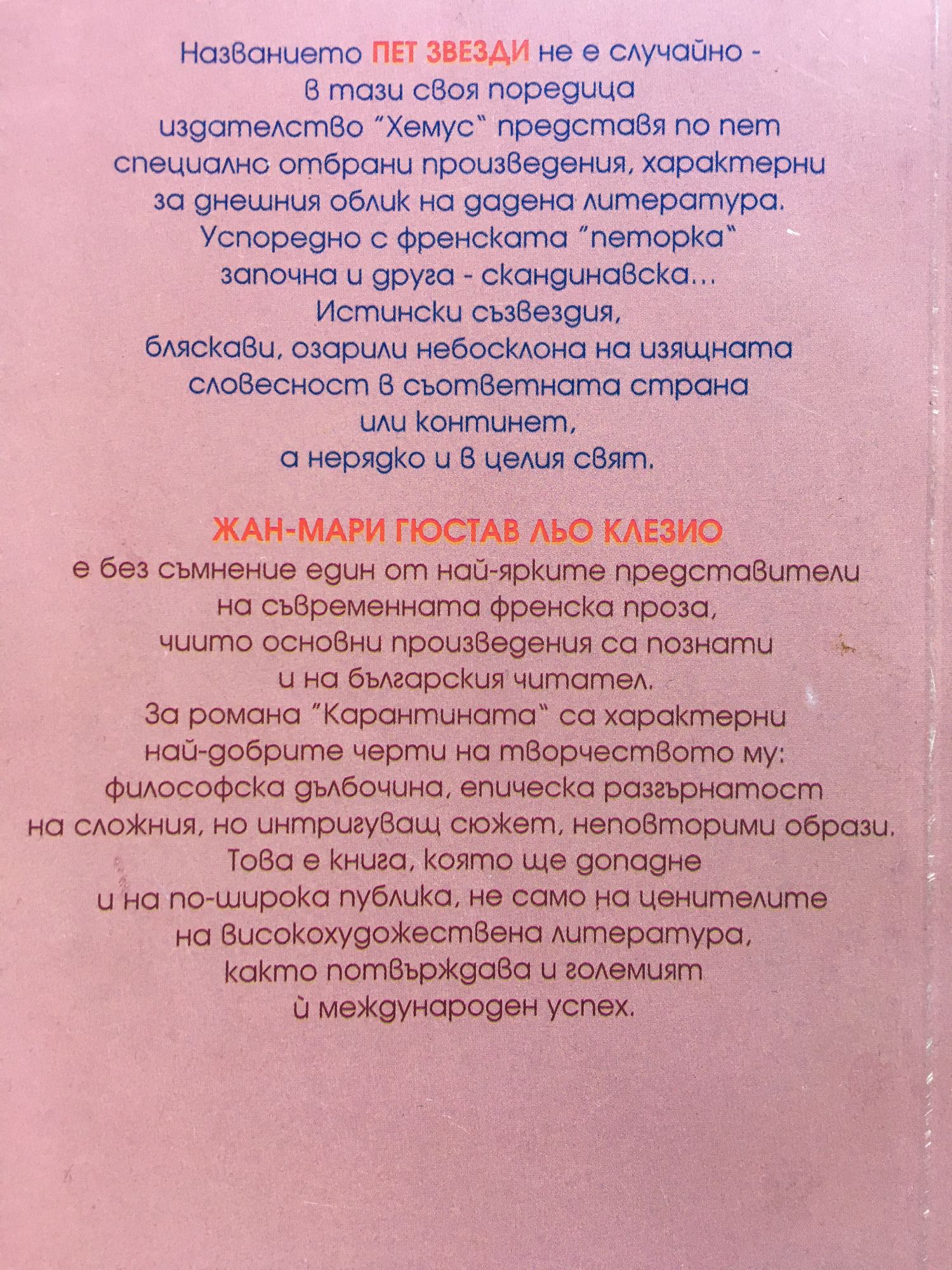Жан-Мари Гюстав льо Клезио е без съмнение един от най-ярките представители на съвременната френска проза, чиито основни произведения са познати и на българския читател. За романа "Карантината" са характерни най-добрите черти на творчеството му: философска дълбочина, епическа разгърнатост на сложния, но интригуващ сюжет, неповторими образи. Това е книга, която ще допадне и на по-широка публика, не само на ценителите на високохудожествена литература, както потвърждава и големият й международен успех.