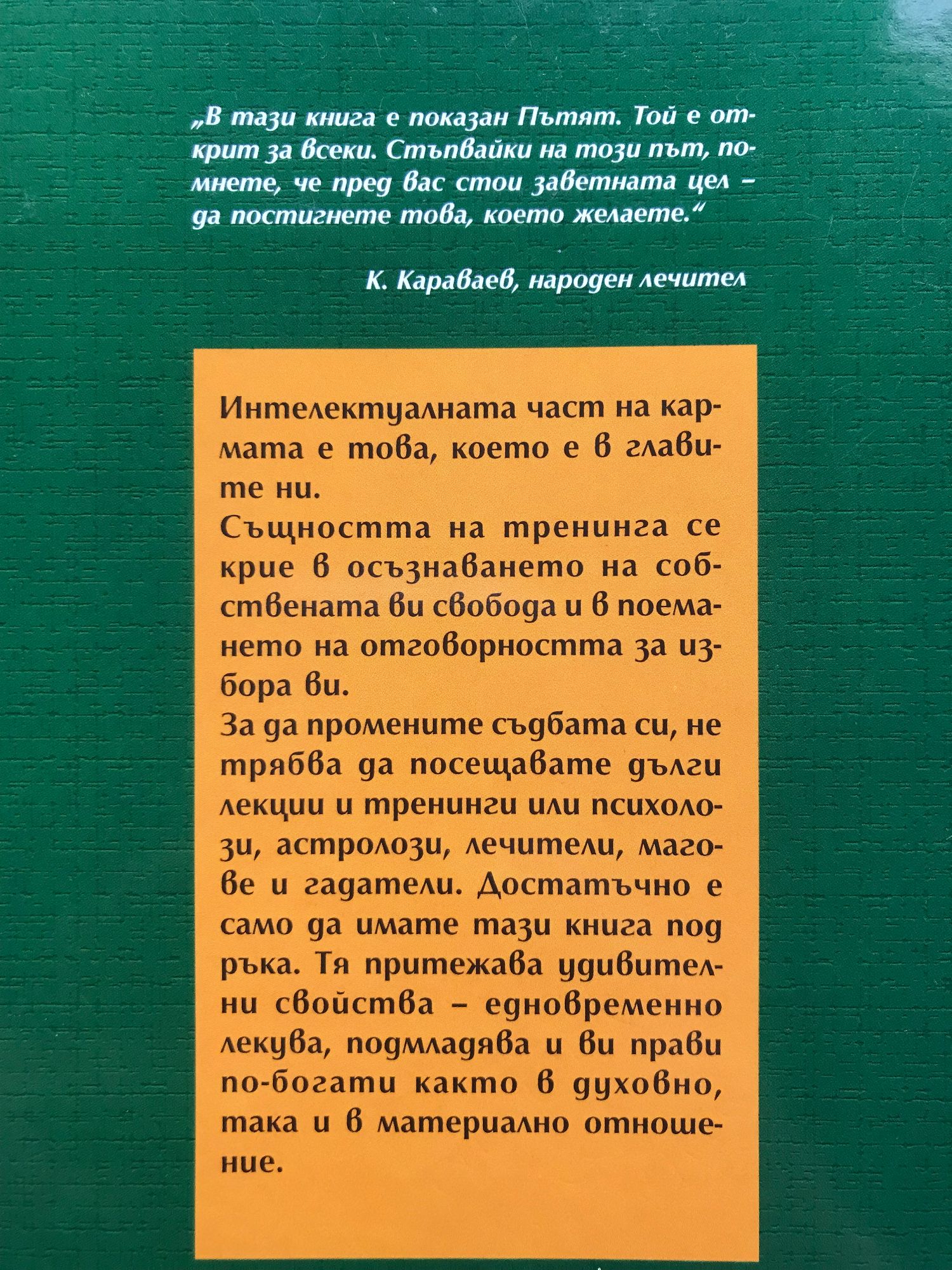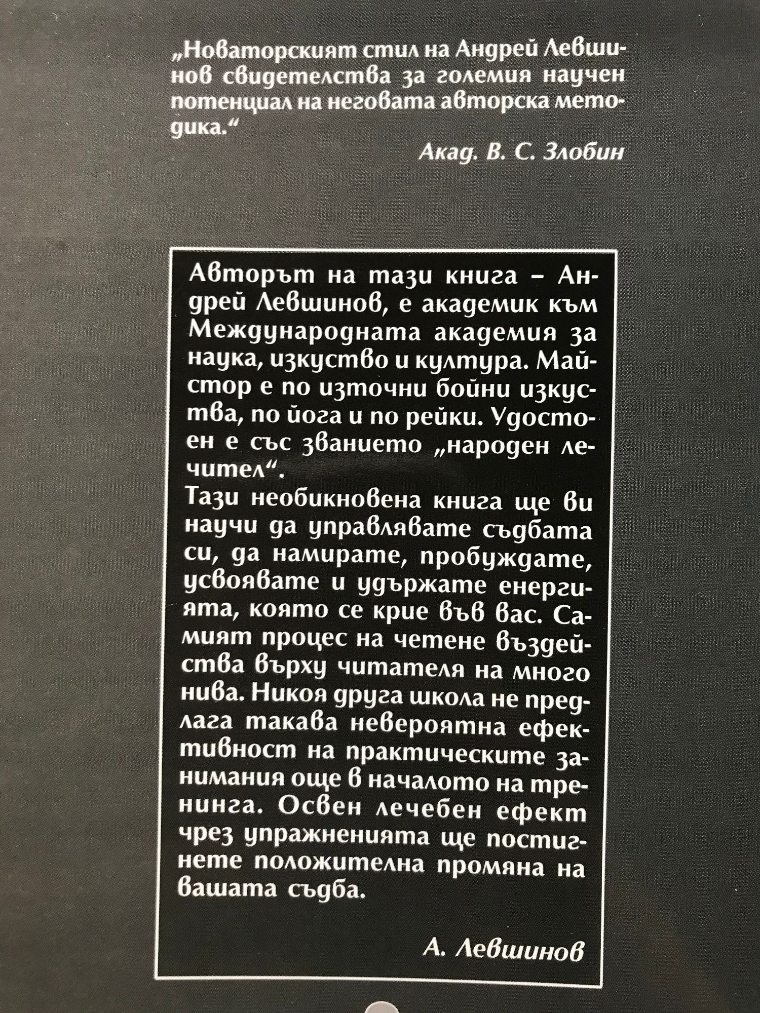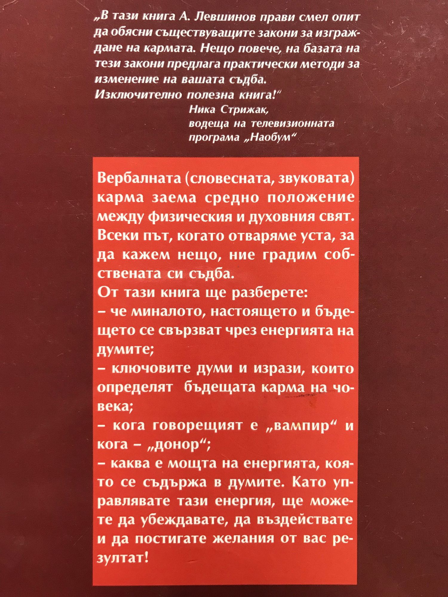 Авторът на тази книга - Андрей Левшинов, е академик към Международната академия за наука, изкуство и култура. Майстор е по източни бойни изкуства, по йога и по рейки. Удостоен е със званието "народен лечител". Тази необикновена книга ще ви научи да управлявате съдбата си, да намирате, пробуждате, усвоявате и удържате енергията, която се крие във вас. Самият процес на четене въздейства върху читателя на много нива. Никоя друга школа не предлага такава невероятна ефективност на практическите занимания още в началото на тренинга. Освен лечебен ефект чрез упражненията ще постигнете положителна промяна на вашата съдба. "В тази книга А. Левшинов прави смел опит да обясни съществуващите закони за изграждане на кармата. Нещо повече, на базата на тези закони предлага практически методи за изменение на вашата съдба. Изключително полезна книга!" Ника Стрижак, водеща на телевизионната програма "Наобум" Вербалната /словесната, звуковата/ карма заема средно положение между физическия и духовния свят. Всеки път, когато отваряме уста, за да кажем нещо, ние градим собствената си съдба. От тази книга ще разберете: - че миналото, настоящето и бъдещето се свързват чрез енергията на думите; - ключовите думи и изрази, които определят бъдещата карма на човека; - кога говорещият е "вампир" кога - "донор"; - каква е мощта на енергията, която се съдържа в думите. Като управлявате тази енергия, ще може те да убеждавате, да въздействате постигате желания от вас резултат!
