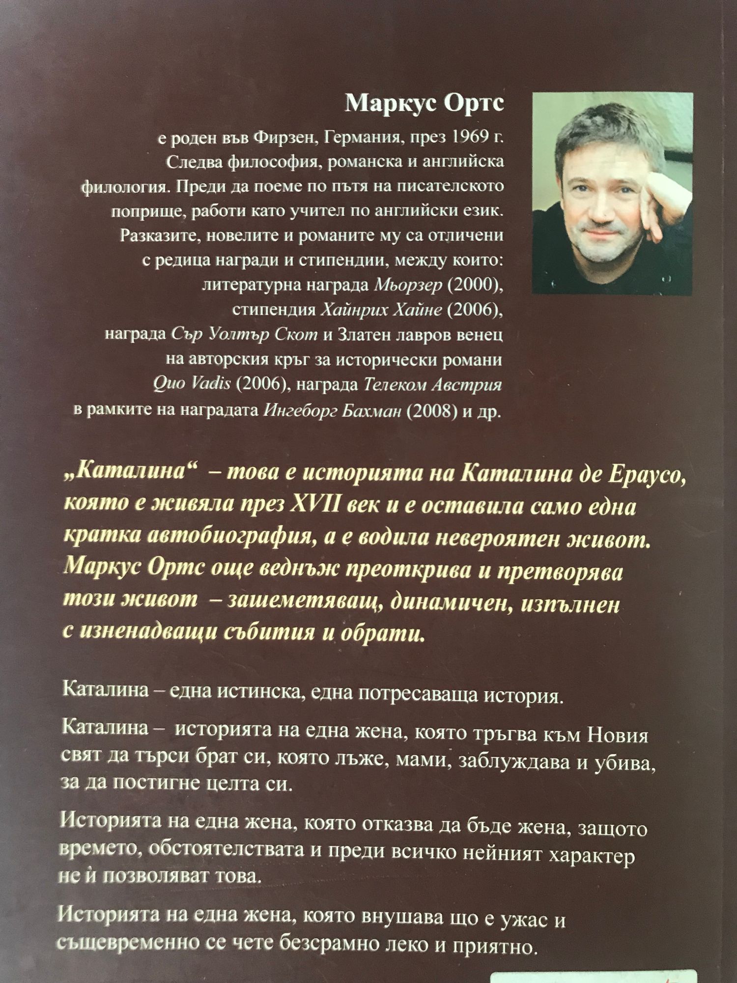 С историческия си роман „Каталина“ Маркус Ортс достига върха на своето майсторство Една спираща дъха история, едно невъобразимо житейско приключение От автора на „Камериерката“ Маркус Ортс е роден във Фирзен, Германия, през 1969 г. Следва философия, романска и английска филология. Преди да поеме по пътя на писателското поприще, работи като учител по английски език. Разказите, новелите и романите му са отличени с редица награди и стипендии, между които: литературна награда Мьорзер (2000), стипендия Хайнрих Хайне (2006), награда Сър Уолтър Скот и Златен лавров венец на авторския кръг за исторически романи Quo Vadis (2006), награда Телеком Австрия в рамките на наградата Ингеборг Бахман (2008) и др. „Каталина“: това е историята на Каталина де Ераусо, която е живяла през XVII век и е оставила само една кратка автобиография, а е водила невероятен живот. Маркус Ортс още веднъж преоткрива и претворява този живот – зашеметяващ, динамичен, изпълнен с изненадващи събития и обрати. Каталина – една истинска, една потресаваща история. Каталина – историята на една жена, която тръгва към Новия свят да търси брат си, която лъже, мами, заблуждава и убива, за да постигне целта си. Историята на една жена, която отказва да бъде жена, защото времето, обстоятелствата и преди всичко нейният характер не и позволяват това. Историята на една жена, която внушава що е ужас и същевременно се чете безсрамно леко и приятно.