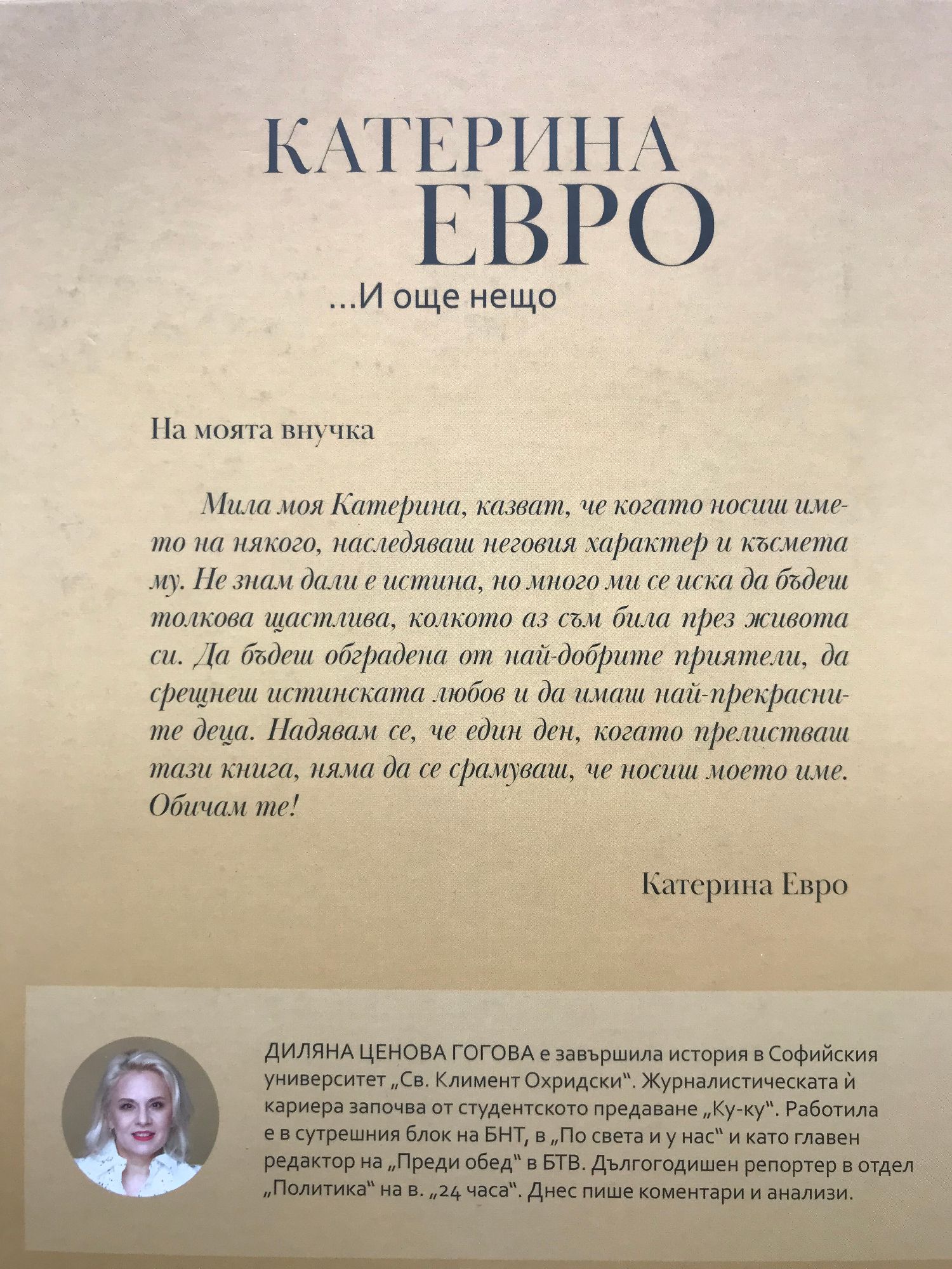 На моята внучка Мила моя Катерина, казват, че когато носиш името на някого, наследяваш неговия характер и късмета му. Не знам дали е истина, но много ми се иска да бъдеш толкова щастлива, колкото аз съм била през живота си. Да бъдеш обградена от най-добрите приятели, да срещнеш истинската любов и да имаш най-прекрасните деца. Надявам се, че един ден, когато прелистваш тази книга, няма да се срамуваш, че носиш моето име. Обичам те! Катерина Евро