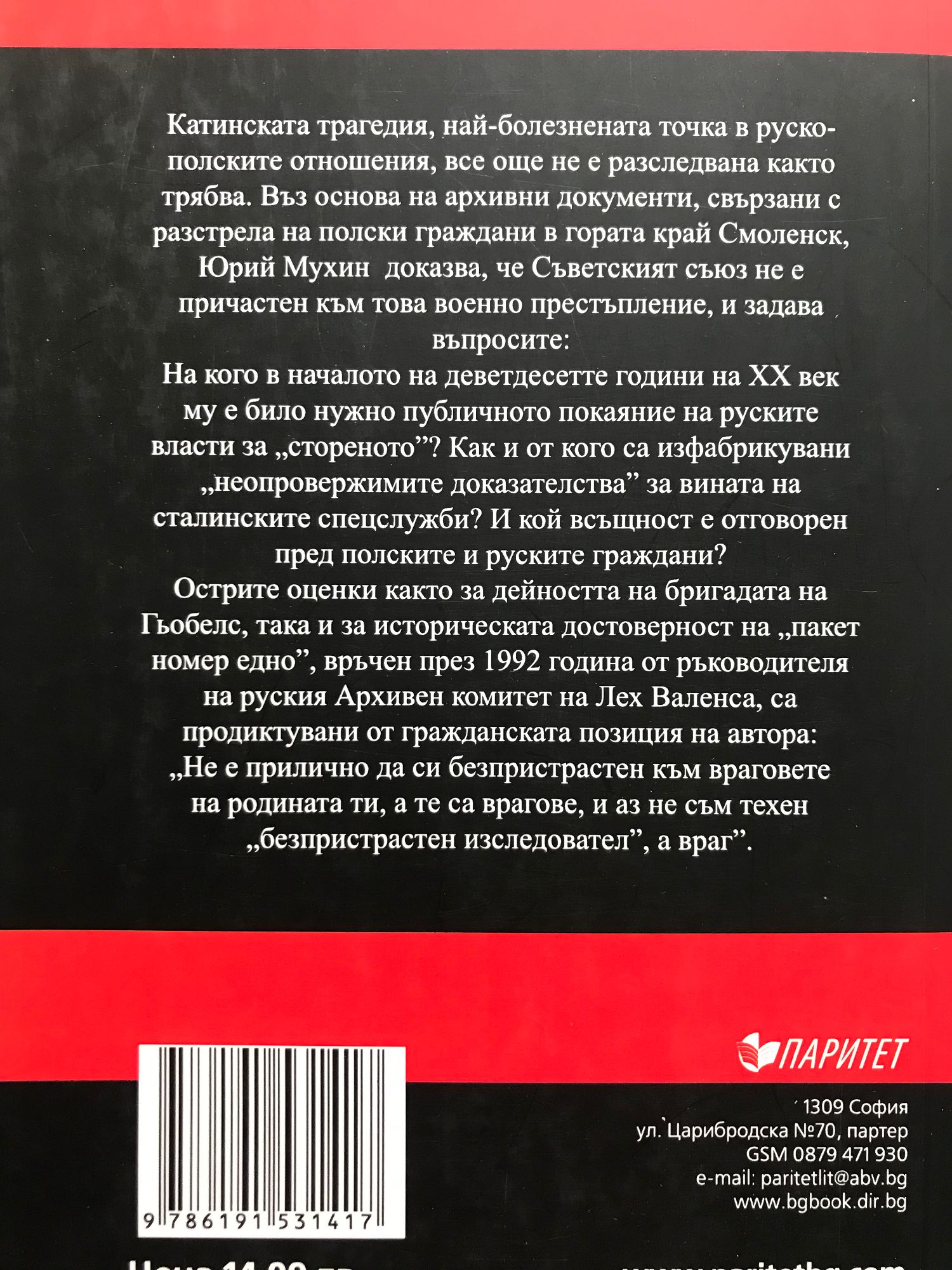 Катинската трагедия, най-болезнената точка в руско-полските отношения, все още не е разследвана както трябва. Въз основа на архивни документи, свързани с разстрела на полски граждани в гората край Смоленск, Юрий Мухин доказва, че Съветският съюз не е причастен към това военно престъпление, и задава въпросите: На кого в началото на деветдесетте години на ХХ век му е било нужно публичното покаяние на руските власти за „стореното”? Как и от кого са изфабрикувани „неопровержимите доказателства” за вината на сталинските спецслужби? И кой всъщност е отговорен пред полските и руските граждани? Острите оценки както за дейността на бригадата на Гьобелс, така и за историческата достоверност на „пакет номер едно”, връчен през 1992 година от ръководителя на руския Архивен комитет на Лех Валенса, са продиктувани от гражданската позиция на автора: „Не е прилично да си безпристрастен към враговете на родината ти, а те са врагове, и аз не съм техен „безпристрастен изследовател”, а враг”.