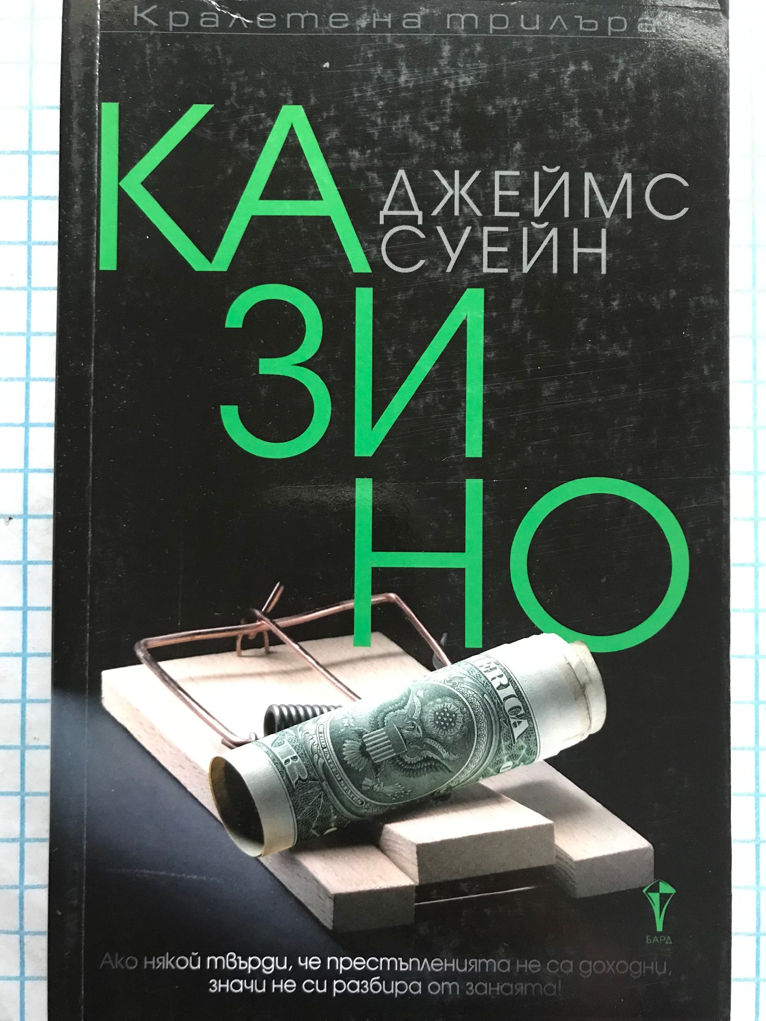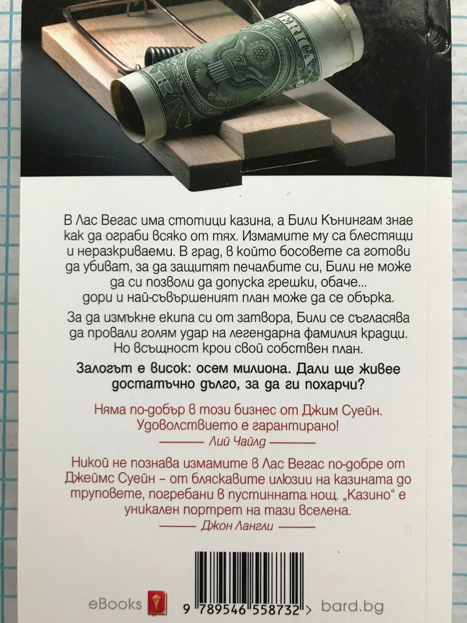 Ако някой твърди, че престъпленията не са доходни, значи не си разбира от занаята! В Лас Вегас има стотици казина, а Били Кънингам знае как да ограби всяко от тях. Измамите му са блестящи и неразкриваеми. В град, в който босовете са готови да убиват, за да защитят печалбите си, Били не може да си позволи да допуска грешки, обаче… дори и най-съвършеният план може да се обърка. За да измъкне екипа си от затвора, Били се съгласява да провали голям удар на легендарна фамилия крадци. Но всъщност крои свой собствен план. Залогът е висок: осем милиона. Дали ще живее достатъчно дълго, за да ги похарчи? Няма по-добър в този бизнес от Джим Суейн. Удоволствието е гарантирано! Лий Чайлд Никой не познава измамите в Лас Вегас по-добре от Джеймс Суейн — от бляскавите илюзии на казината до труповете, погребани в пустинната нощ. „Казино“ е уникален портрет на тази вселена. Джон Лангли