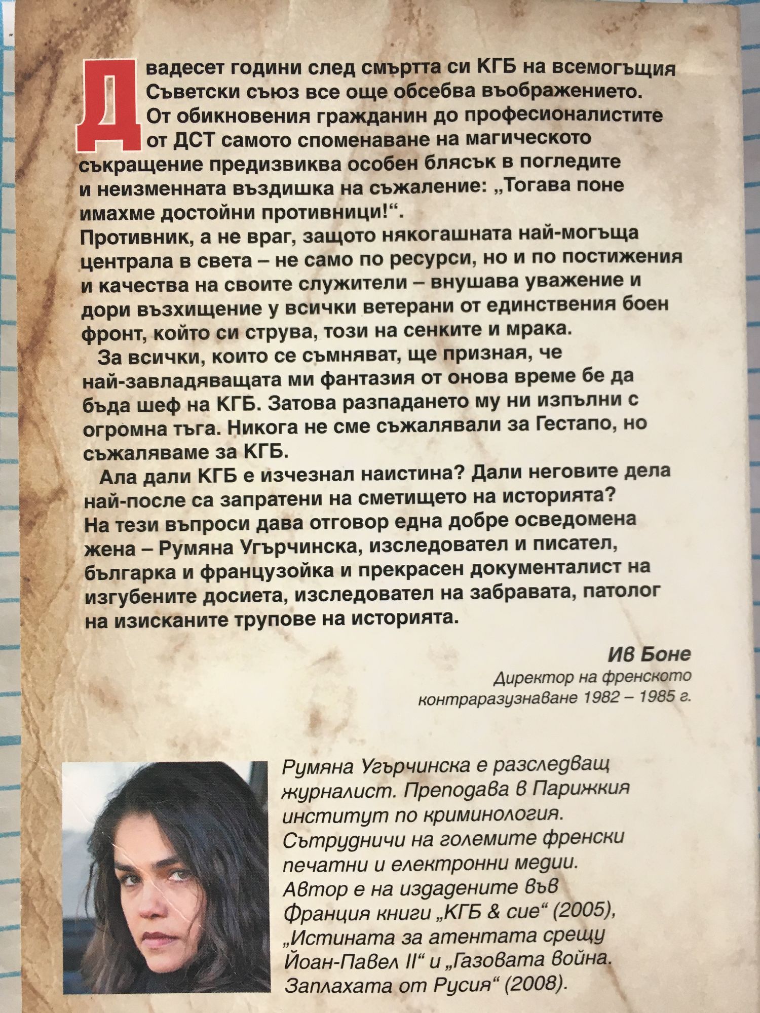 Двадесет години след смъртта си КГБ на всемогъщия Съветски съюз все още обсебвавъображението. От обикновения гражданин до професионалистите от ДСТ самото споменаване на магическото съкращение предизвиква особен блясък в погледите и неизменната въздишка на съжаление: „Тогава поне имахме достойни противници!”. Противник, а не враг, защото някогашната най-могъща централа в света – не само по ресурси, но и по постижения и качества на своите служители – внушава уважение и дори възхищение у всички ветерани от единствения боен фронт, който си струва, този на сенките и мрака. За всички, които се съмняват, ще призная, че най-завладяващата ми фантазия от онова време бе да бъда шеф на КГБ. Затова разпадането му ни изпълни с огромна тъга. Никога не сме съжалявали за Гестапо, но съжаляваме за КГБ. Ала дали КГБ е изчезнал наистина? Дали неговите дела най-после са запратени на сметището на историята? На тези въпроси дава отговор една добре осведомена жена – Румяна Угърчинска, изследовател и писател, българка и французойка и прекрасен документалист наизгубените досиета, изследовател на забравата, патолог на изисканите трупове на историята. - Ив Боне, Директор на френското контраразузнаване 1982 – 1985 г.