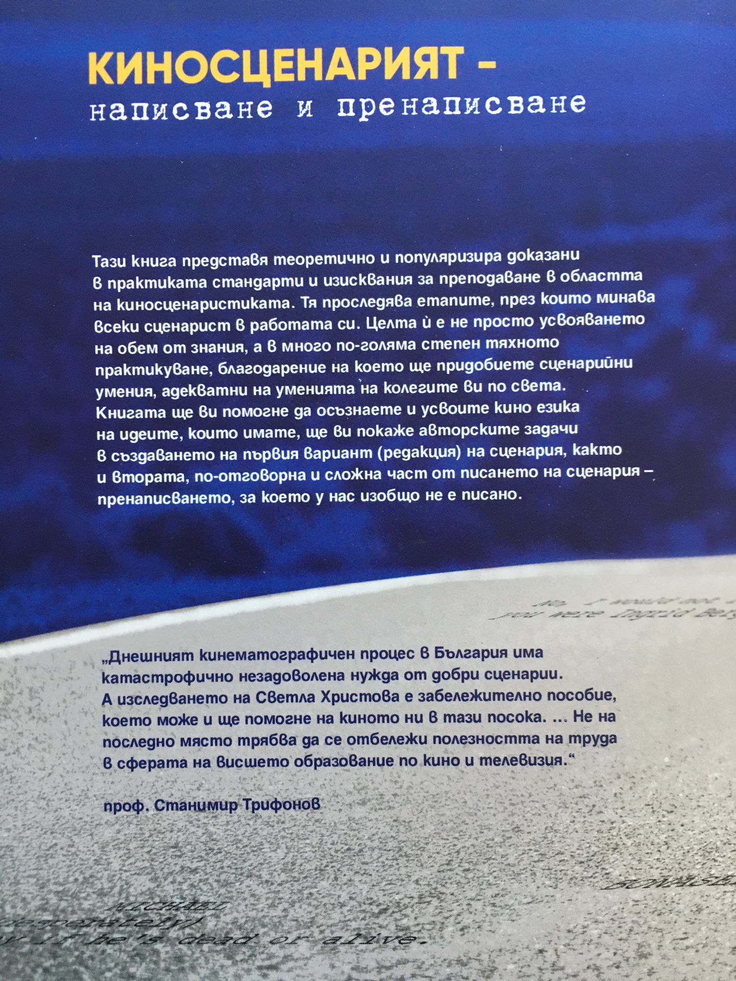 Тази книга представя теоретично и популяризира доказани в практиката стандарти и изисквания за преподаване в областта на киносценаристиката. Тя проследява етапите, през които минава всеки сценарист в работата си. Целта ? е не просто усвояването на обем от знания, а в много по-голяма степен тяхното практикуване, благодарение на което ще придобиете сценарийни умения, адекватни на уменията на колегите ви по света. Книгата ще ви помогне да осъзнаете и усвоите кино езика на идеите, които имате, ще ви покаже авторските задачи в създаването на първия вариант(редакция) на сценария, както и втората, по-отговорна и сложна част от писането на сценария – пренаписването, за което у нас изобщо не е писано.