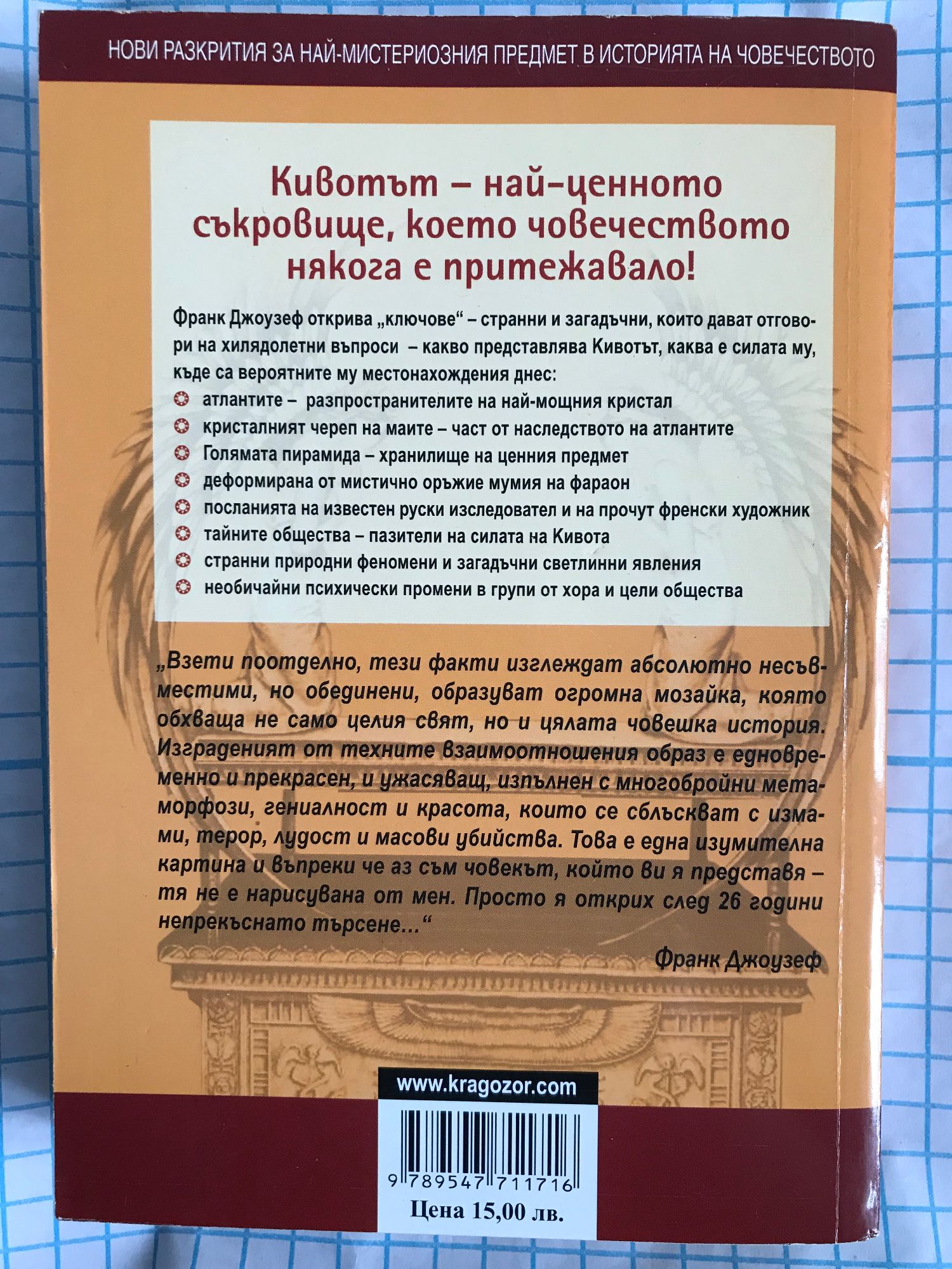 Кивотът – най-ценното съкровище, което човечеството някога е притежавало! Франк Джоузеф открива „ключове“ – странни и загадъчни, които дават отговори на хилядолетни въпроси – какво представлява Кивотът, каква е силата му, къде са вероятните му местонахождения днес: атлантите – разпространителите на най-мощния кристал кристалният череп на маите – част от наследството на атлантите Голямата пирамида – хранилище на ценния предмет деформирана от мистично оръжие мумия на фараон посланията на известен руски изследовател и прочут френски художник тайните общества – пазители на силата на Кивота странни природни феномени и загадъчни светлинни явления необичайни психически промени в групи от хора и цели общества „Взети поотделно, тези факти изглеждат абсолютно несъвместими, но обединени, образуват огромна мозайка, която обхваща не само целия свят, но и цялата човешка история. Изграденият от техните взаимоотношения образ е едновременно и прекрасен, и ужасяващ, изпълнен с многобройни метаморфози, гениалност и красота, които се сблъскват с измами, терор, лудост и масови убийства. Това е една изумителна картина и въпреки че аз съм човекът, който ви я представя – тя не е нарисувана от мен. Просто я открих след 26 години непрекъснато търсене…“