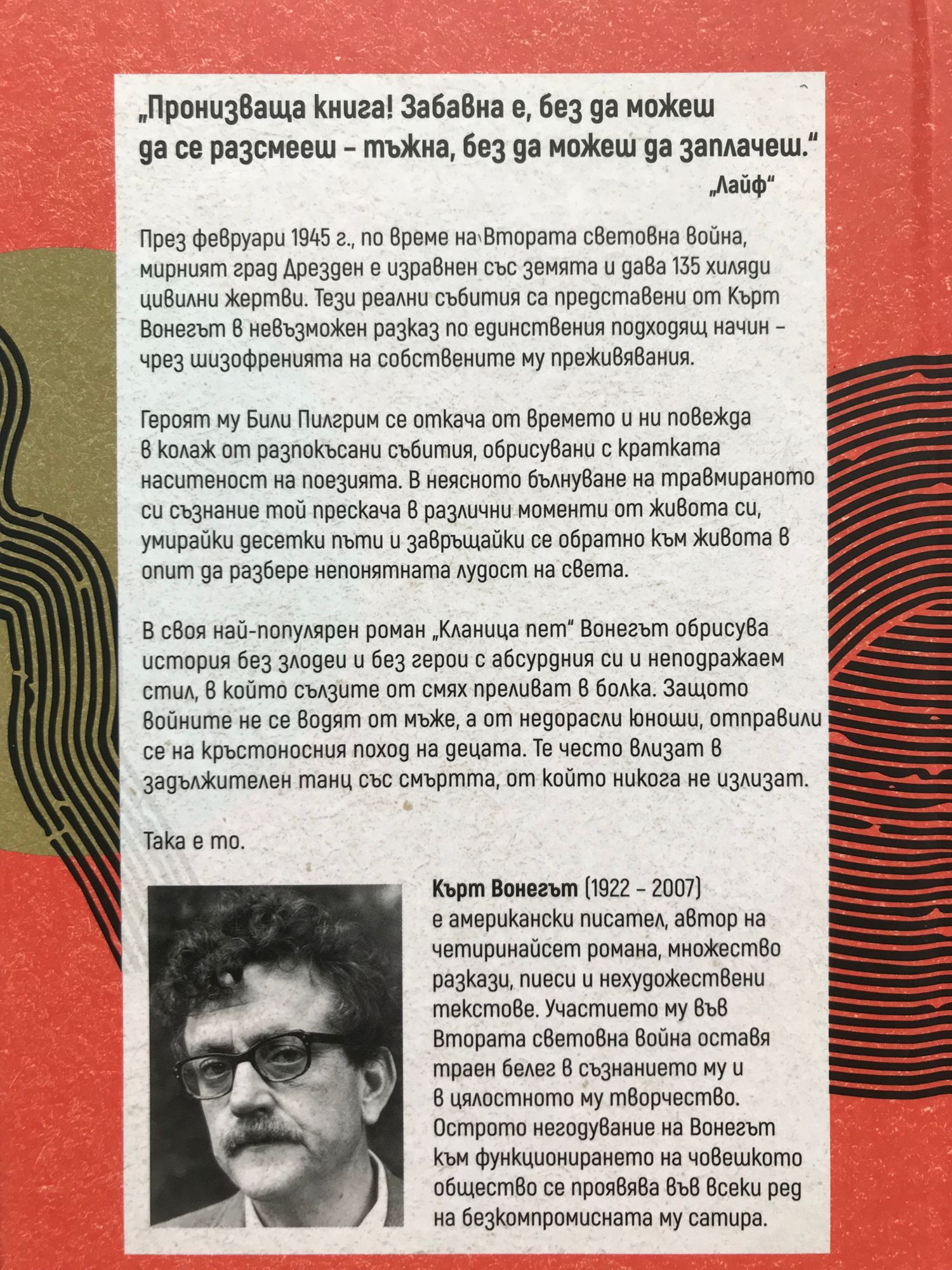 През февруари 1945 г., по време на Втората световна война, мирният град Дрезден е изравнен със земята и дава 135 хиляди цивилни жертви. Тези реални събития са представени от Кърт Вонегът в невъзможен разказ по единствения подходящ начин - чрез шизофренията на собствените му преживявания. Героят му Били Пилгрим се откача от времето и ни повежда в колаж от разпокъсани събития, обрисувани с кратката наситеност на поезията. В неясното бълнуване на травмираното си съзнание той прескача в различни моменти от живота си, умирайки десетки пъти и завръщайки се обратно към живота в опит да разбере непонятната лудост на света. В своя най-популярен и знаков роман Кланица пет Вонегът обрисува история без злодеи и без герои с абсурдния си и неподражаем стил, в който сълзите от смях преливат в болка. Защото войните не се водят от мъже, а от недорасли юноши, отправили се на кръстоносния поход на децата. Те често влизат в задължителен танц със смъртта, от който никога не излизат. Така е то. Кърт Вонегът (1922 - 2007) е американски писател, автор на четиринайсет романа, множество разкази, пиеси и нехудожествени текстове. Участието му във Втората световна война оставя траен белег в съзнанието му и в цялостното му творчество. Острото негодувание на Вонегът към функционирането на човешкото общество се проявява във всеки ред на безкомпромисната му сатира. "Пронизваща книга! Забавна е, без да можеш да се разсмееш - тъжна, без да можеш да заплачеш."