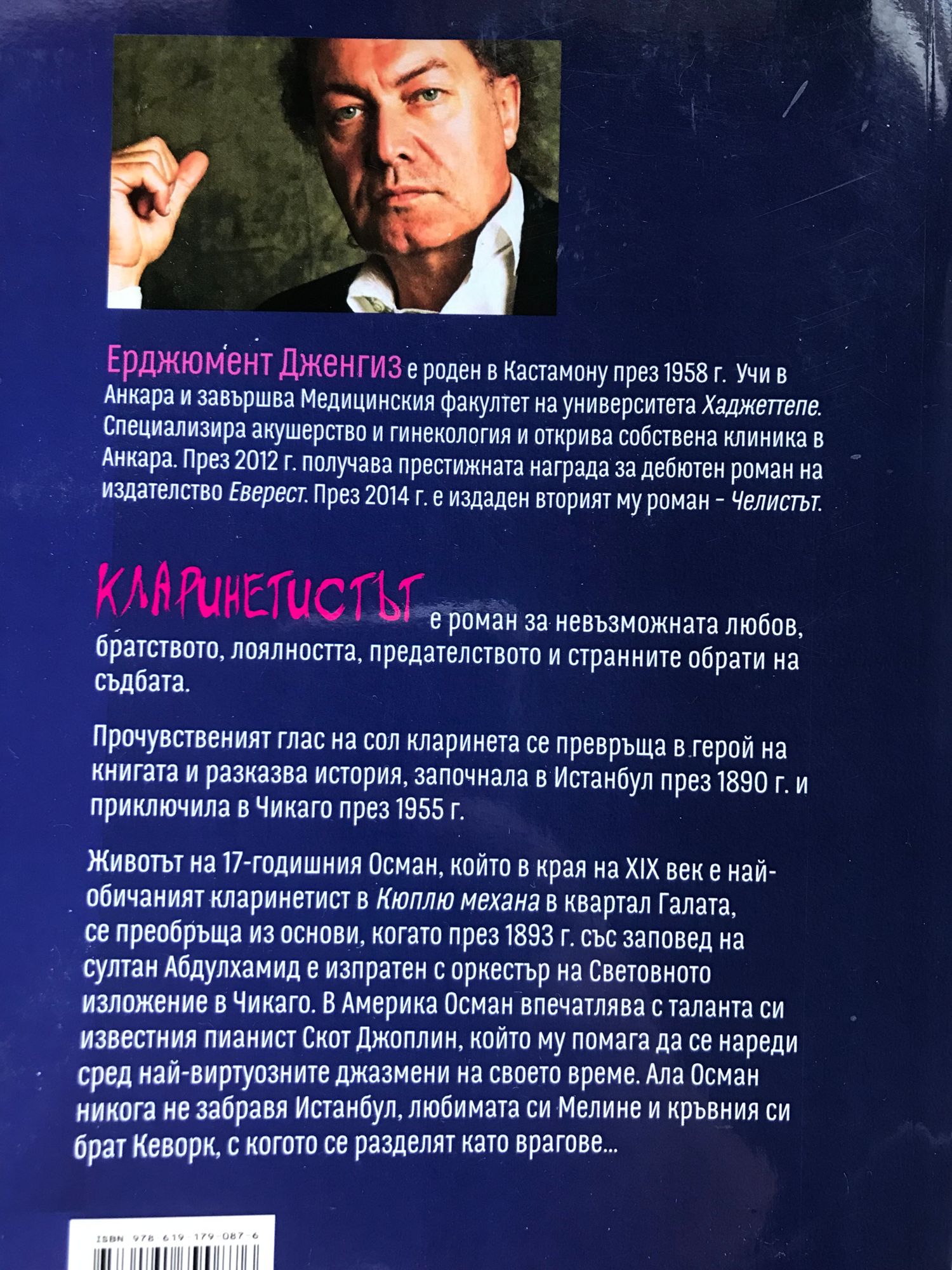 КЛАРИНЕТИСТЪТ е роман за невъзможната любов, братството, лоялността, предателството и странните обрати на съдбата. Прочувственият глас на сол кларинета се превръща в герой на книгата и разказва история, започнала в Истанбул през 1890 г. и приключила в Чикаго през 1955 г. Животът на 17-годишния Осман, който в края на XIX век е най-обичаният кларинетист в Кюплю механа в квартал Галата, се преобръща из основи, когато през 1893 г. със заповед на султан Абдулхамид е изпратен с оркестър на Световното изложение в Чикаго. В Америка Осман впечатлява с таланта си известния пианист Скот Джоплин, който му помага да се нареди сред най-виртуозните джазмени на своето време. Ала Осман никога не забравя Истанбул, любимата си Мелине и кръвния си брат Кеворк, с когото се разделят като врагове. Ерджюмент Дженгиз е роден в Кастамону през 1958 г. Учи в Анкара и завършва Медицинския факултет на университета Хаджеттепе. Специализира акушерство и гинекология и открива собствена клиника в Анкара. През 2012 г. получава престижната награда за дебютен роман на издателство Еверест. През 2014 г. е издаден вторият му роман – "Челистът".