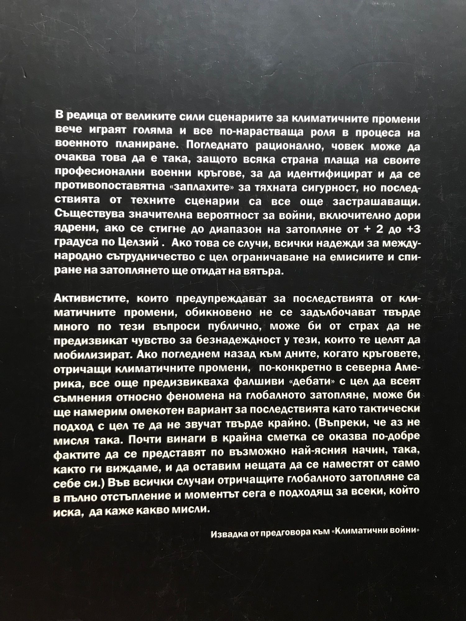 В редица от великите сили сценариите за климатичните промени вече играят голяма и все по-нарастваща роля в процеса на военното планиране. Погледнато рационално, човек може да очаква това да е така, защото всяка страна плаща на своите професионални военни кръгове, за да идентифицират и да се противопоставят на "заплахите" за тяхната сигурност, но последствията от техните сценарии са все още застрашаващи. Съществува значителна вероятност за войни, включително дори ядрени, ако се стигне до диапазон на затопляне от +2 до +3 градуса по Целзий. Ако това се случи, всички надежди на емисиите и спиране на затоплянето ще отидат на вятъра. Резултатът е "Климатични войни", надникване в недалечното бъдеще и поглед от най-предната линия на науката и стратегията. Прогнозираща без увъртане, и базирана на задълбочен анализ и интервюта, книгата се очертава да бъде една от най-значителните книги през следващите години.