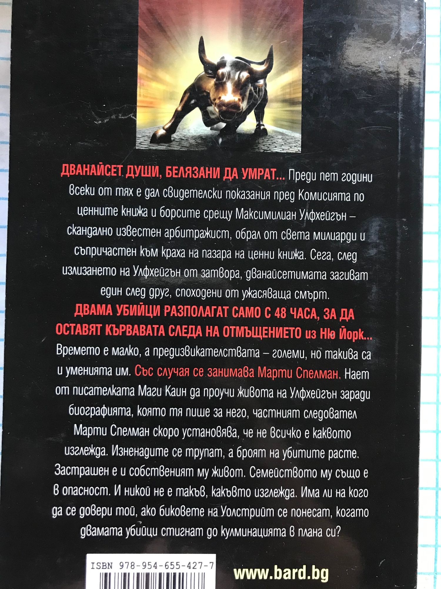Дванайсет души, белязани да умрат... Преди пет години всеки от тях е дал свидетелски показания пред Комисията по ценните книжа и борсите срещу Максимилиан Улфхейгън - скандално известен арбитражист, обрал от света милиарди и съпричастен към краха на пазара на ценни книжа. Сега, след излизането на Улфгейгън от затвора, дванайсетимата загиват един след друг, споходени от ужасяваща смърт. Двама убийци разполагат само с 48 часа, за да оставят кървавата следа на отмъщението из Ню Йорк... Времето е малко, а предизвикателствата - големи, но такива са и уменията им. Със случая се занимава Марти Спелман. Нает от писателката Маги Каин да проучи живота на Улфхейгън заради биографията, която тя пише за него, частният следовател Марти Спелман скоро установява, че не всичко е каквото изглежда. Изненадите се трупат, а броят на убитите расте. Застрашен е и собственият му живот. Семейството му също е в опасност. И никой не е такъв, какъвто изглежда. Има ли на кого да се довери той, ако биковете на Уолстрийт се понесат, когато двамата убийци стигнат до кулминацията в плана си?
