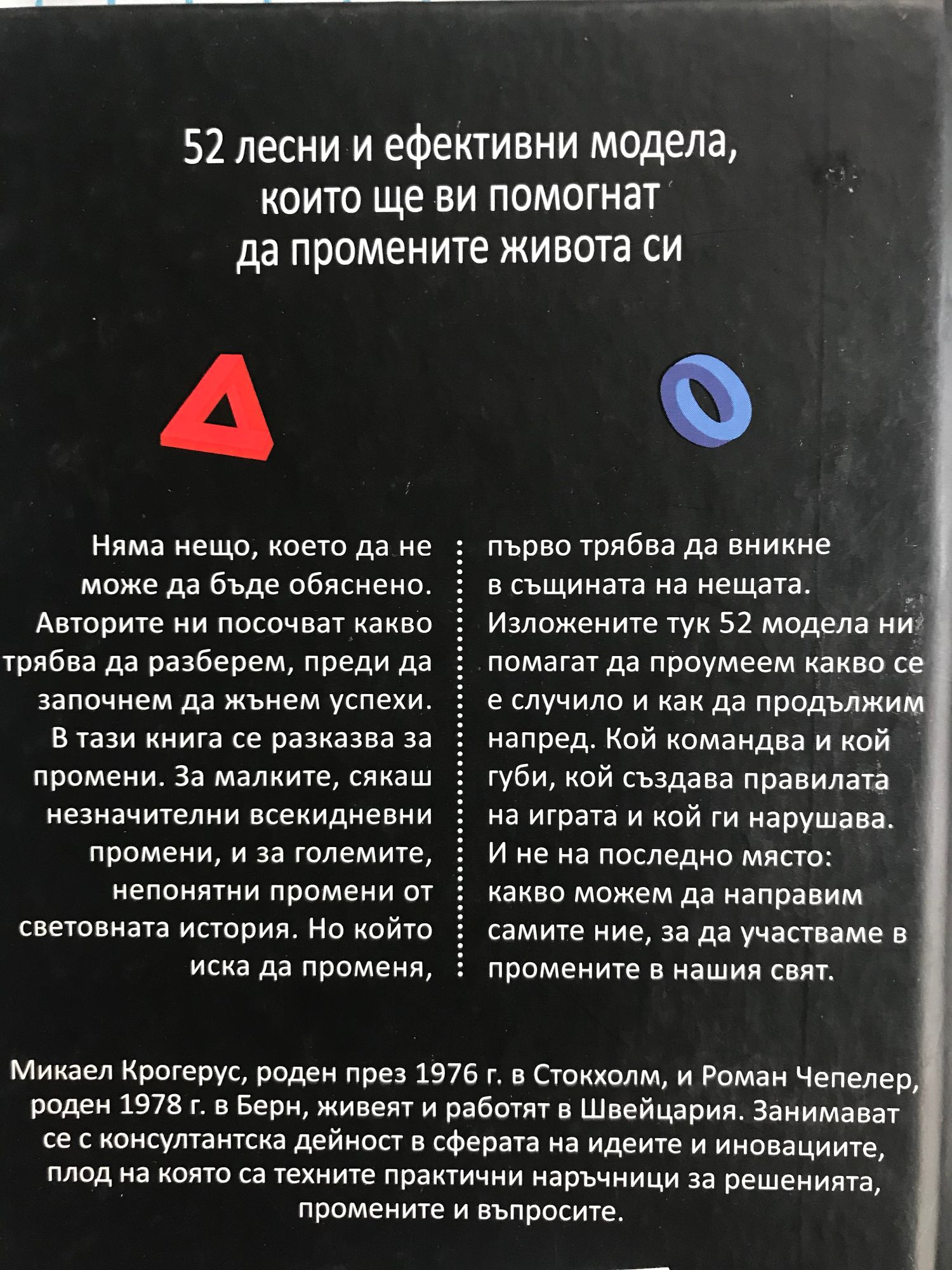 Няма нещо, което да не може да бъде обяснено. Авторите ни посочват какво трябва да разберем, преди да започнем да жънем успехи. В тази книга се разказва за промени. За малките, сякаш незначителни всекидневни промени, и за големите, непонятни промени от световната история. Но който иска да променя, първо трябва да вникне в същината на нещата. Изложените тук 52 модела ни помагат да проумеем какво се е случило и как да продължим напред. Кой командва и кой губи, кой създава правилата на играта и кой ги нарушава. И не на последно място: какво можем да направим самите ние, за да участваме в промените в нашия свят.