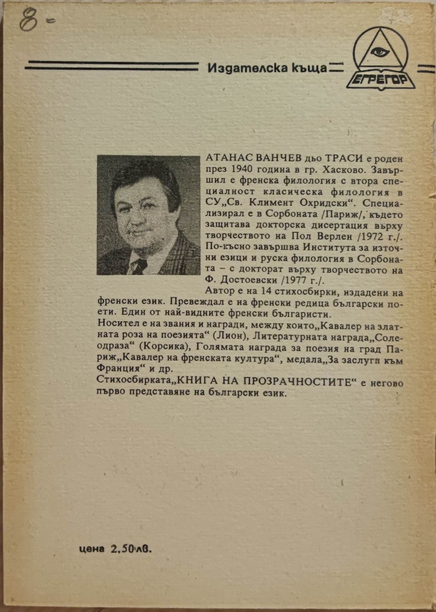 4,09 € / 8,00 лв.Много добро състояние на книжното тяло. С пожълтяла корица.