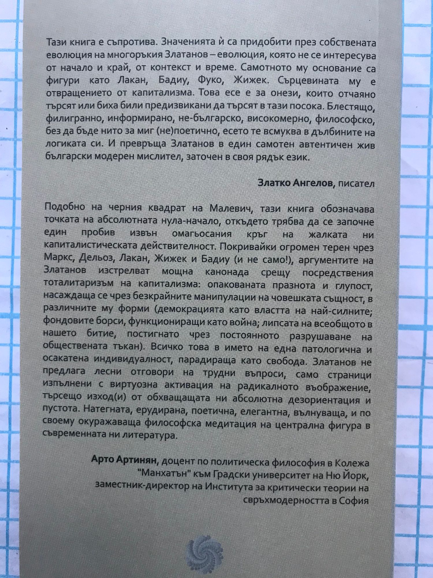 „Тази книга е съпротива. Значенията й са придобити през собствената еволюция на многоръкия Златанов – еволюция, която не се интересува от начало и край, от контекст и време. Самотното му основание са фигури като Лакан, Бадиу, Фуко, Жижек. Сърцевината му е отвращението от капитализма. Това есе е за онези, които отчаяно търсят или биха били предизвикани да търсят в тази посока. Блестящо, филигранно, информирано, не-българско, високомерно, философско, без да бъде нито за миг (не)поетично, есето те всмуква в дълбините на логиката си. И превръща Златанов в един самотен автентичен жив български модерен мислител, заточен в своя рядък език.“ Златко Ангелов, писател „Подобно на черния квадрат на Малевич, тази книга обозначава точката на абсолютната нула-начало, откъдето трябва да се започне един пробив извън омагьосания кръг на жалката ни капиталистическата действителност. Покривайки огромен терен чрез Маркс, Дельоз, Лакан, Жижек и Бадиу (и не само!), аргументите на Златанов изстрелват мощна канонада срещу посредствения тоталитаризъм на капитализма: опакованата празнота и глупост, насаждаща се чрез безкрайните манипулации на човешката същност, в различните му форми (демокрацията като властта на най-силните; фондовите борси, функциониращи като война; липсата на всеобщото в нашето битие, постигнато чрез постоянното разрушаване на обществената тъкан). Всичко това – в името на една патологична и осакатена индивидуалност, парадираща като свобода. Златанов не предлага лесни отговори на трудни въпроси, само страници изпълнени с виртуозна активация на радикалното въображение, търсещо изход(и) от обхващащата ни абсолютна дезориентация и пустота. Натегната, ерудирана, поетична, елегантна, вълнуваща, и по своему окуражаваща философска медитация на централна фигура в съвременната ни литература." Арто Артинян, доцент по политическа философия в Колежа "Манхатън" към Градски университет на Ню Йорк, заместник-директор на Института за критически теории на свръхмодерността в София