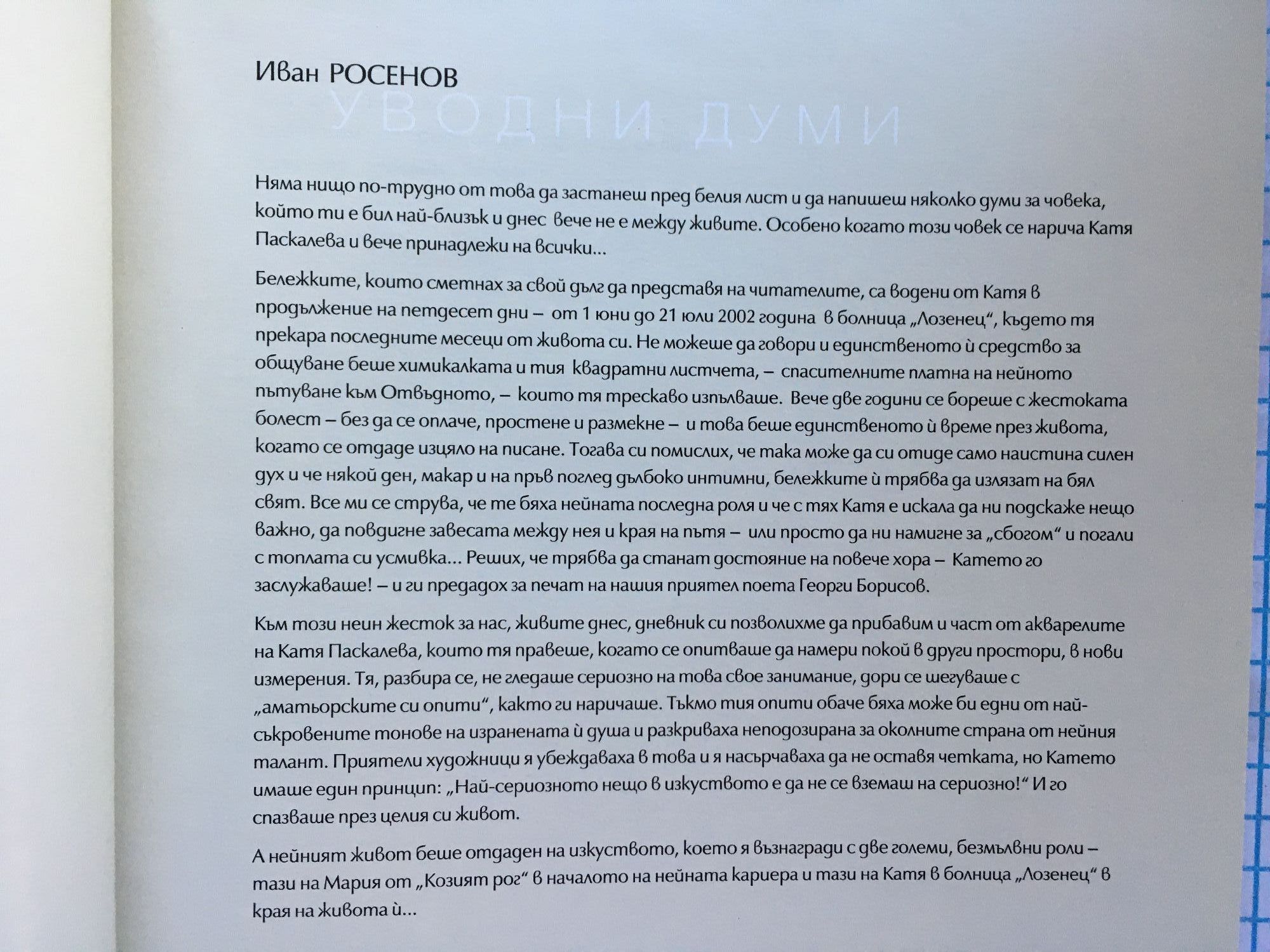 "Няма нищо по-трудно от това да застанеш пред белия лист и да напишеш няколко думи за човека, който ти е бил най-близък и днес вече не е между живите. Особено, когато този човек се нарича Катя Паскалева и вече принадлежи на всички... Бележките, които сметнах за свой дълг да представя на читателите, са водени от Катя в продължение на петдесет дни - от 1 юни до 21 юли 2002 година в болница "Лозенец", където тя прекара последните месеци от живота си. Не можеше да говори и единственото й средство за общуване беше химикалката и тия квадратни листчета - спасителните платна на нейното пътуване към Отвъдното, - които тя трескаво изпълваше. Вече две години се бореше с жестоката болест - без да се оплаче, простене и размекне - и това беше единственото й време през живота, когато се отдаде изцяло на писане. Тогава си помислих, че така може да си отиде само наистина силен дух, и че някой ден, макар и на пръв поглед дълбоко интимни, бележките й трябва да излязат на бял свят. Все ми се струва, че те бяха нейната последна роля, и че с тях Катя е искала да ни подскаже нещо важно, да повдигне завесата между нея и края на пътя - или просто да ни намигне за "сбогом" и погали с топлата си усмивка... Реших, че трябва да станат достояние на повече хора - Катето го заслужаваше! - и ги предадох за печат на нашия приятел поета Георги Борисов. Към този неин жесток за нас, живите днес, дневник си позволихме да прибавим и част от акварелите на Катя Паскалева, които тя правеше, когато се опитваше да намери покой в други простори, в нови измерения. Тя, разбира се, не гледаше сериозно на това свое занимание, дори се шегуваше с "аматьорските си опити", както ги наричаше. Тъкмо тия опити обаче бяха може би едни от най-съкровените тонове на изранената й душа и разкриваха неподозирана за околните страна от нейния талант. Приятели художници я убеждаваха в това и я насърчаваха да не оставя четката, но Катето имаше един принцип: "Най-сериозното нещо в изкуството е да не се вземаш на сериозно!" И го спазваше през целия си живот. А нейният живот беше отдаден на изкуството, което я възнагради с две големи, безмълвни роли - тази на Мария от "Козият рог" в началото на нейната кариера и тази на Катя в болница "Лозенец" в края на живота й..."