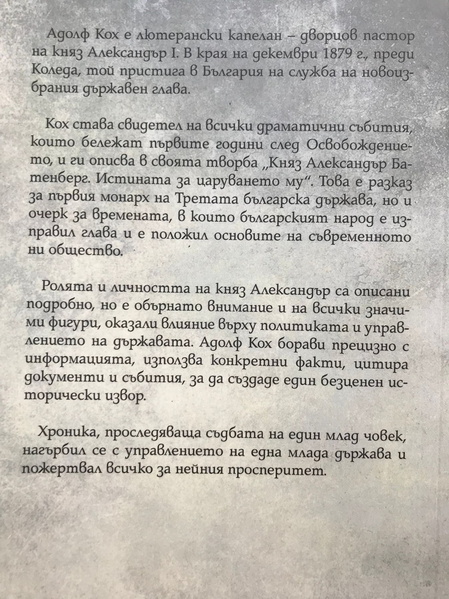 Адолф Кох е лютерански капелан – дворцов пастор на княз Александър I. В края на декември 1879 г., преди Коледа, пристига в България на служба на новоизбрания държавен глава. Той става свидетел на всички драматични събития, които бележат първите години след Освобождението, и ги описва в своята творба „Княз Александър Батенберг. Истината за царуването му“. Това е разказ за първия монарх на Третата българска държава, но и очерк за времената, в които българският народ е изправил глава и е положил основите на съвременното ни общество. Това е биография, но и ценен извор за историята на модерна България. Ролята и личността на княз Александър са описани подробно, но е обърнато внимание и на всички значими фигури, оказали влияние върху политиката и управлението на държавата. Адолф Кох борави прецизно с информацията, използва конкретни факти, цитира документи и събития, за да създаде един безценен исторически извор. Книга, проследяваща съдбата на един млад човек, нагърбил се с управлението на една млада държава и пожертвал всичко за нейния просперитет.