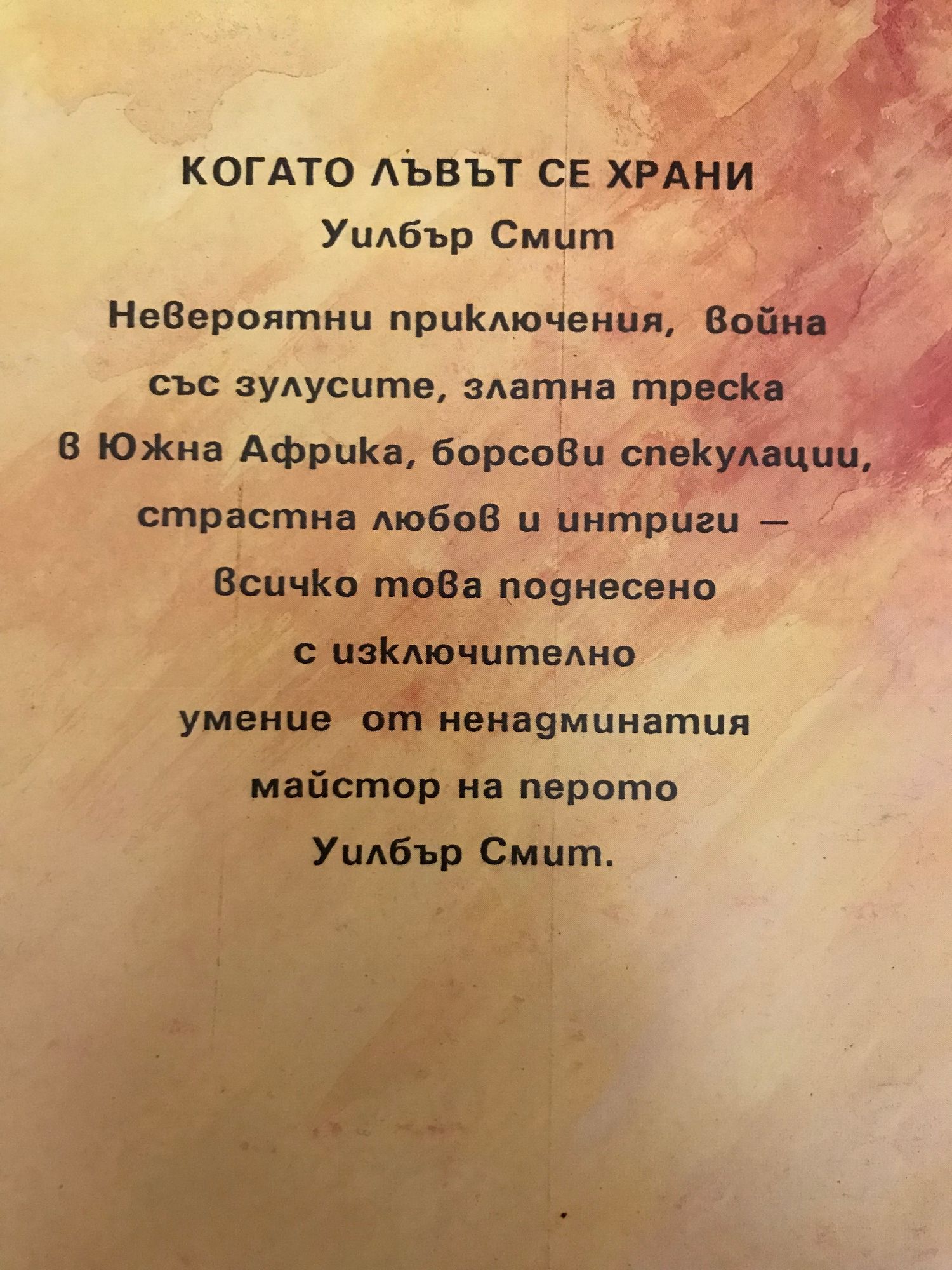 Невероятни приключения, война със зулусите, златна треска в Южна Африка, борсови спекулации, страстна любов и интриги — всичко това поднесено с изключително умение от ненадминатия майстор на перото Уилбър Смит.