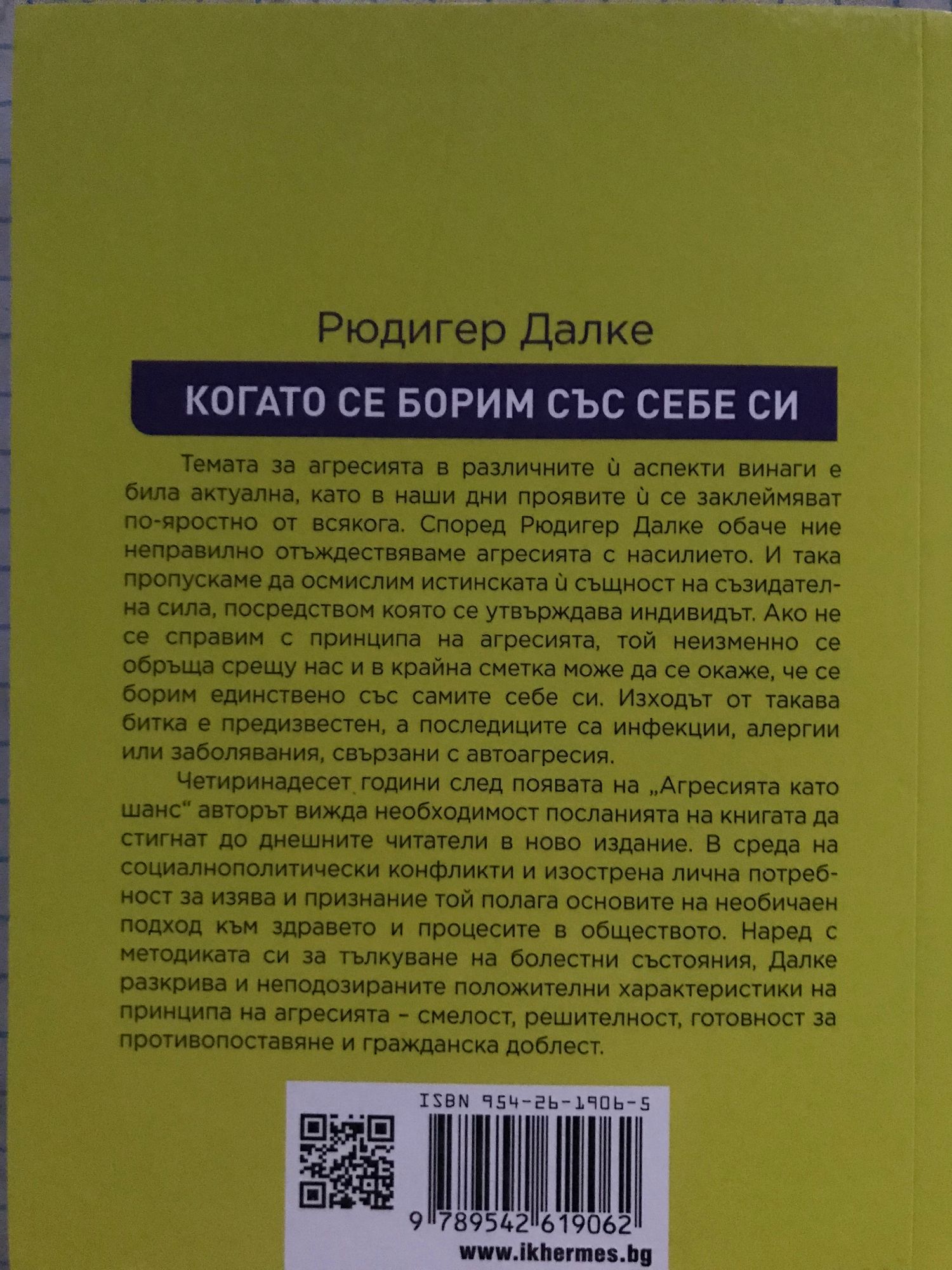 Темата за агресията в различните й аспекти винаги е била актуална, като в наши дни проявите й се заклеймяват по-яростно от всякога. Според Рюдигер Далке обаче ние неправилно отъждествяваме агресията с насилието. И така пропускаме да осмислим истинската й същност на съзидателна сила, посредством която се утвърждава индивидът. Ако не се справим с принципа на агресията, той неизменно се обръща срещу нас и в крайна сметка може да се окаже, че се борим единствено със самите себе си. Изходът от такава битка е предизвестен, а последиците са инфекции, алергии или заболявания, свързани с автоагресия. Четиринадесет години след първото издание на „Агресията като шанс“ авторът вижда необходимост посланията на книгата да стигнат до днешните читатели. В среда на социалнополитически конфликти и изострена лична потребност за изява и признание той полага основите на необичаен подход към здравето и процесите в обществото. Наред с методиката си за тълкуване на болестни състояния, Далке разкрива и неподозираните положителни характеристики на принципа на агресията – смелост, решителност, готовност за противопоставяне и гражданска доблест.