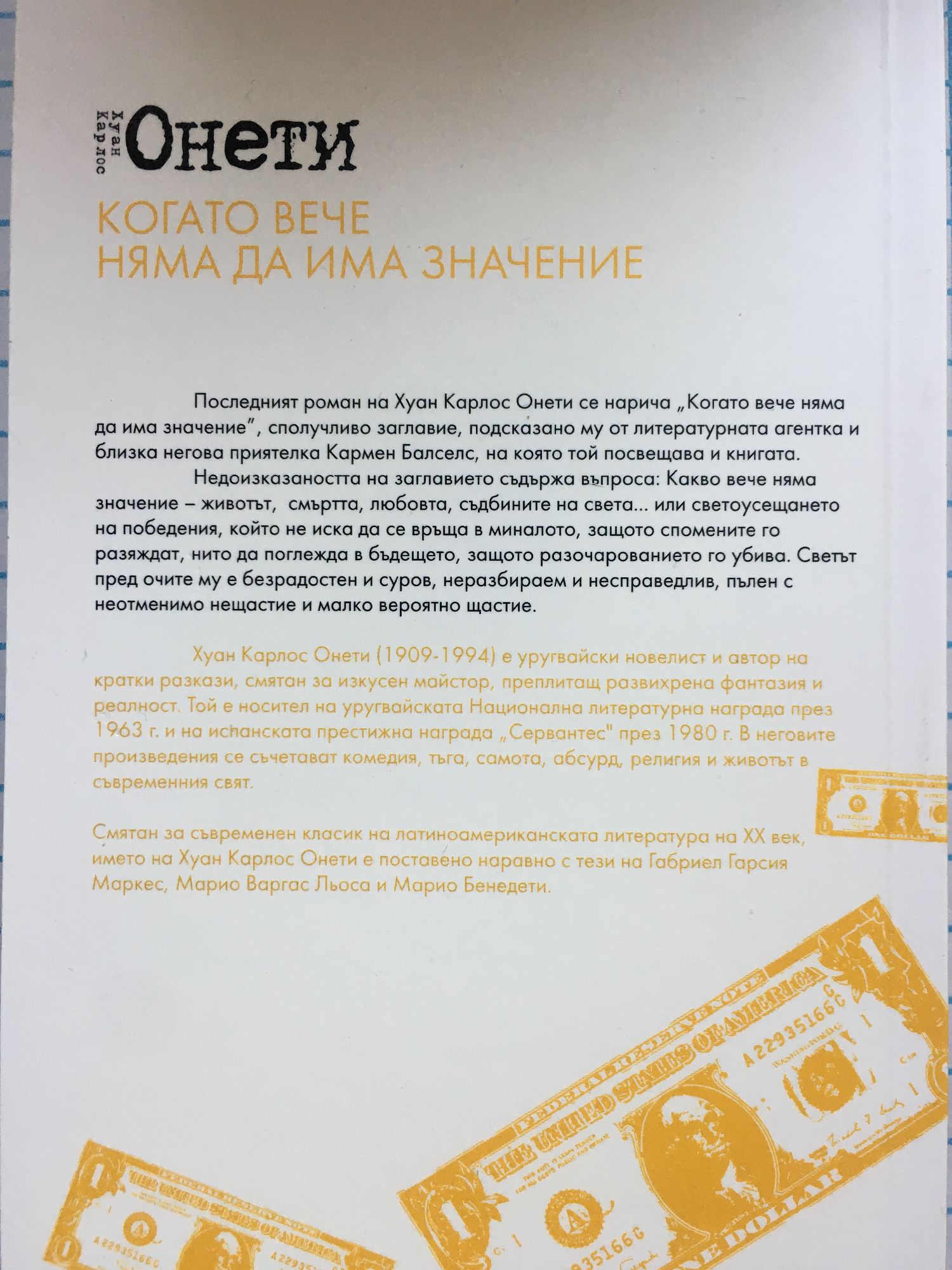 Последният роман на Хуан Карлос Онети се нарича "Когато вече няма да има значение", сполучливо заглавие, подсказано му от литературната агентка и близка негова приятелка Кармен Балселс, на която той посвещава и книгата. Недоизказаността на заглавието съдържа въпроса: Какво вече няма значение - животът, смъртта, любовта, съдбините на света... или светоусещането на победения, който не иска да се връща в миналото, защото спомените го разяждат, нито да поглежда в бъдещето, защото разочарованието го убива. Светът пред очите му е безрадостен и суров, неразбираем и несправедлив, пълен с неотменимо нещастие и малко вероятно щастие.