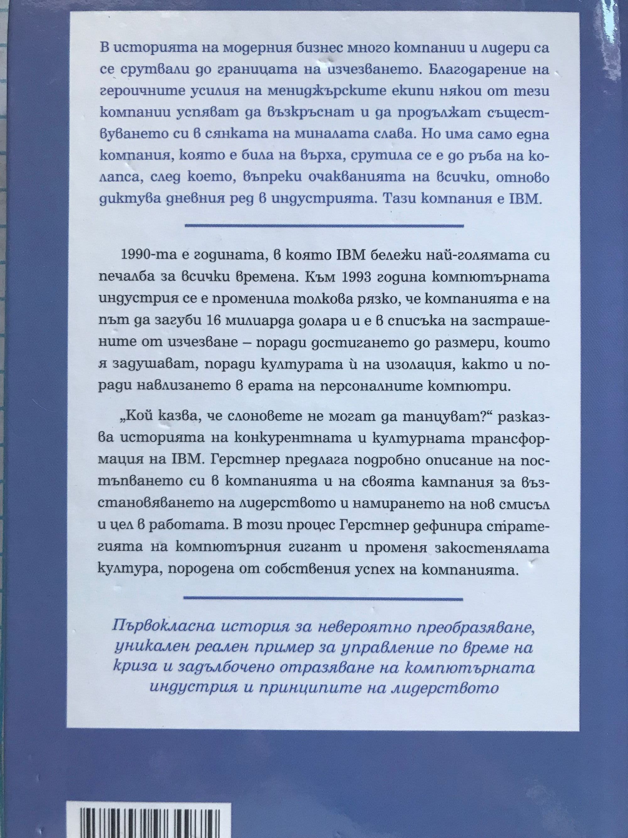 1990-та е годината, в която IBM бележи най-голямата си печалба за всички времена. Към 1993 година компютърната индустрия се е променила толкова рязко, че компанията е на път да загуби 16 милиарда долара и е в списъка на застрашените от изчезване - поради достигането до размери, които я задушават, поради културата й на изолация, както и поради навлизането в ерата на персоналния компютър, за изобретяването на който самата тя има вина. "Кой казва, че слоновете не могат да танцуват?" разказва историята на конкурентната и културната трансформация на IBM. Герстнер предлага подробно описание на постъпването си в компанията и на своята кампания за възстановяването на лидерството и намирането на нов смисъл и цел в работата. В този процес Герстнер дефинира стратегията на компютърния гигант и променя закостенялата култура, породена от собствения успех на компанията. Първокласна история за невероятно преобразяване, уникален реален пример за управление по време на криза и задълбочено отразяване на компютърната индустрия и принципите на лидерството, "Кой казва, че слоновете не могат да танцуват?" обобщава историческото бизнес постижение на Лу Герстнер. В историята на модерния бизнес много компании и лидери в бизнеса са се срутвали до границата на изчезването. Благодарение на героичните усилия на мениджърските екипи някои от тези компании успяват да възкръснат и да продължат съществуването си в сянката на миналата слава. Но има само една компания, която е била на върха, срутила се е до ръба на колапса, след което въпреки очакванията на всички отново диктува дневния ред в индустрията. Тази компания е IBM.