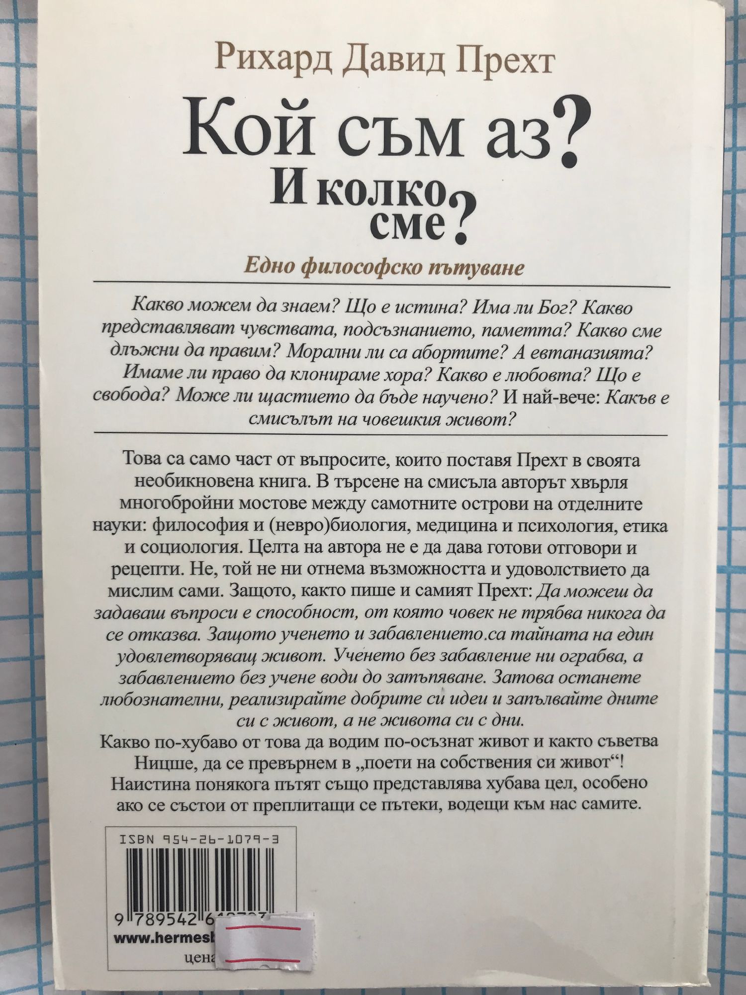 Какво можем да знаем? Що е истина? Има ли Бог? Какво представляват чувствата, подсъзнанието, паметта? Какво сме длъжни да правим? Морални ли са абортите? А евтаназията? Имаме ли право да клонираме хора? Какво е любовта? Що е свобода? Може ли щастието да бъде научено? И най-вече: Какъв е смисълът на човешкия живот? Това са само част от въпросите, които поставя Прехт в своята необикновена книга. В търсене на смисъла авторът хвърля многобройни мостове между самотните острови на отделните науки: философия и (невро)биология, медицина и психология, етика и социология. Целта на автора не е да дава готови отговори и рецепти. Не, той не ни отнема възможността и удоволствието да мислим сами. Защото, както пише и самият Прехт: Да можеш да задаваш въпроси е способност, от която човек не трябва никога да се отказва. Защото ученето и забавлението са тайната на един удовлетворяващ живот. Ученето без забавление ни ограбва, а забавлението без учене води до затъпяване. Затова останете любознателни, реализирайте добрите си идеи и запълвайте дните си с живот, а не живота си с дни. Какво по-хубаво от това да водим по-осъзнат живот и както съветва Ницше, да се превърнем в „поети на собствения си живот“! Наистина понякога пътят също представлява хубава цел, особено ако се състои от преплитащи се пътеки, водещи към нас самите.