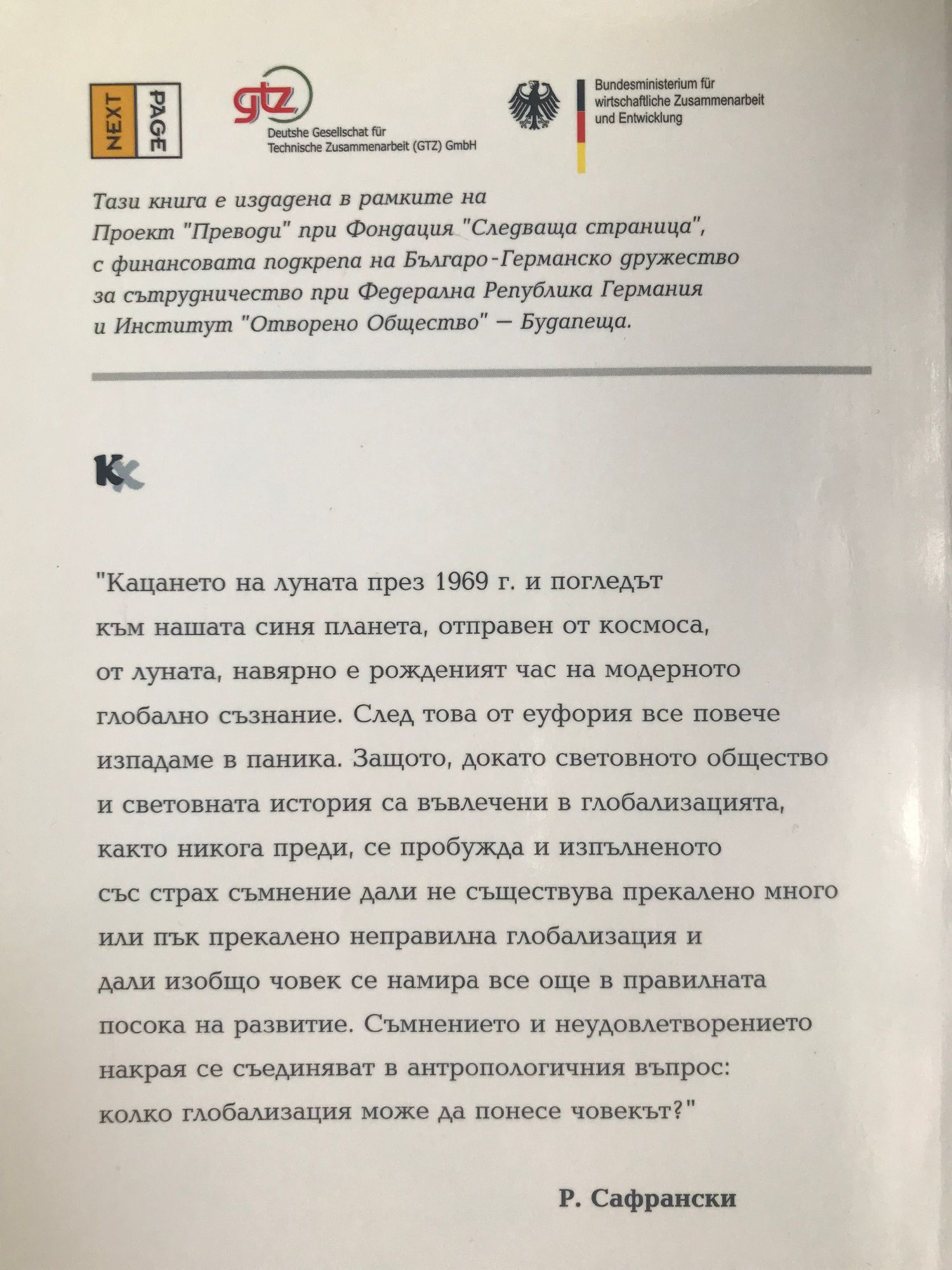 "Кацането на луната през 1969 г. и погледът към нашата синя планета, отправен от космоса, от луната, навярно е рожденият час на модерното глобално съзнание. След това от еуфория все повече изпадаме в паника. Защото, докато световното общество и световната история са въвлечени в глобализацията, както никога преди, се пробужда и изпълненото със страх съмнение дали не съществува прекалено много или пък прекалено неправилна глобализация и дали изобщо човек се намира все още в правилната посока на развитие. Съмнението и неудовлетворението накрая се съединяват в антропологичния въпрос: колко глобализация може да понесе човекът?" Р. Сафрански