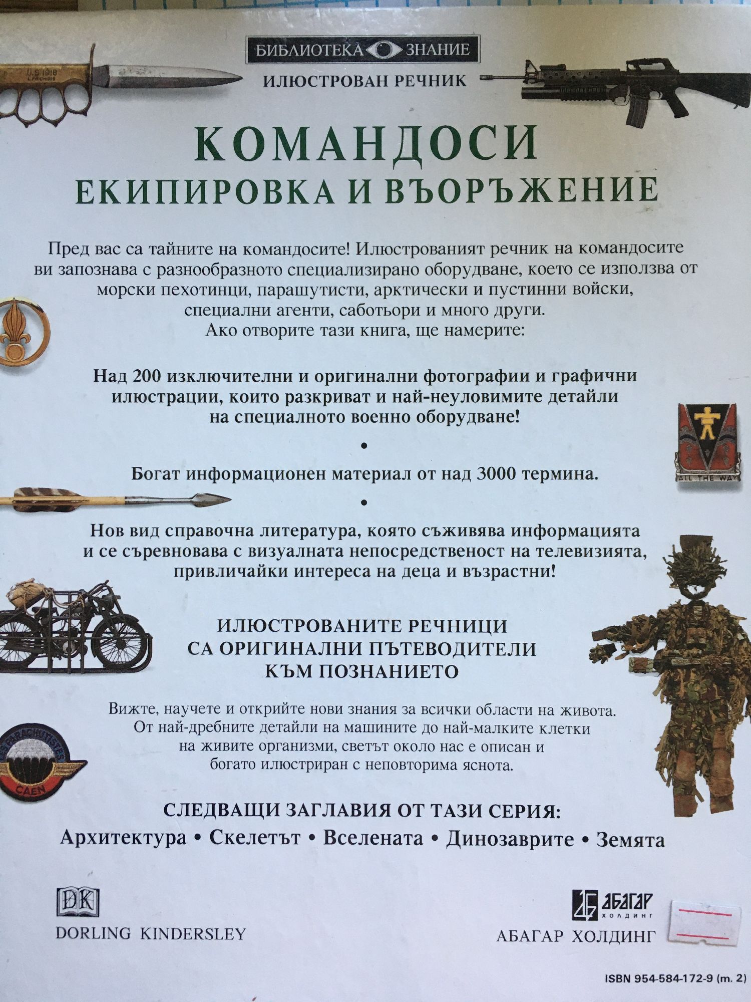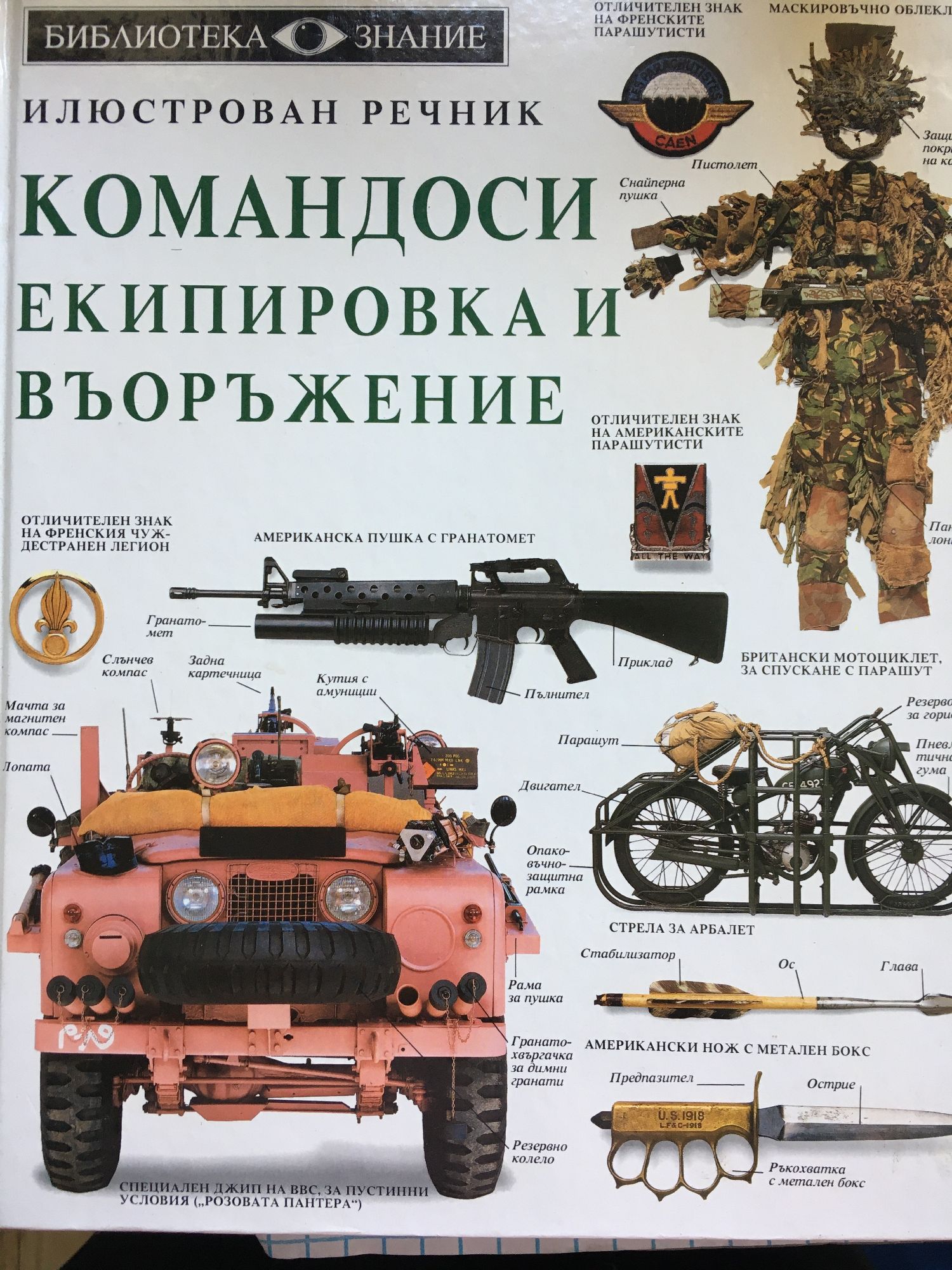 Пред вас са тайните на командосите! Илюстрованият речник на командосите ви запознава с разнообразното специализирано оборудване, което се използва от морски пехотинци, парашутисти, арктически и пустинни войски, специални агенти, саботьори и много други. Ако отворите тази книга, ще намерите: над 200 изключителни и оригинални фотографии и графични илюстрации, които разкриват и най-неуловимите детайли на специалното военно оборудване; богат информационен материал от над 3000 термина. Нов вид справочна литература, която съживява информацията и се съревновава с визуалната непосредственост на телевизията, привличайки интереса на деца и възрастни!