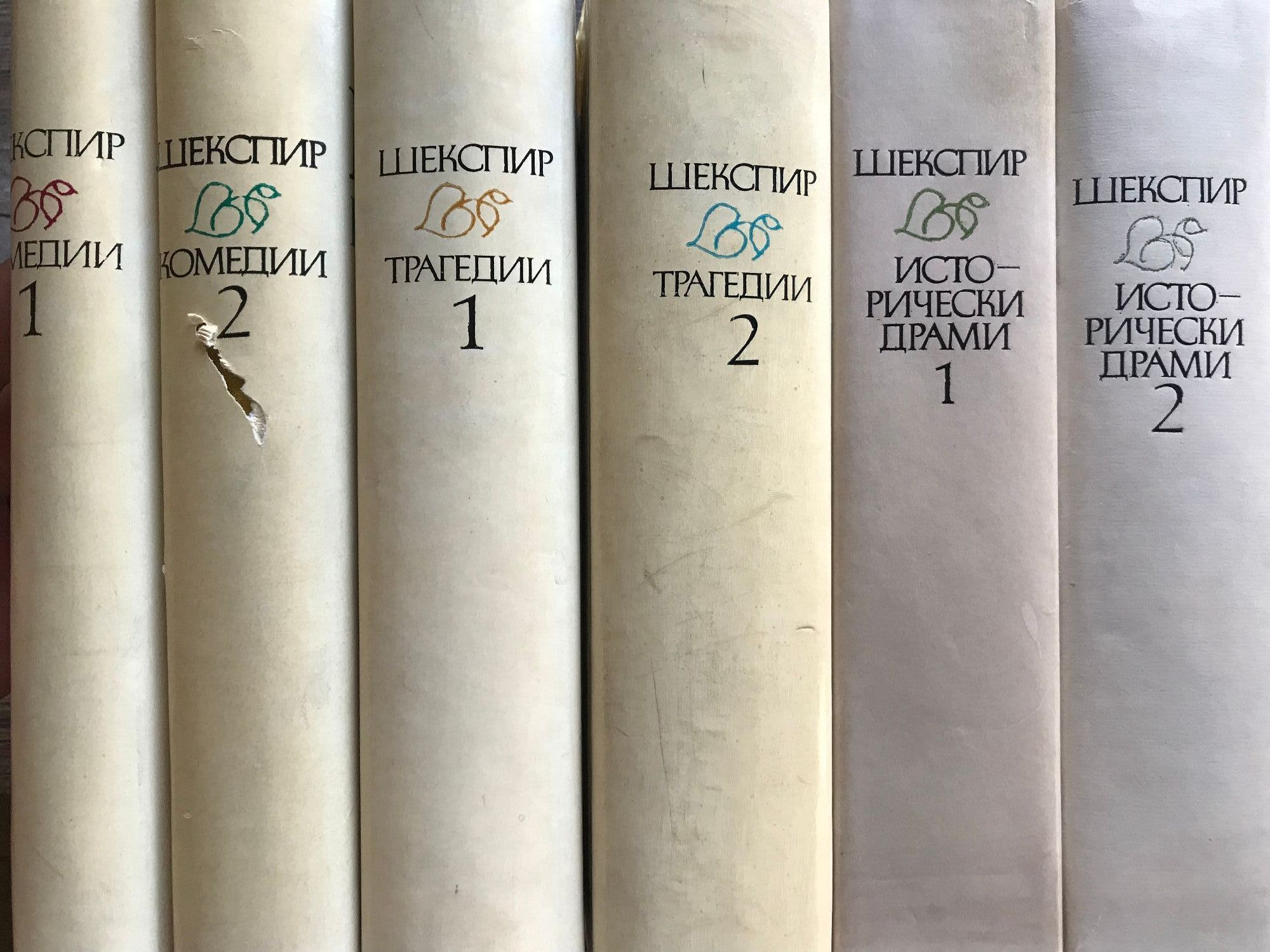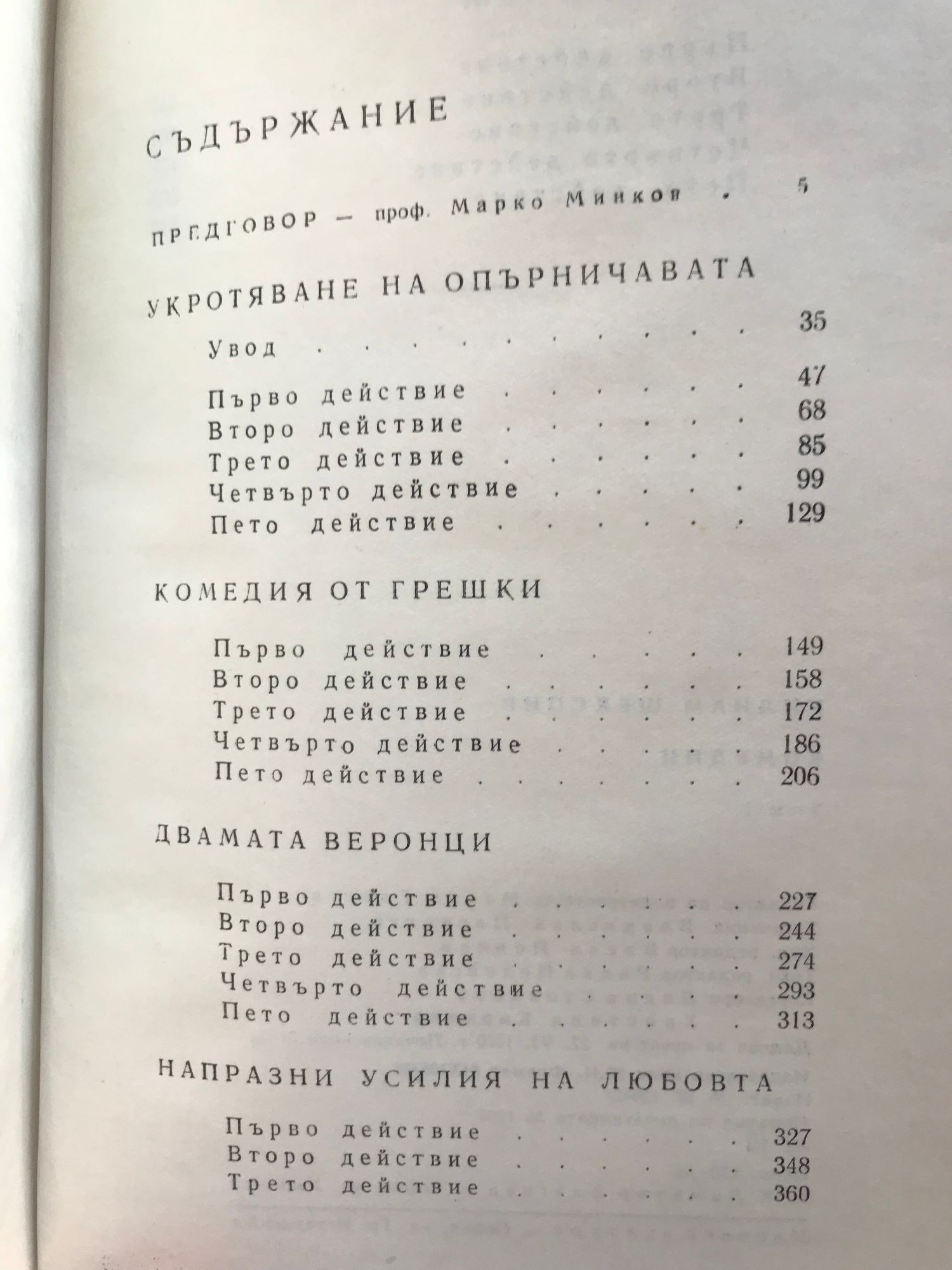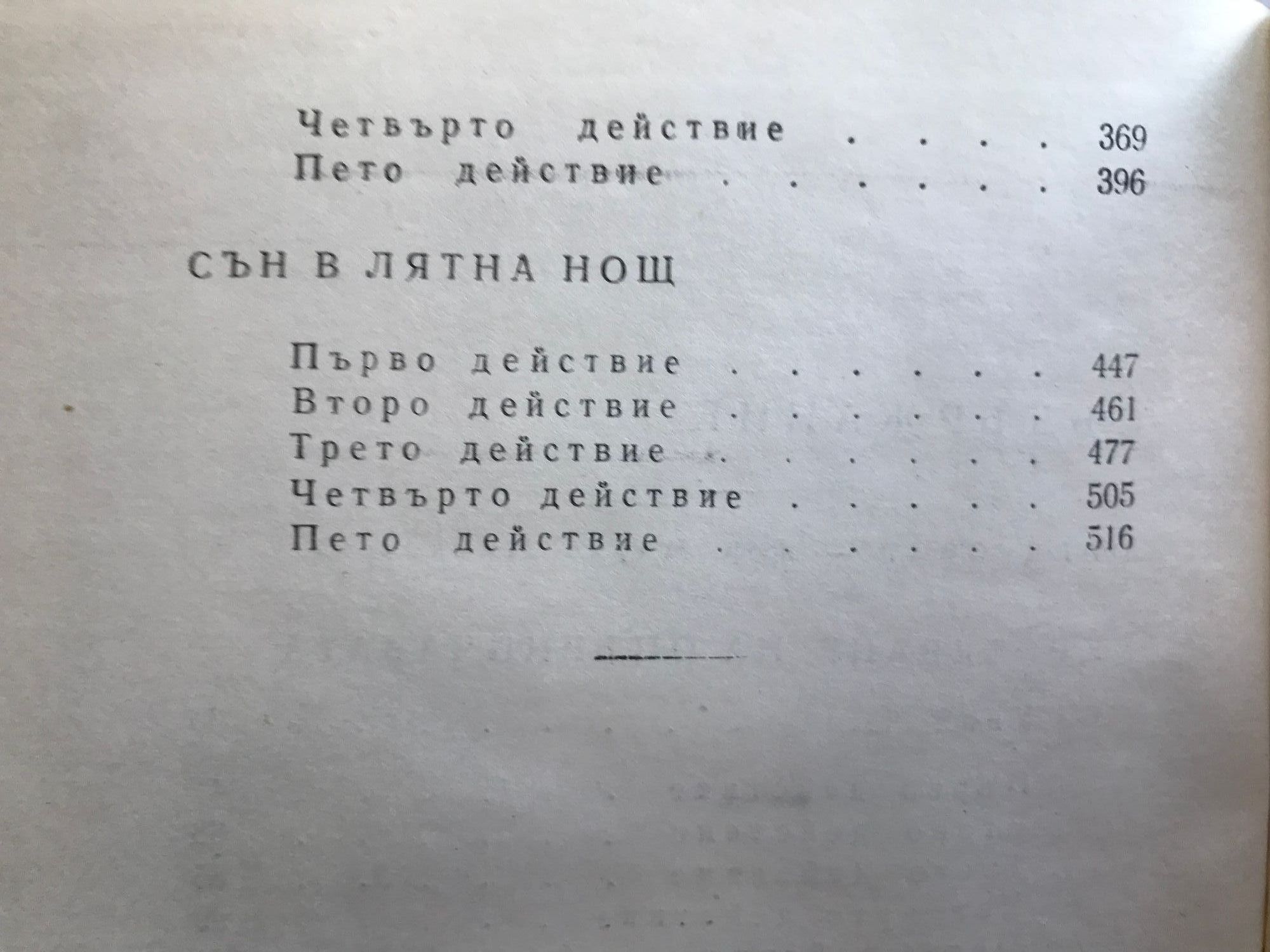 Комедии - том 1 и 2 Укротяване на опърничавата Комедия от грешки Двамата веронци Напразни усилия на любовта Сън в лятна нощ Венецианският търговец Веселите уиндзорки Много шум за нищо Както ви харесва Дванайсета нощ Трагедии- том 1 и 2 Тит Андроник. Ромео и Жулиета. Юлий Цезар. Хамлет. Отело. Крал Лир. Тимон Атински. Макбет. Антоний и Клеопатра. Кориолан Исторически драми - том 1 и 2 Крал Джон Ричард II Хенри IV първа част Хенри IV втора част Хенри V Хенри VI първа част Хенри VI втора част Хенри VI трета част Ричард III Хенри VIII