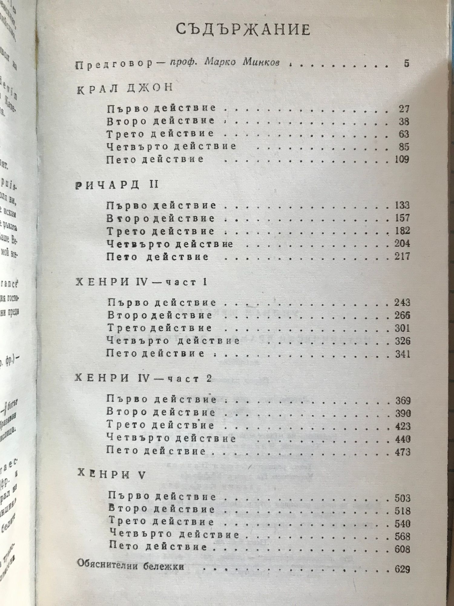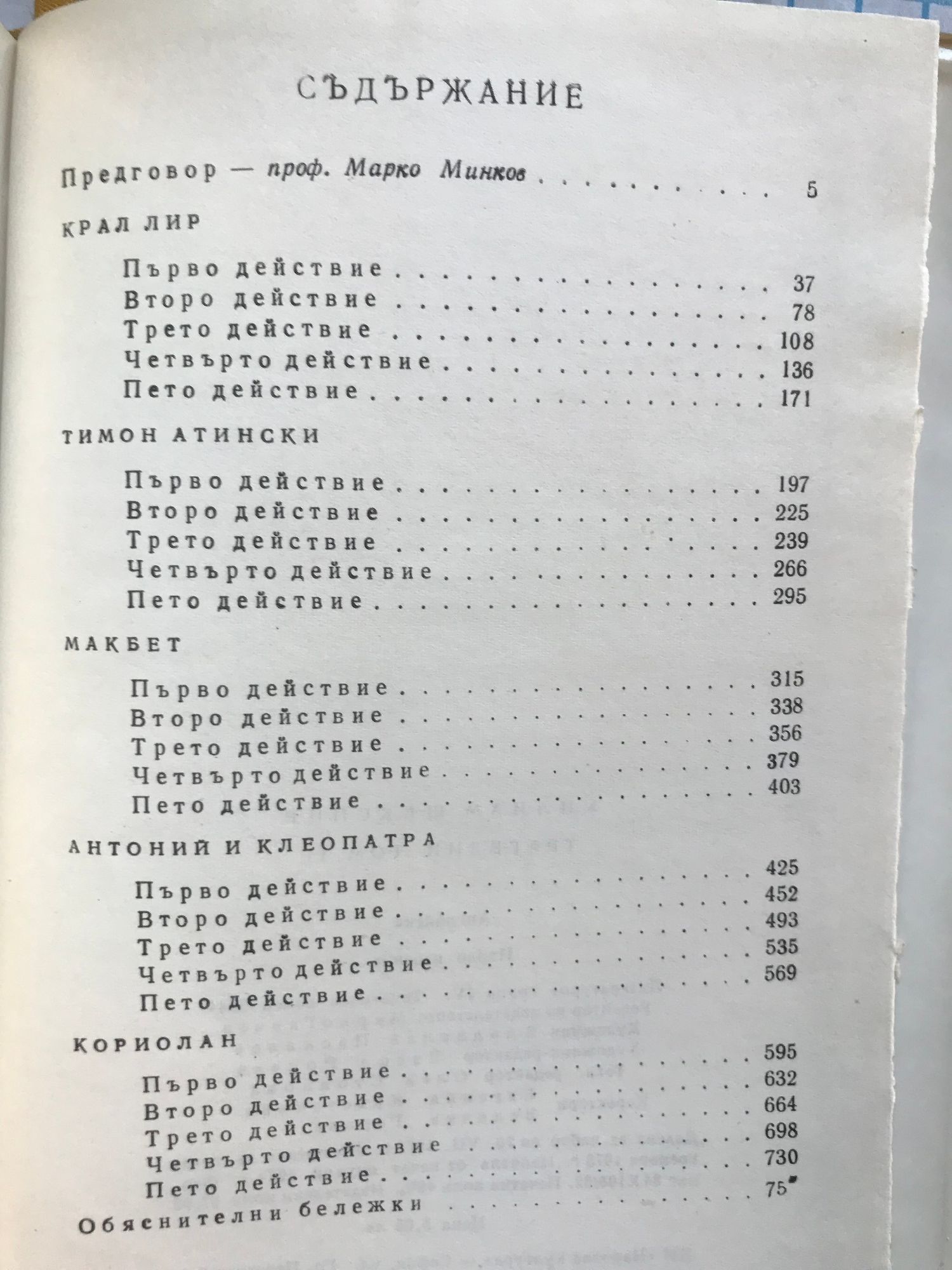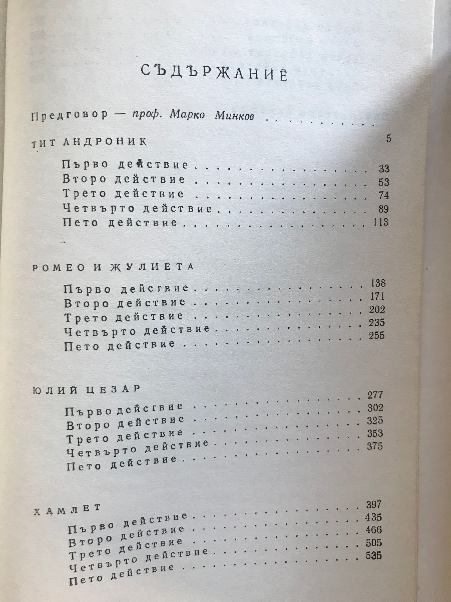 Комедии - том 1 и 2 Укротяване на опърничавата Комедия от грешки Двамата веронци Напразни усилия на любовта Сън в лятна нощ Венецианският търговец Веселите уиндзорки Много шум за нищо Както ви харесва Дванайсета нощ Трагедии- том 1 и 2 Тит Андроник. Ромео и Жулиета. Юлий Цезар. Хамлет. Отело. Крал Лир. Тимон Атински. Макбет. Антоний и Клеопатра. Кориолан Исторически драми - том 1 и 2 Крал Джон Ричард II Хенри IV първа част Хенри IV втора част Хенри V Хенри VI първа част Хенри VI втора част Хенри VI трета част Ричард III Хенри VIII