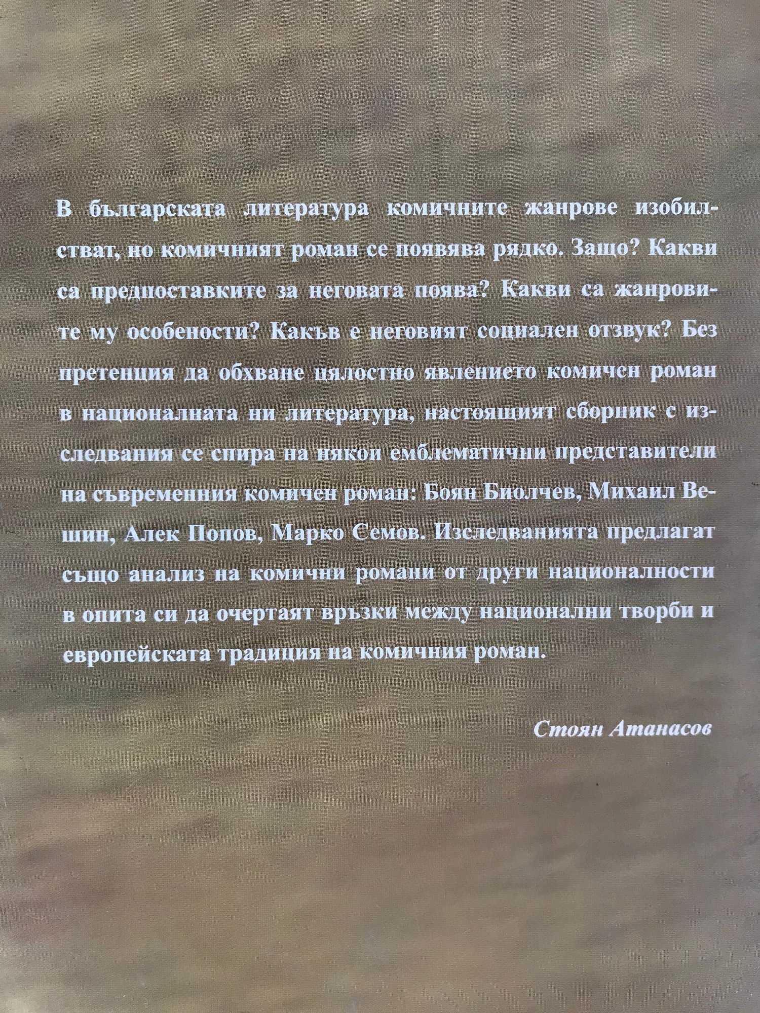 В българската литература комичните жанрове изобилстват, но комичният роман се появява рядко. Защо? Какви са предпоставките за неговата поява? Какви са жанровите му особености? Какъв е неговият социален отзвук? Без претенция да обхване цялостно явлението комичен роман в националната ни литература, настоящият сборник с изследвания се спира на някои емблематични представители на съвременния комичен роман: Боян Биолчев, Михаил Вешин, Алек Попов, Марко Семов. Изследванията предлага също анализ на комични романи от други националности в опита си да очертаят връзки между национални творби и европейската традиция на комичния роман.