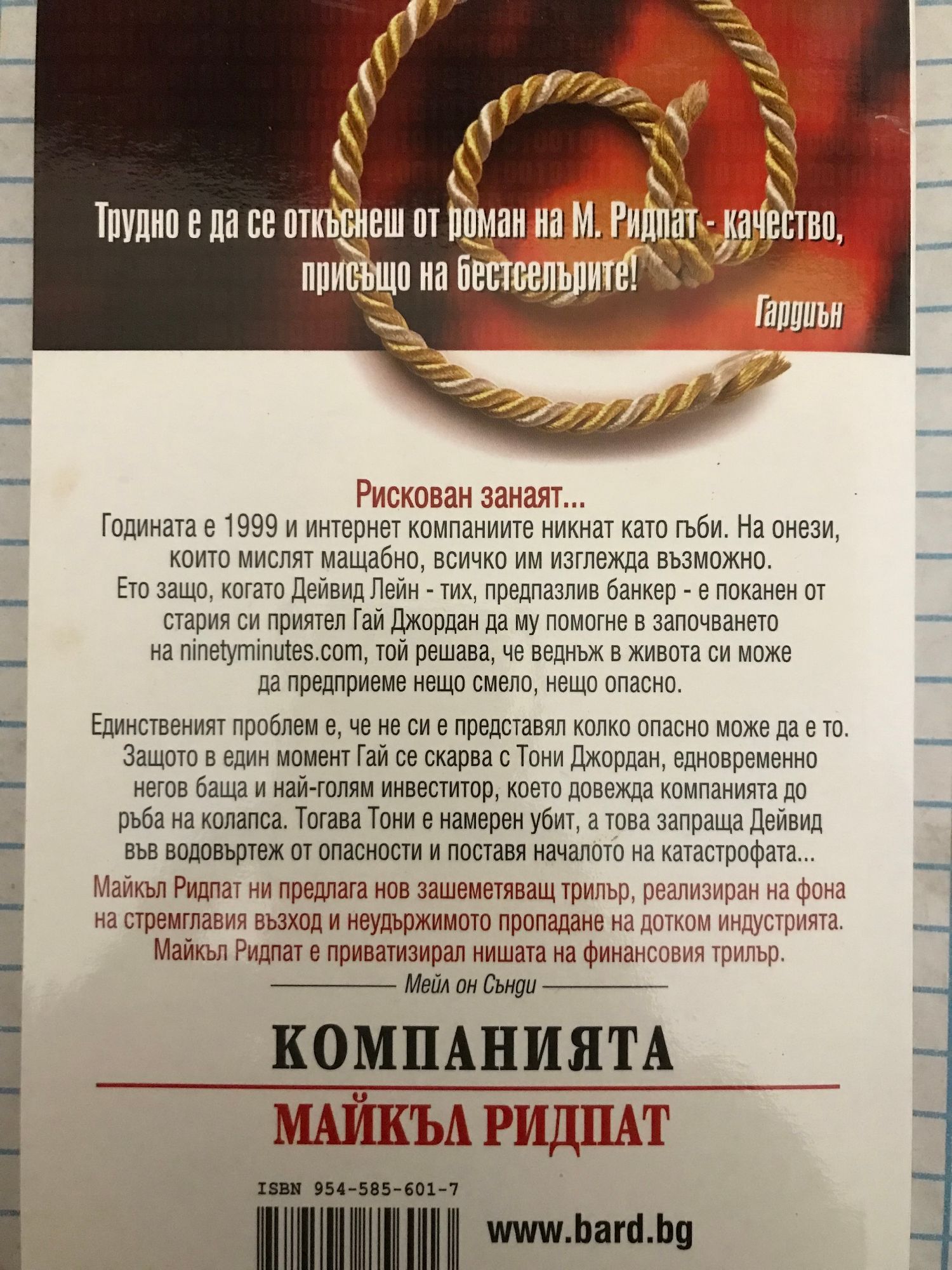 От автора на “Борсови игри” Законодател в света на финансовия трилър! Трудно е да се откъснеш от роман на М. Ридпат - качество, присъщо на бестселърите! Рискован занаят... Годината е 1999 и интернет компаниите никнат като гъби. На онези, които мислят мащабно, всичко им изглежда възможно. Ето защо когато Дейвид Лейн - тих, предпазлив банкер - е поканен от стария си приятел Гай Джордан да му помогне в започването на ninetyminutes.com, той решава, че веднъж в живота си може да предприеме нещо смело, нещо опасно. Единственият проблем е, че не си е представял колко опасно може да е то. Защото в един момент се скарва с Тони Джордан, едновременно негов баща и най-голям инвеститор, което довежда компанията до ръба на колапса. Тогава Тони е намерен убит, а това запраща Дейвид във водовъртеж от опасности и поставя началото на катастрофата... Майкъл Ридпат ни предлага нов зашеметяващ трилър, реализиран на фона на стремглавия възход и неудържимото пропадане на дотком индустрията. Майкъл Ридпат е приватизирал нишата на финансовия трилър.
