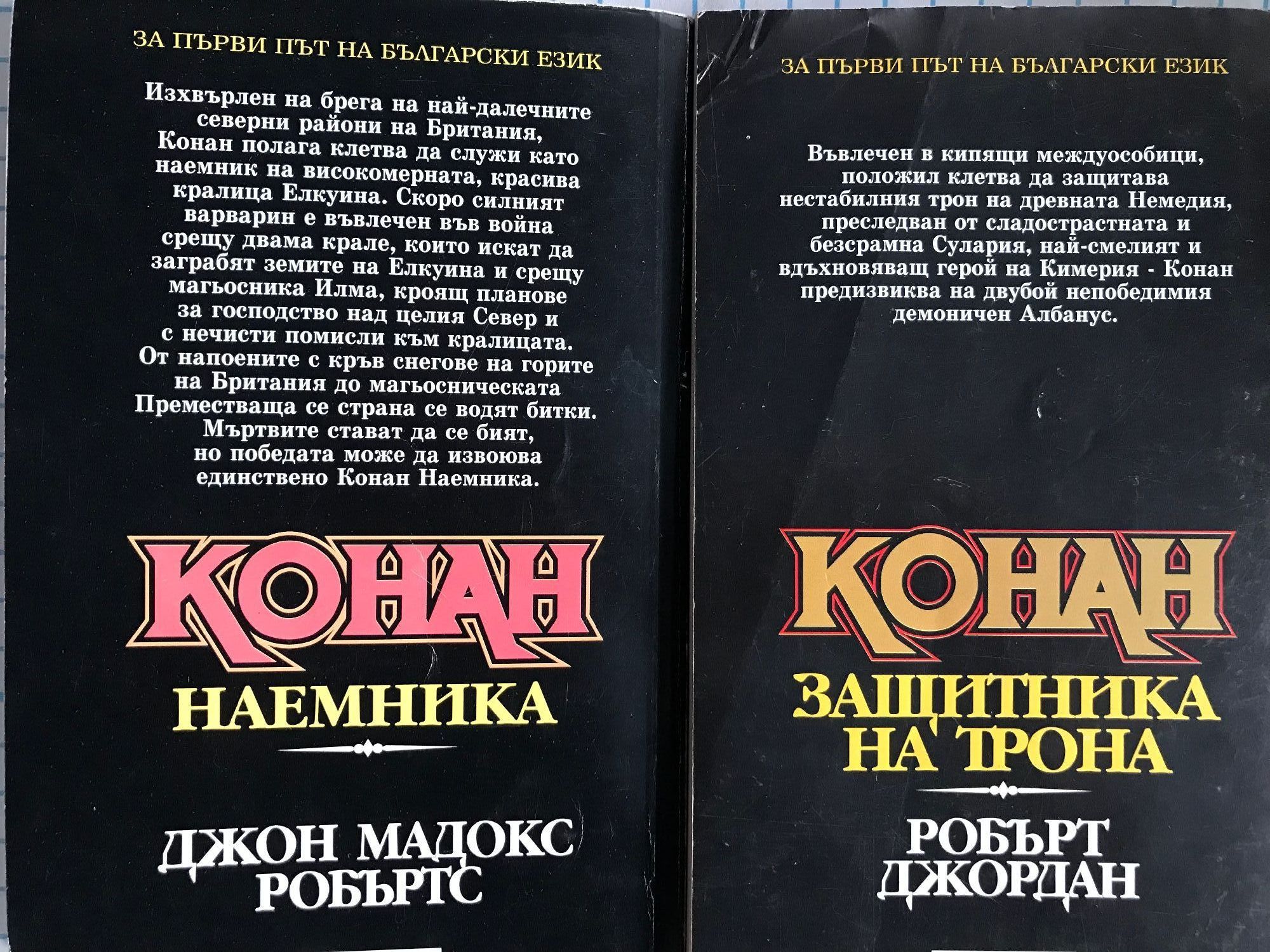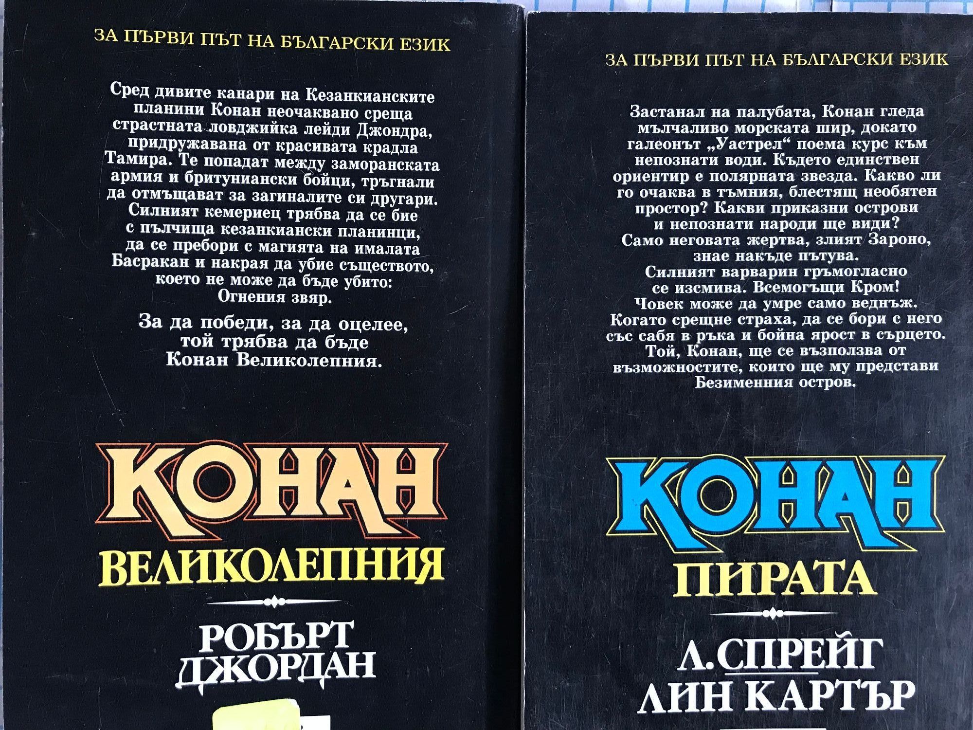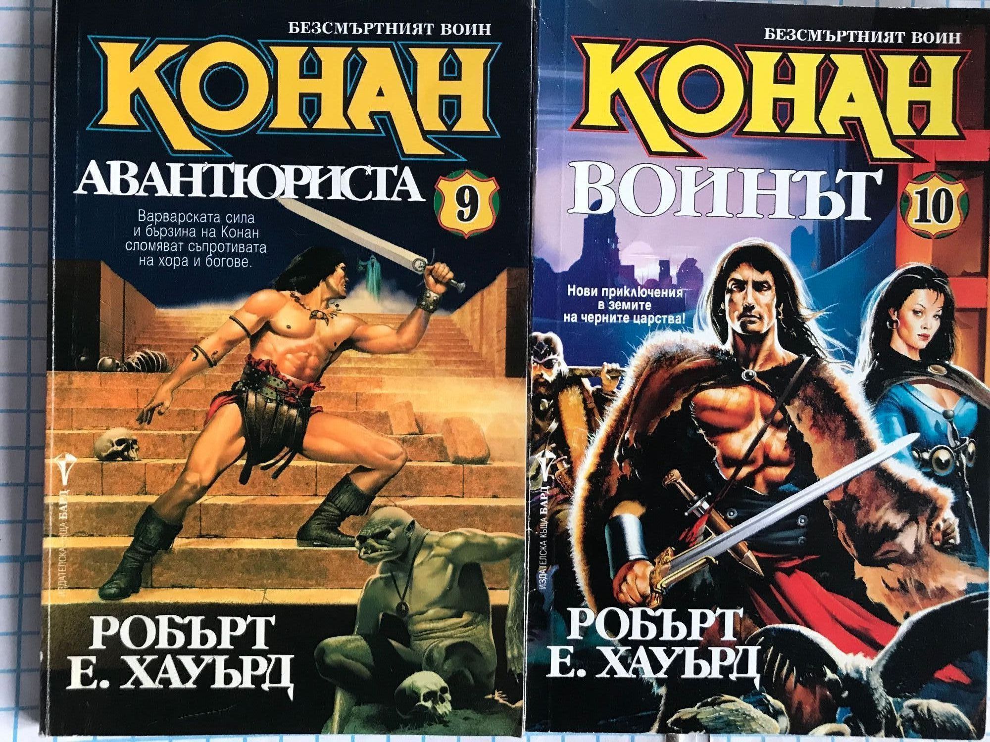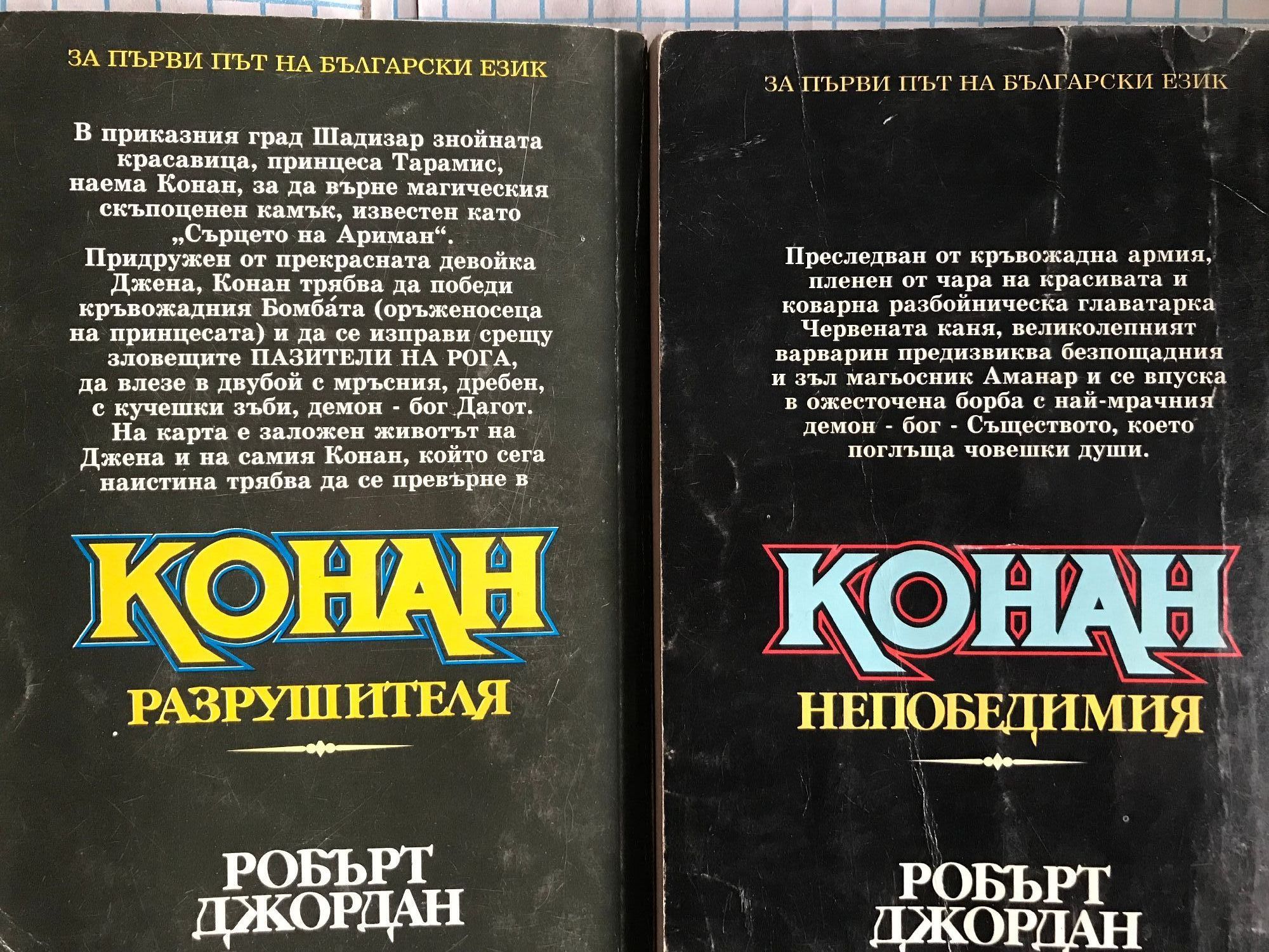 Разрушителя - книга първа от приключенията на Безсмъртния войн. Непобедимия - Най-ожесточената борба на могъщия варварин. Наемника - Война на магьосници! Война на стоманата! Война на два свята! Защитника на Трона - Най-смелото и вдъхновяващо приключение на безсмъртния герой от Кимерия! Съкровището на Питон - Дори и най-голямото съкровище на света няма да свърши работа на един мъртвец. Разбойника - Мъртвите ще се завърнат, за да поискат това, което им е принадлежало. Великолепния - Никой в наши дни не пише за Конан по-добре от Робърт Джордан. Пирата - Най-славния герой от епичната фантастика се бие с демоничните сили на Тот-Амон в едно голямо приключение, търсейки приказно съкровище. Авантюриста - Варварската сила и бързина на Конан сломяват съпротивата на хора и богове. Воинът - Нови приключения в земите на черните царства.