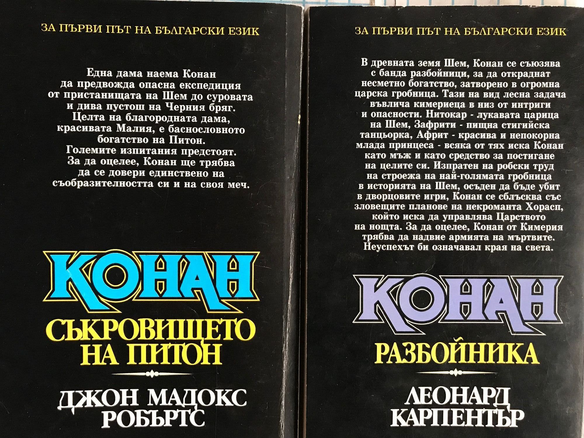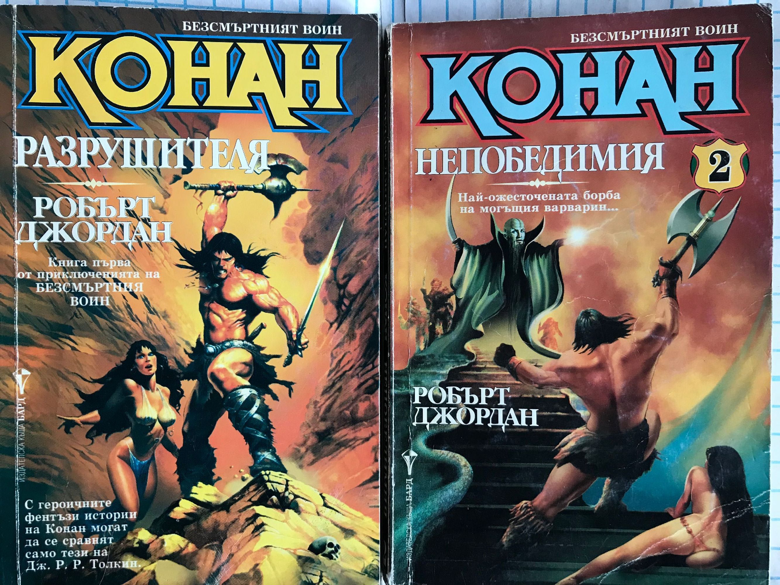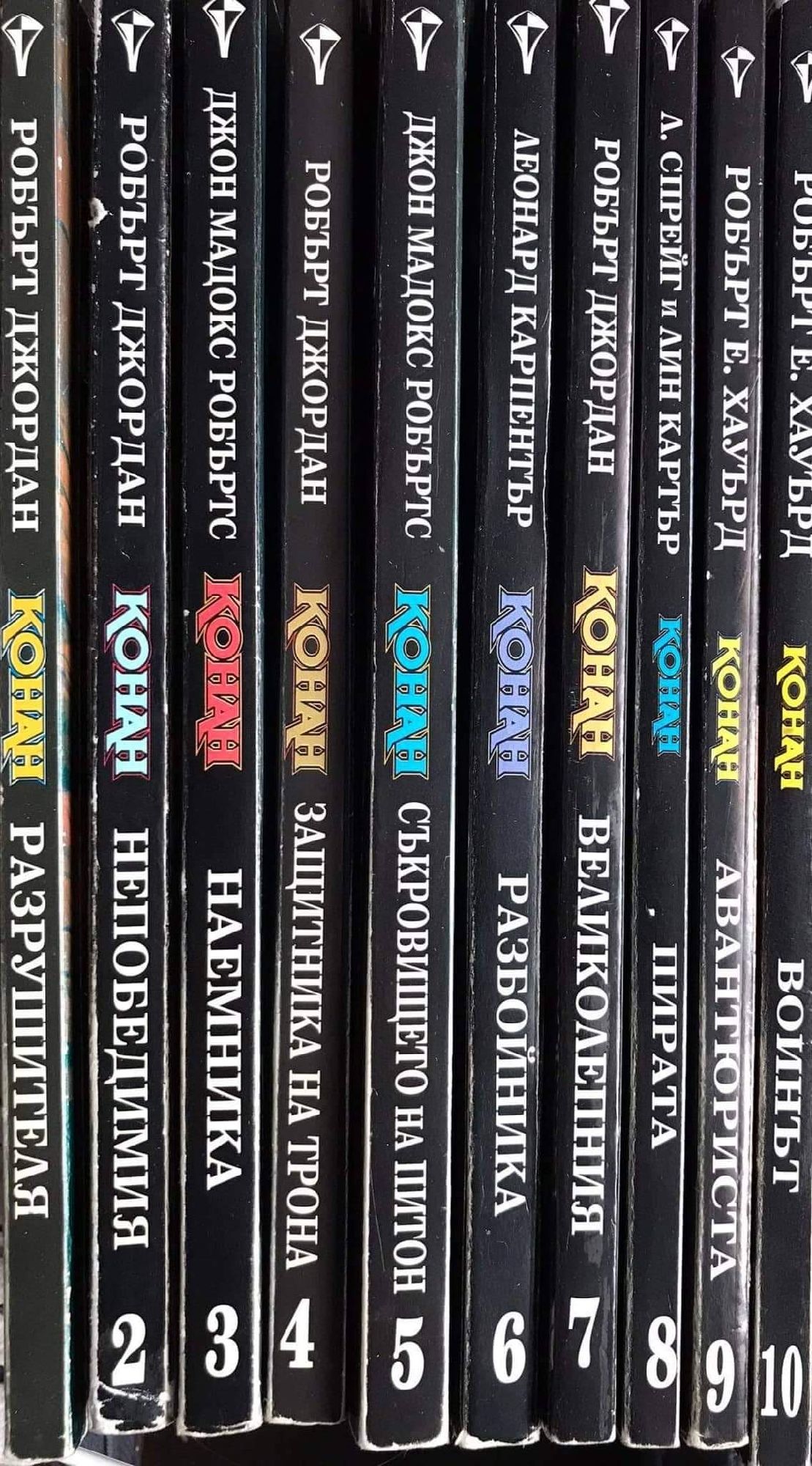 Разрушителя - книга първа от приключенията на Безсмъртния войн. Непобедимия - Най-ожесточената борба на могъщия варварин. Наемника - Война на магьосници! Война на стоманата! Война на два свята! Защитника на Трона - Най-смелото и вдъхновяващо приключение на безсмъртния герой от Кимерия! Съкровището на Питон - Дори и най-голямото съкровище на света няма да свърши работа на един мъртвец. Разбойника - Мъртвите ще се завърнат, за да поискат това, което им е принадлежало. Великолепния - Никой в наши дни не пише за Конан по-добре от Робърт Джордан. Пирата - Най-славния герой от епичната фантастика се бие с демоничните сили на Тот-Амон в едно голямо приключение, търсейки приказно съкровище. Авантюриста - Варварската сила и бързина на Конан сломяват съпротивата на хора и богове. Воинът - Нови приключения в земите на черните царства.