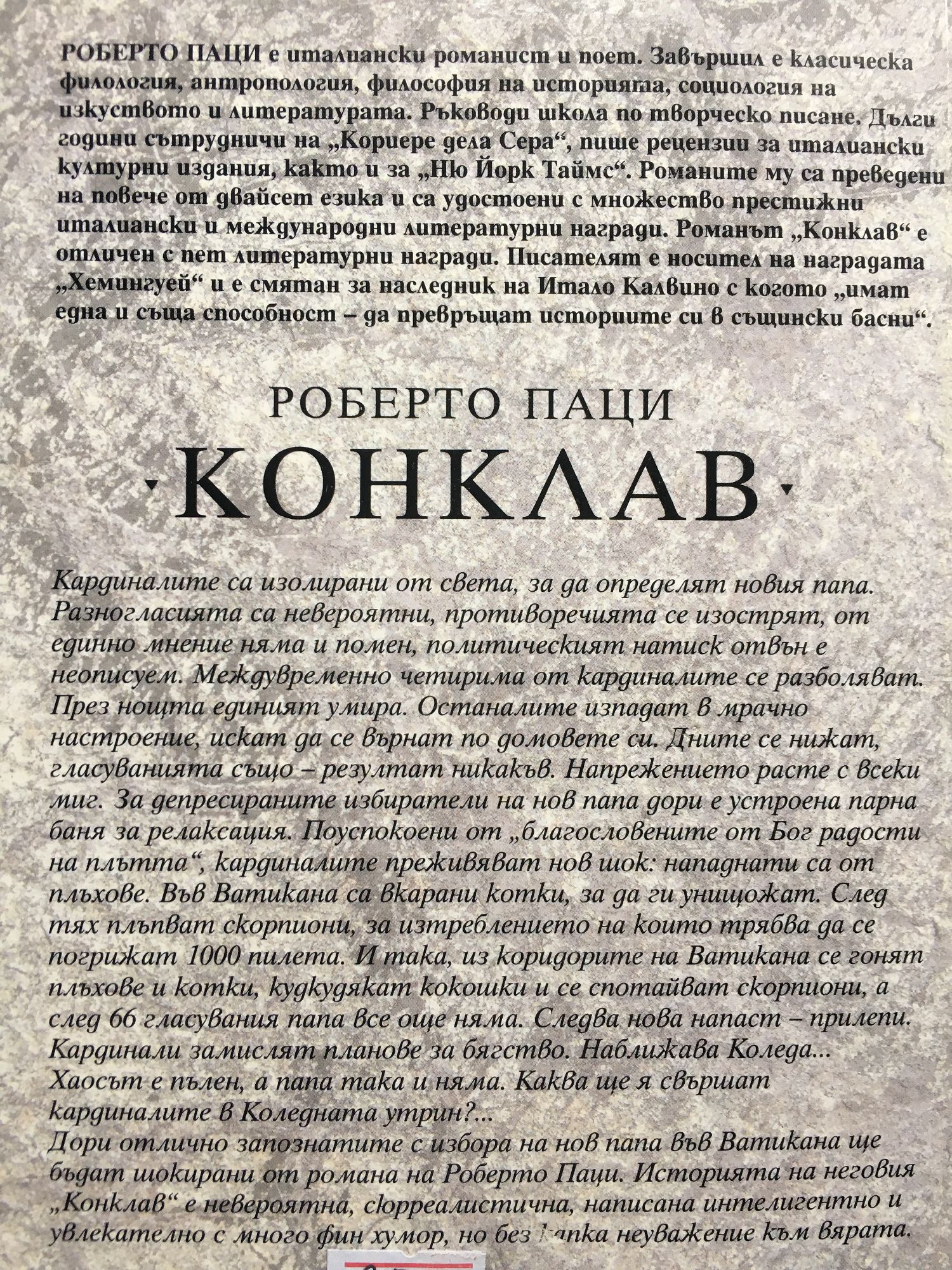 Романът „Конклав” разказва по забавен и остроумен начин историята за това какво се случва във Ватикана, когато кардиналите на католическата църква се събират да изберат своя нов духовен глава. Минават седмица, месеци, но изборната колегия все още не може да достигне до решение. Политическият натиск отвън, интригите между отделните фракции и етноси в Конклава затрудняват избора и вместо кардиналите постепенно да се обединят около едно мнение, те се разединяват все повече. Времето минава, а напрежението в Апостолическия палат расте. И докато светът навън започва да става нетърпелив, вътре във Ватикана се случват нечувани и невиждани събития. Читателя ще попадне във фантастично-символичен свят, където серия от небивалици всячески разсейват духовните лица от техните задължения и подкопават вярата им в Бог. Събитията с всеки изминал ден стават все по-сюрреалистични. В духовния дом вместо мир и благоговение цари паника, ужас и абсурд. Кардиналите преживяват шок, когато Ватикана е нападната от плъхове, прилепи и сови. Из коридорите на светото обиталище се гонят котки, кудкудякат кокошки и се спотайват скорпиони. И на фона на тези ужасяващи картини кардиналите повдигат на дневен ред важни духовни теми. Написана с невероятно чувство за хумор и същевременно без капка неуважение към църквата, книгата повдига редица сериозни въпроси за функционалността на църквата като институция, за адекватността на решенията й и за бъдещето й. Нито за миг авторът не подлага на съмнение съществуването на Бог, но оглежда критично вярата в него, табутата, които хората си изграждат и които вместо да увеличават убиват вярата им. Неочаквана, интелигентна и забавна творба, написана едновременно леко и сериозно.