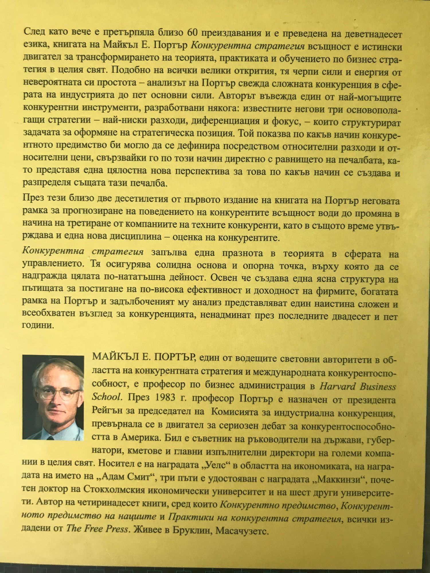 Майкъл Е. Портър, един от водещите световни авторитети в областта на конурентната стратегия и международната конкурентоспособност, е професор по бизнес администрация в Harvard Business School. През 1983г. проф. Портър е назначен от президента Рейгън за председател на Комисията за индустриална конкуренция, превърнала се в двигател за сериозен дебат за конкурантоспособността в Америка. Бил е съветник на ръководители на държави, губернатори, кметове и главни изпълнителни директори на компании в целия свят. Носител е на наградата "Уелс" в областта на икономиката, на наградата на името на "Адам Смит", три пъти е удостояван с награ "Маккинзи", почетен доктор на Стокхолмския икономически университет и на шест други университети. Автор на четиринадесет книги, сред които Конкурентно предимство, Конкурентното предимство на нациите и Практика на конкурентна стратегия, всички издадени то The Free Press. Живее в Бруклин, Масачузетс