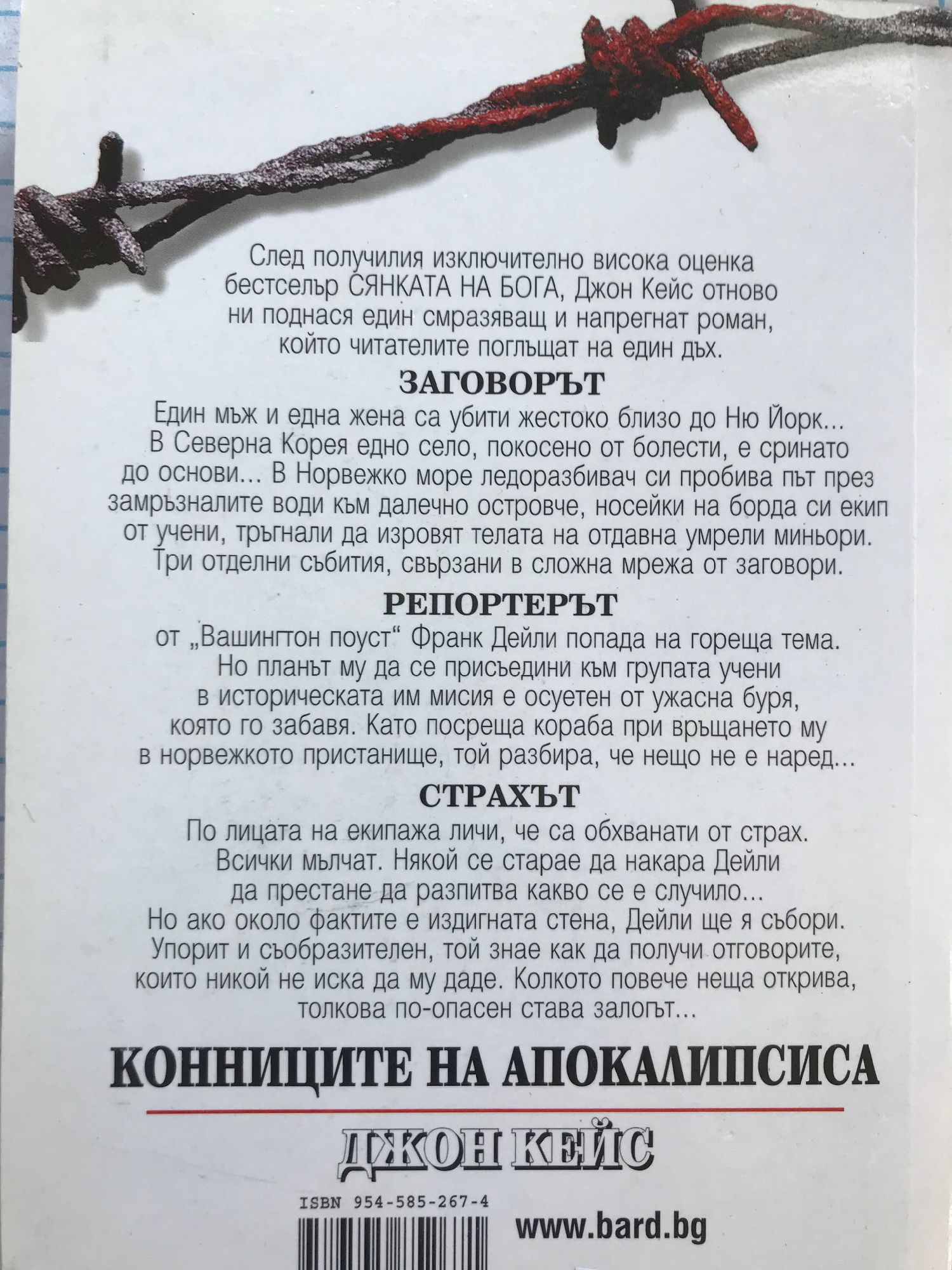 След получилия изключително висока оценка бестселър СЯНКАТА НА БОГА, Джон Кейс отново ни поднася един смразяващ и напрегнат роман, който читателите поглъщат на един дъх. ЗАГОВОРЪТ Един мъж и една жена са убити жестоко близо до Ню Йорк... В Северна Корея едно село, покосено от болести, е сринато до основи... В Норвежко море ледоразбивач си пробива път през замръзналите води към далечно островче, носейки на борда си екип от учени, тръгнали да изровят телата на отдавна умрели миньори. Три отделни събития, свързани в сложна мрежа от заговори. РЕПОРТЕРЪТ от „Вашингтон поуст" Франк Дейли попада на гореща тема. Но планът му да се присъедини към групата учени в историческата им мисия е осуетен от ужасна буря, която го забавя. Като посреща кораба при връщането му в норвежкото пристанище, той разбира, че нещо не е наред... СТРАХЪТ По лицата на екипажа личи, че са обхванати от страх. Всички мълчат. Някой се старае да накара Дейли да престане да разпитва какво се е случило... Но ако около фактите е издигната стена, Дейли ще я събори. Упорит и съобразителен, той знае как да получи отговорите, които никой не иска да му даде. Колкото повече неща открива, толкова по-опасен става залогът...