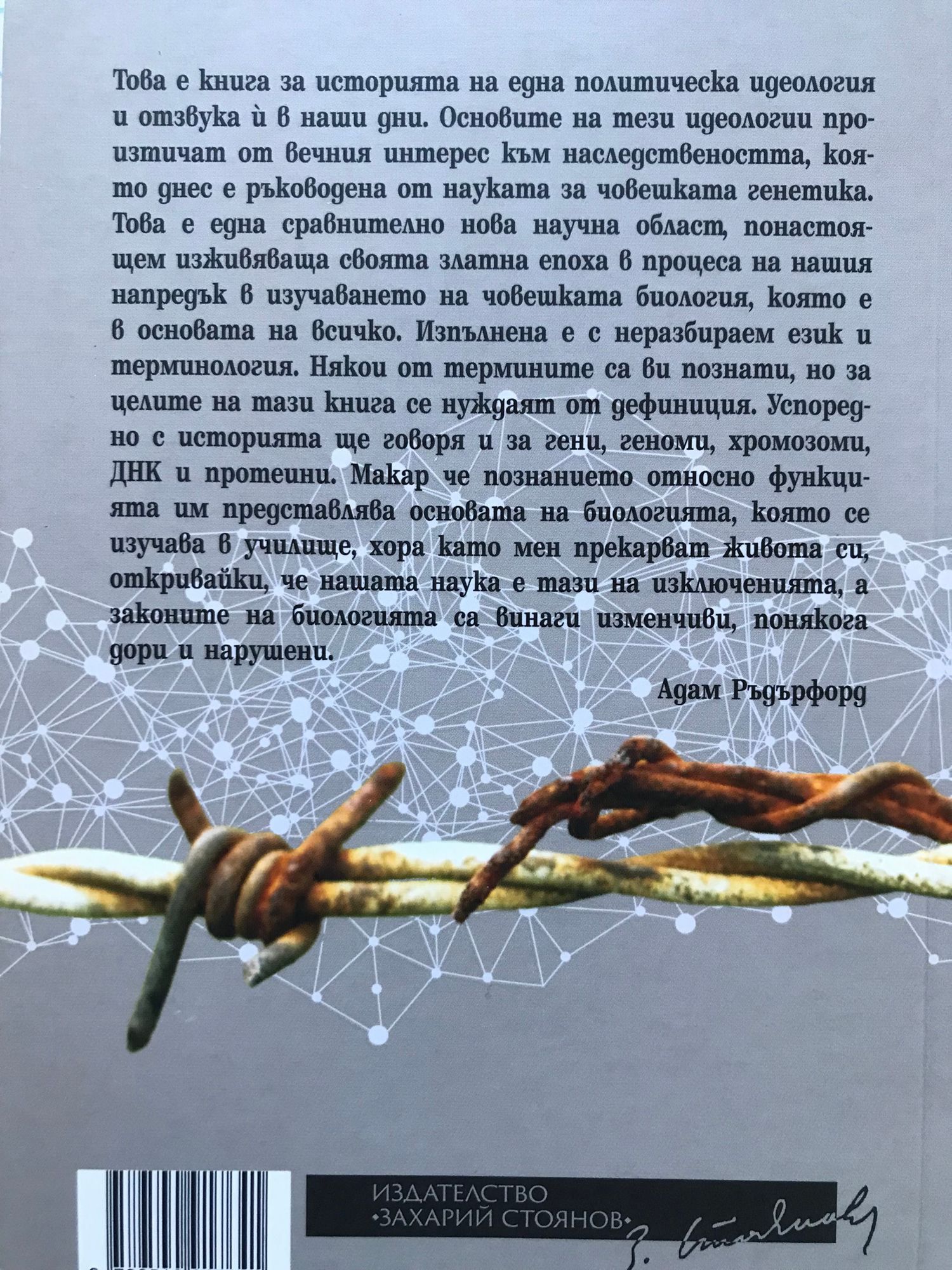 Това е книга за историята на една политическа идеология и отзвука й в наши дни. Основите на тези идеологии произтичат от вечния интерес към наследствеността, която днес е ръководена от науката за човешката генетика. Това е една сравнително нова научна област, понастоящем изживяваща своята златна епоха в процеса на нашия напредък в изучаването на човешката биология, която е в основата на всичко. Изпълнена е с неразбираем език и терминология. Някои от термините са ви познати, но за целите на тази книга се нуждаят от дефиниция. Успоредно с историята ще говоря и за гени, геноми, хромозоми, ДНК и протеини. Макар че познанието относно функцията им представлява основата на биологията, която се изучава в училище, хора като мен прекарват живота си, откривайки, че нашата наука е тази на изключенията, а законите на биологията са винаги изменчиви, понякога дори и нарушени. (Адам Ръдърфорд)