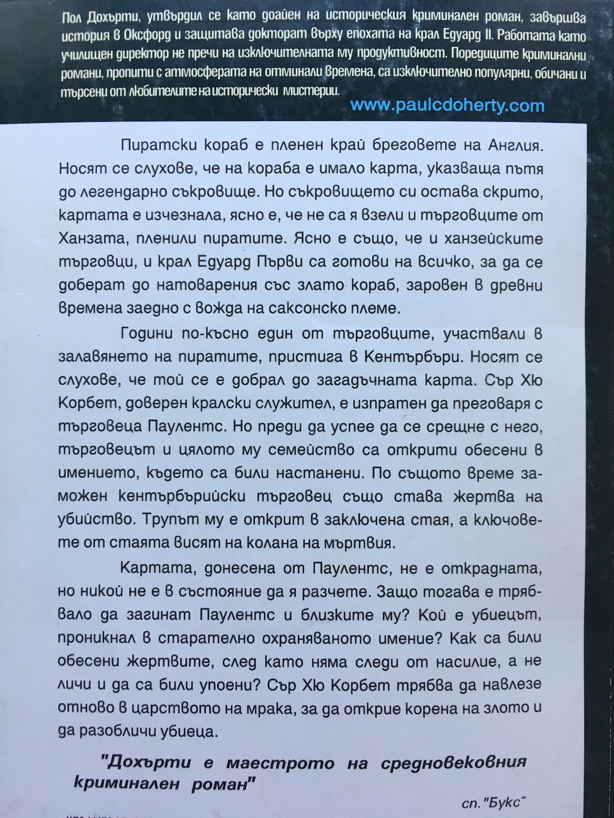 Пиратски кораб е пленен край бреговете на Англия. Носят се слухове, че на кораба е имало карта, указваща пътя до легендарно съкровище. Но съкровището си остава скрито, картата е изчезнала, ясно е, че не са я взели и търговците от Ханзата, пленили някога пиратите. Ясно е също, че и ханзейските търговци, и крал Едуард Първи са готови на всичко, за да се доберат до натоварения със злато кораб, заровен в древни времена заедно с вожда на саксонско племе. Години по-късно един от търговците, участвали в залавянето на пиратите, пристига в Кентърбъри. Носят се слухове, че той се е добрал до загадъчната карта. Сър Хю Корбет, доверен кралски служител, е изпратен да преговаря с търговеца Паулентс. Но преди да успее да се срещне с него, търговецът и цялото му семейство са открити обесени в имението, където са били настанени. По същото време заможен кентърбърийски търговец също става жертва на убийство. Трупът му е открит в заключена стая, а ключовете от стаята висят на колана на мъртвия. Картата, донесена от Паулентс, не е открадната, но никой не е в състояние да я разчете. Защо тогава е трябвало да загинат Паулентс и близките му? Кой е убиецът, проникнал в старателно охраняваното имение? Как са били обесени жертвите, след като няма следи от насилие, а не личи и да са били упоени? Сър Хю Корбет трябва да навлезе отново в царството на мрака, за да открие корена на злото и да разобличи убиеца.