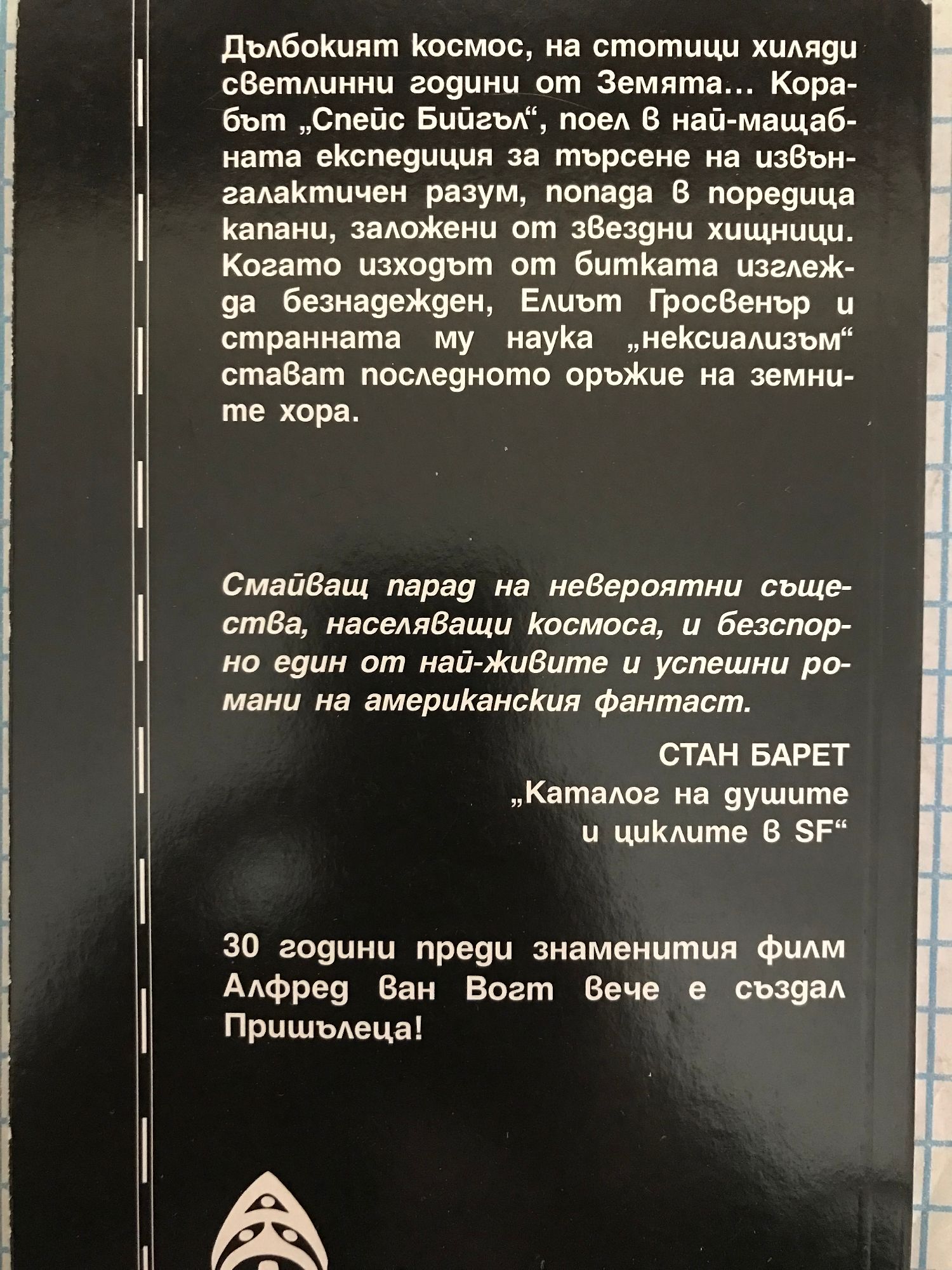 Дълбокият космос, на стотици хиляди светлинни години от Земята… Корабът „Спейс Бийгъл“, поел в най-мащабната експедиция за търсене на извънгалактически разум, попада в поредица капани, заложени от звездни хищници. Когато изходът от битката изглежда безнадежден, Елиът Гросвенър и странната му наука „нексиализъм“ стават последното оръжие на земните хора. Смайващ парад на невероятни същества, населяващи космоса, и безспорно един от най-живите и успешни романи на американския фантаст. Стан Барет „Каталог на душите и циклите в SF“ Трийсет години преди знаменития филм Алфред ван Вогт вече е създал пришълеца!