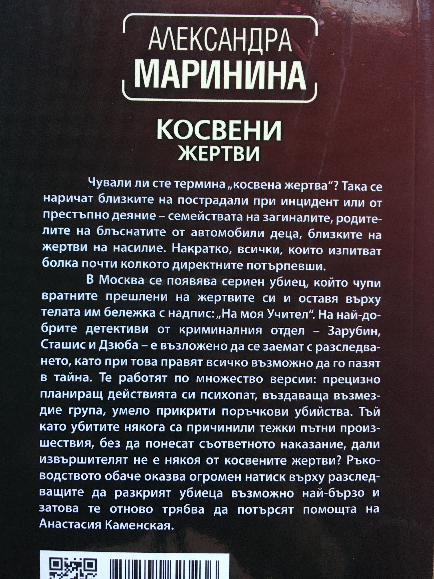 Чували ли сте термина „косвена жертва“? Така се наричат близките на пострадали при инцидент или от престъпно деяние – семействата на загиналите, родителите на блъснатите от автомобили деца, близките на жертви на насилие. Накратко, всички, които изпитват болка почти колкото директните потърпевши. В Mосква се появява сериен убиец, който чупи вратните прешлени на жертвите си и оставя върху телата им бележка с надпис: „На моя Учител“. На най-добрите детективи от криминалния отдел – Зарубин, Сташис и Дзюба – е възложено да се заемат с разследването, като при това правят всичко възможно да го пазят в тайна. Те работят по множество версии: прецизно планиращ действията си психопат, въздаваща възмездие група, умело прикрити поръчкови убийства. Тъй като убитите някога са причинили тежки пътни произшествия, без да понесат съответното наказание, дали извършителят не е някоя от косвените жертви? Ръководството обаче оказва огромен натиск върху разследващите да разкрият убиеца възможно най-бързо и затова те отново трябва да потърсят помощта на Анастасия Каменская.
