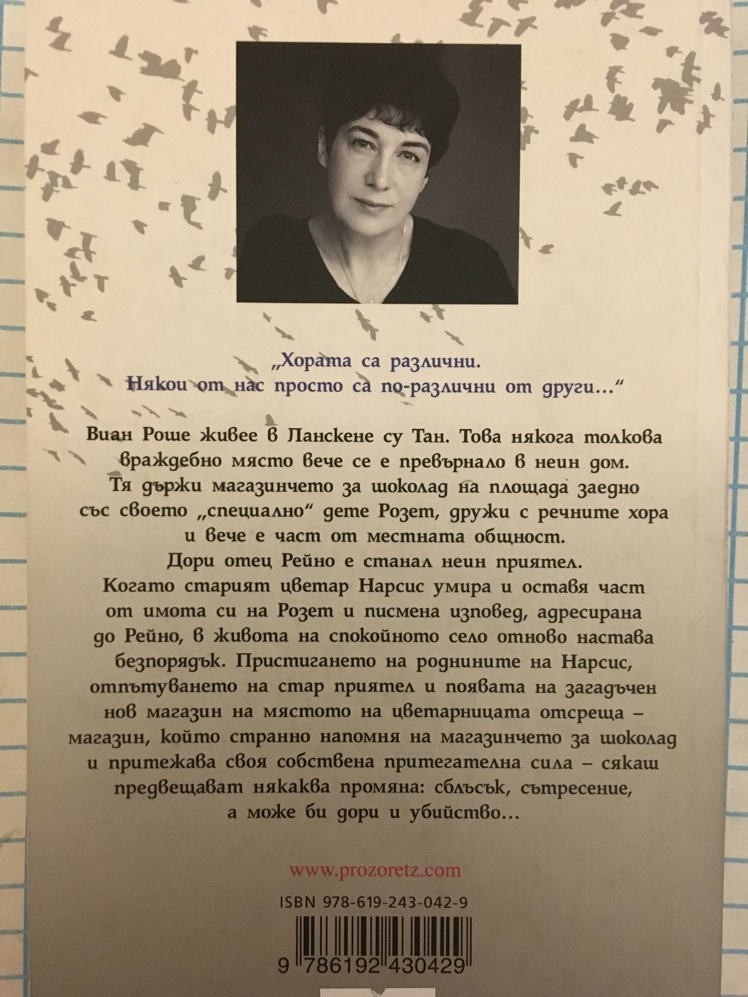 Хората са различни. Някои от нас просто са по-различни от други..." Виан Роше живее в Ланскене су Тан. Това някога толкова враждебно място вече се е превърнало в неин дом. Тя държи магазинчето за шоколад на площада заедно със своето „специално" дете Розет, дружи с речните хора и вече е част от местната общност. Дори отец Рейно е станал неин приятел. Когато старият цветар Нарсис умира и оставя част от имота си на Розет и писмена изповед, адресирана до Рейно, в живота на спокойното село отново настава безпорядък. Пристигането на роднините на Нарсис, отпътуването на стар приятел и появата на загадъчен нов магазин на мястото на цветарницата отсреща – магазин, който странно напомня на магазинчето за шоколад и притежава своя собствена притегателна сила – сякаш предвещават някаква промяна: сблъсък, сътресение, а може би дори и убийство...